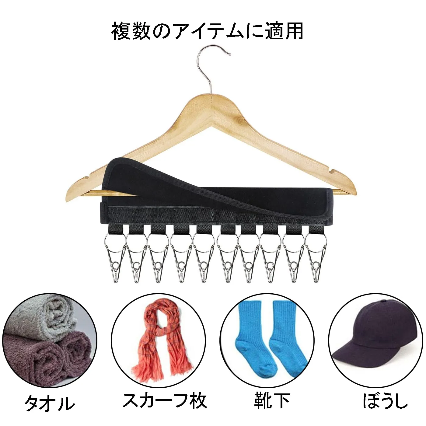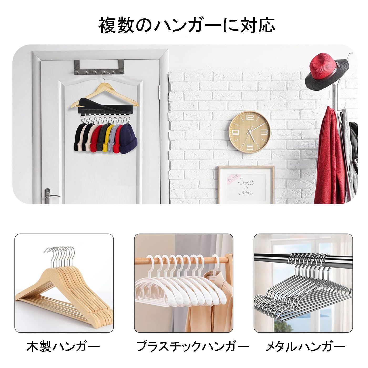【きのうせっけい】:帽子収納器ごとに10個のステンレス取り外し可能クリップを備え、粘着性フックや帽子収納器に直接貼り付けることができ、瞬時に普通のハンガーを帽子専用ハンガーに変えることができる。