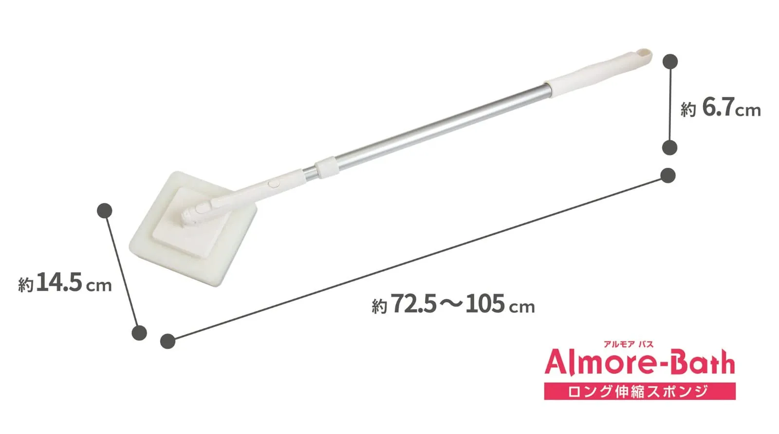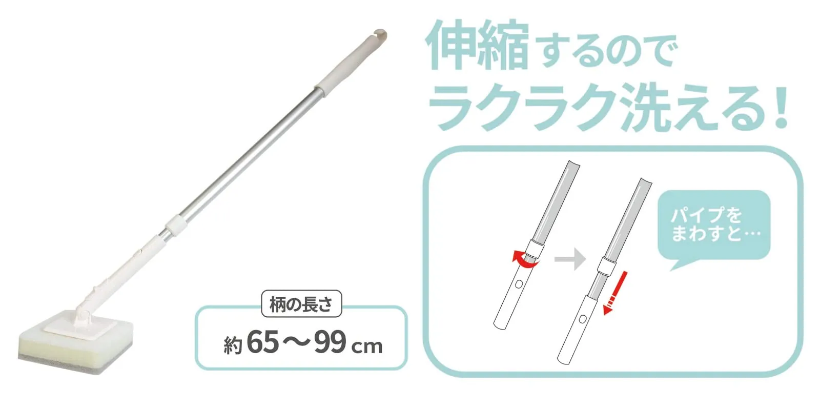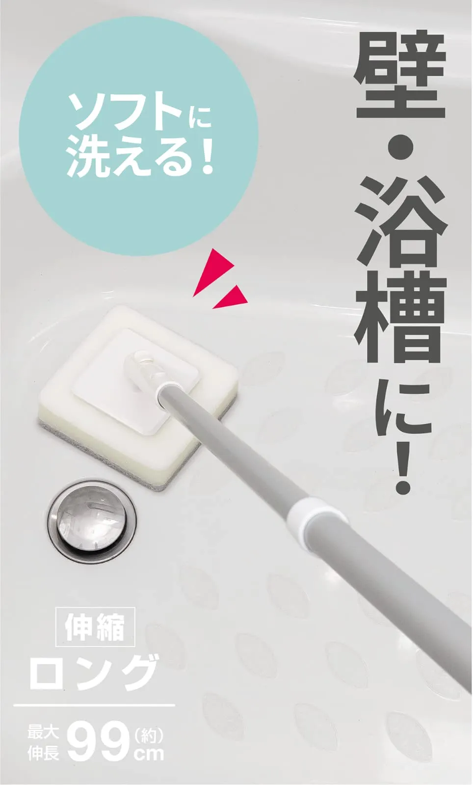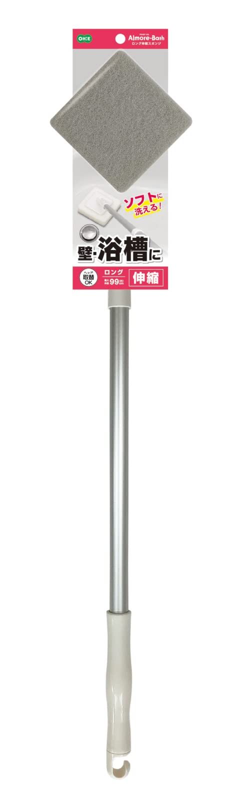 ・柄は伸縮できますので、柄を伸ばせば高いところや浴槽の底もラクに洗えます。(約65~99cm)