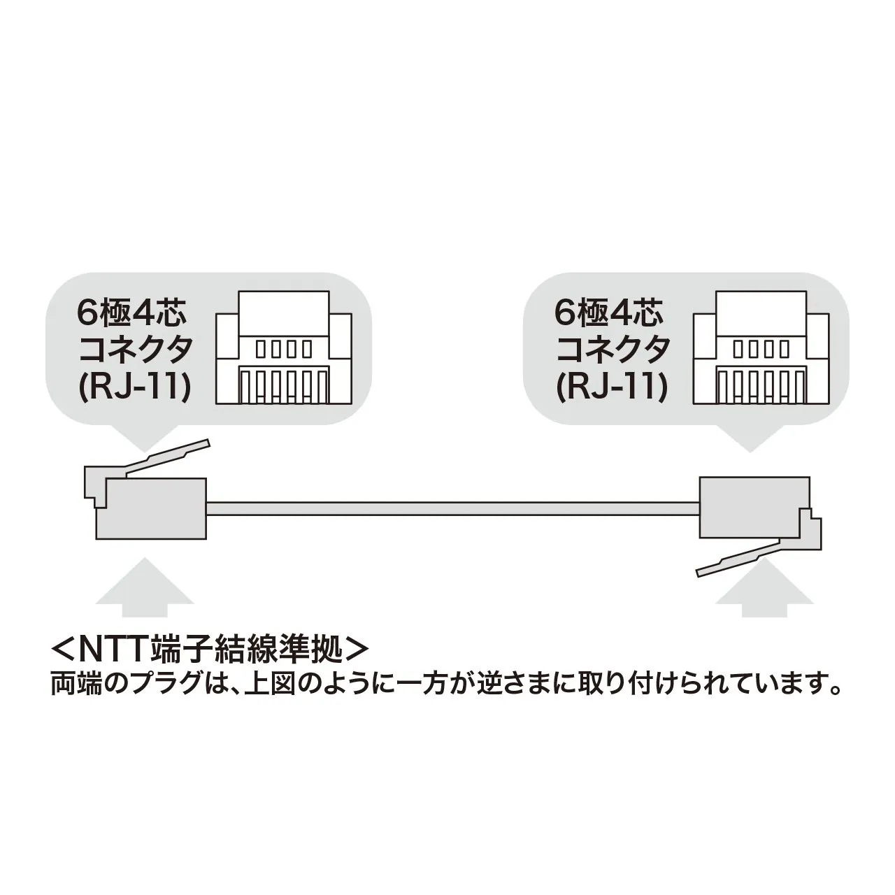 【端子】:NTT端子結線準拠。(両端のプラグは、一方が逆さまに取り付けられています。)※但し、NTT端子結線準拠でない6極4芯の機器にはご使用になれません。
