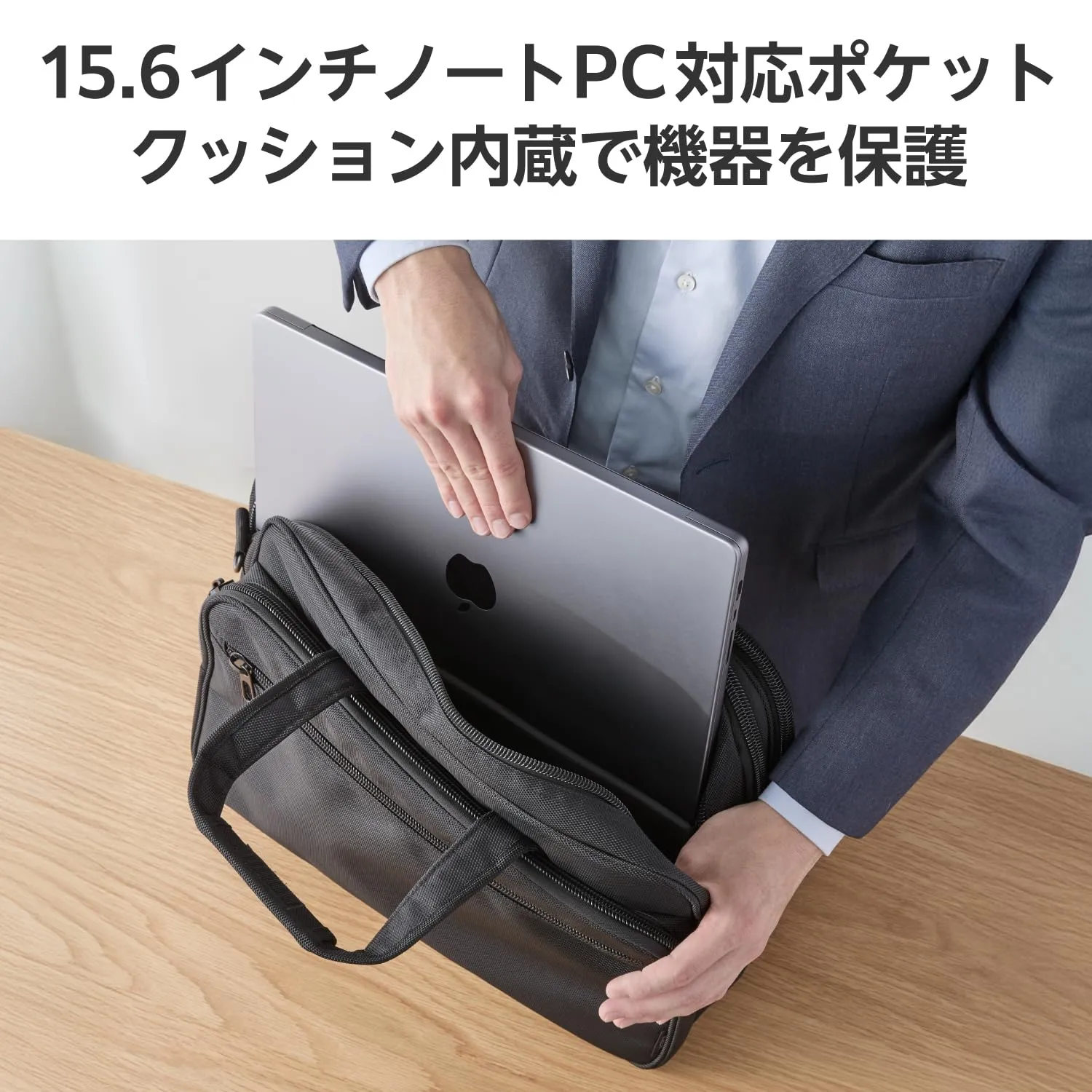 ■15.6インチまでのノートパソコンが収納できる、クッション内蔵の内装ポケットを備えています。移動中の揺れによる中の荷物との衝突を防ぎます。