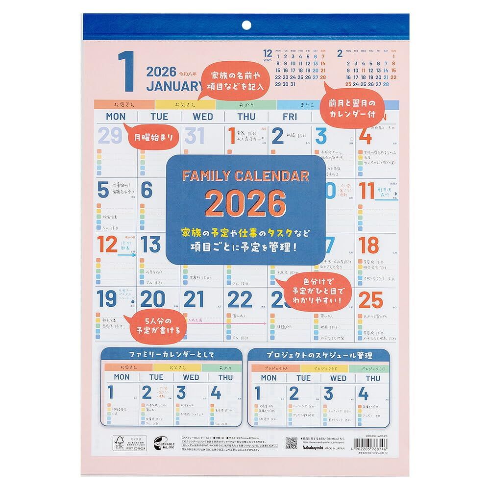 ナカバヤシの環境にやさしいカレンダー。★壁掛けカレンダーはリング金具を使用せずリサイクル可能な仕様になっております。※カレンダーを掛ける時や、めくる時など、紙で指先などを傷つけないようにご注意ください。※国民の祝日および公休日は、法律の改正により変更になることがあります。<壁掛けカレンダー ファミリー(ブロック)タイプ>