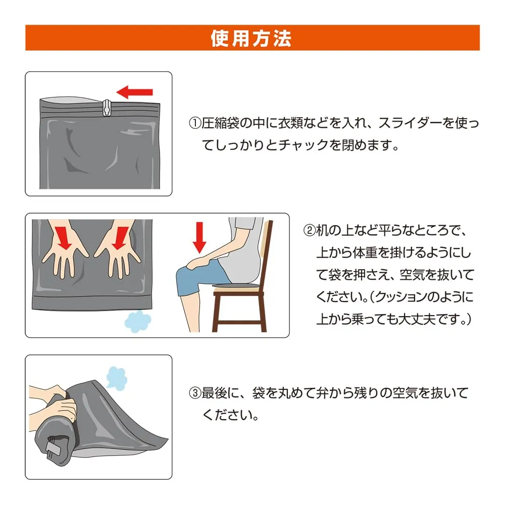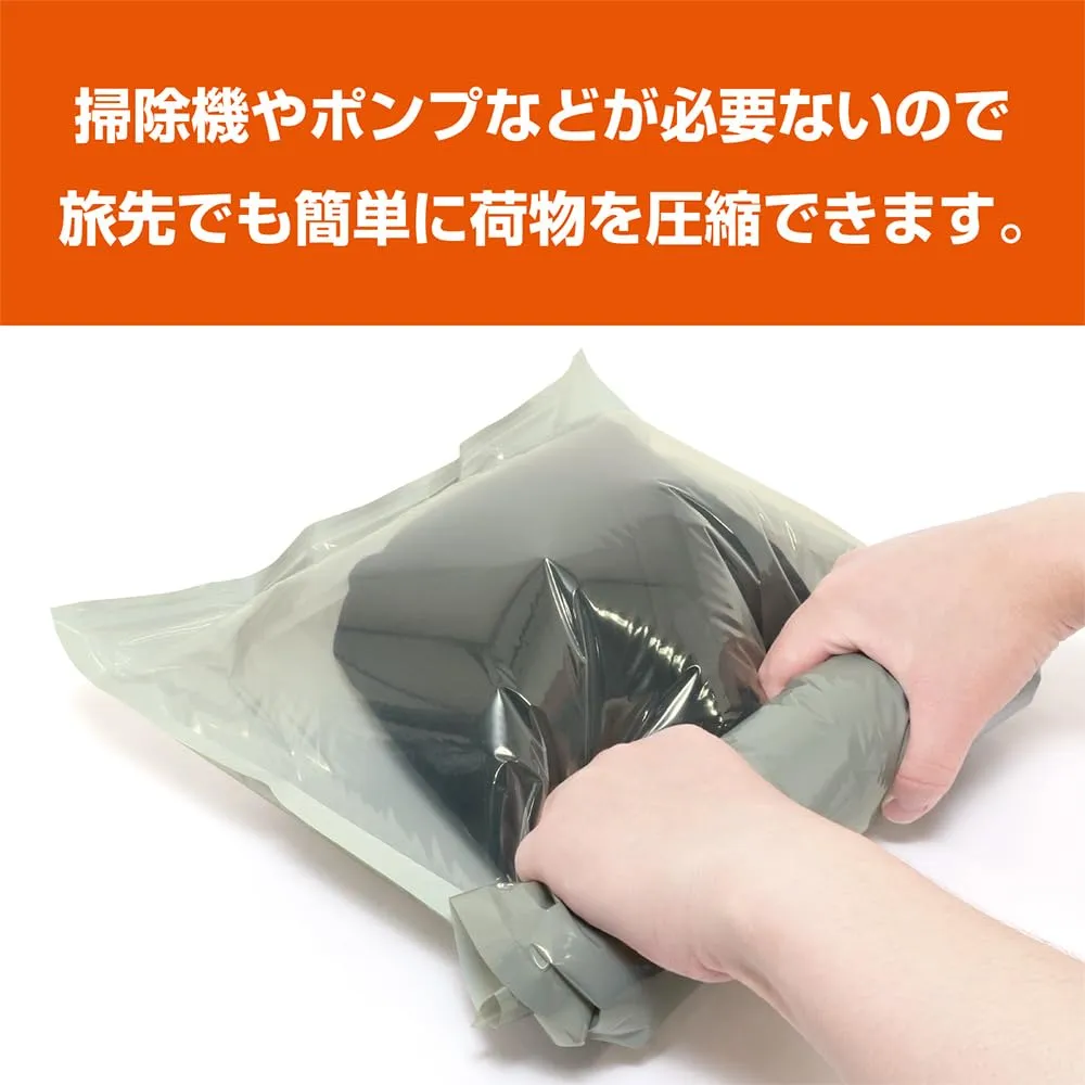 少しの力で衣類をコンパクトに圧縮。 上から押さえたり、クッションのように座っても空気を抜けます。掃除機やポンプなどが必要ないので旅先でも簡単に荷物を圧縮できます。