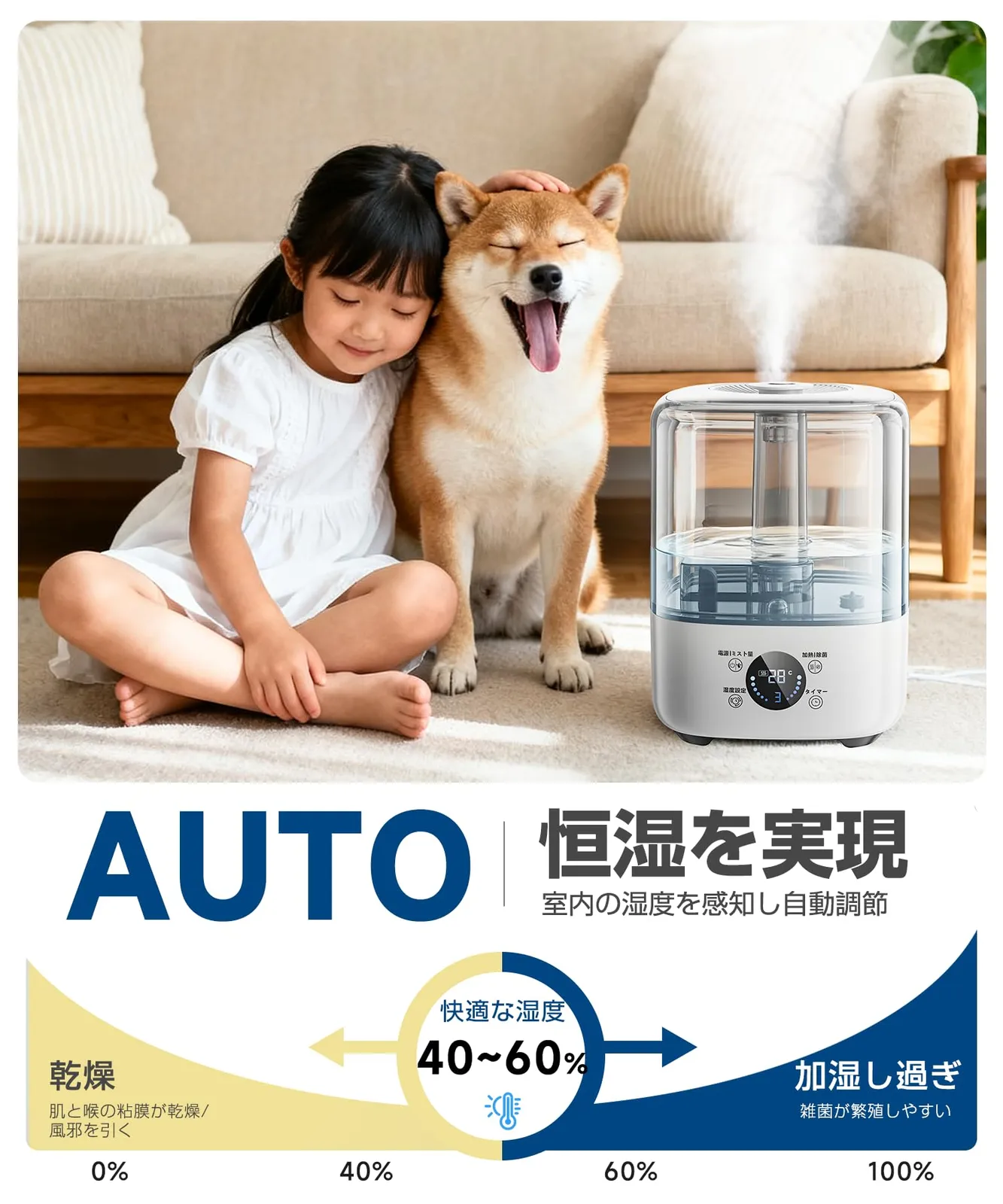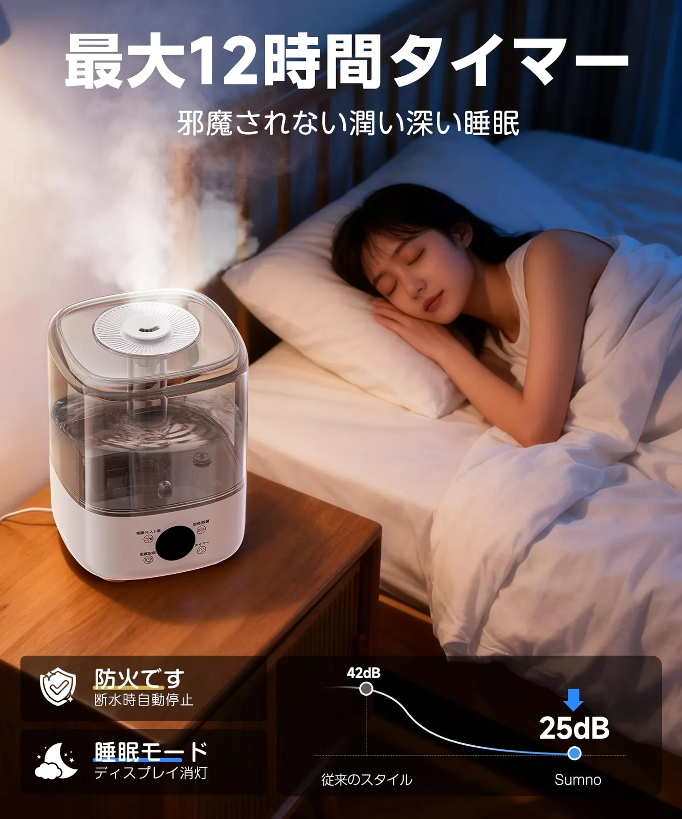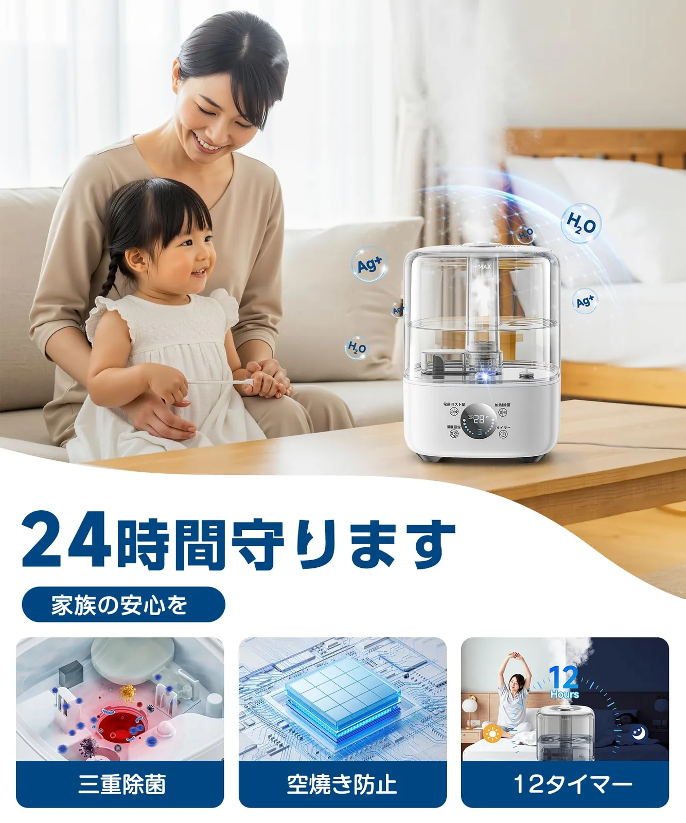 【12時間タイマー&全方位安全設計で、子育て家庭も安心の日本品質】1時間単位で最大12時間までのタイマー設定が可能!消し忘れ防止と電気代の節約に役立ちます。水がなくなると自動で電源OFFになる「空焚き防止機能」 搭載で、安心してお使いいただけます。PSE認証を取得した日本国内対応の安全設計で、お子様やペットがいるご家庭でも安心。万が一のときも日本語対応のとサポートが付いているので、初めての方でもご安心ください!??1.水量を智能検知。少なくなると音声で通知し自動OFF(ビープ音が5回鳴ります)。水を補充するだけで再開でき、機械の損傷や安全面でもご安心ください。2.なお、柔らかい床やカーペット、あるいは平らでない場所でのご使用はお控えください。3.ご利用時間の目安をお守りください。過加湿による床や家具の濡れを防ぎ、快適な環境をお守りします。