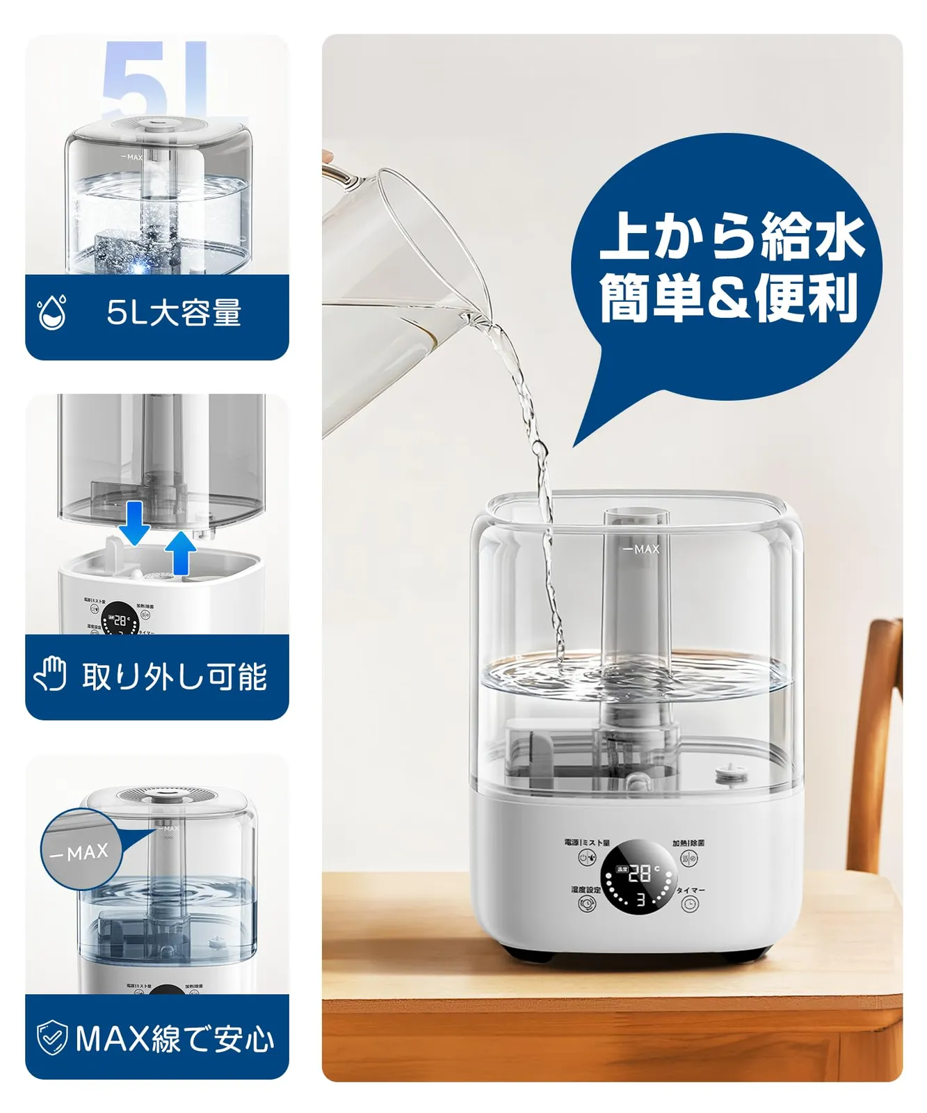【5L超大容量&驚異の最大25時間連続加湿!面倒な給水とはもうサヨナラ】大容量5Lタンクを採用し、弱モード時は最大25時間、強モードでも15時間の連続稼働を実現!就寝中やお出かけ中も水切れの心配がありません。2WAY給水方式(上から注ぐだけ or タンク取り外し) で、どんなシーンでも楽々給水。透明デザインの水タンクで残量が一目瞭然、うっかり水切れを防ぎます。※ご使用時は必ず平坦な場所に設置し、電源OFF状態で清潔な水をMAXラインまで注水ください。上から直接給水できる簡単設計で、こぼれる心配がありません。