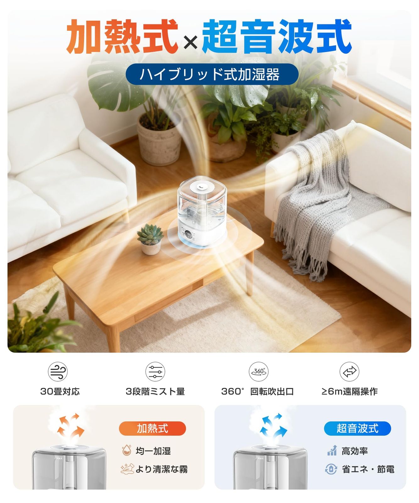 【新登場!ハイブリッド加熱×多重除菌で99%の菌を徹底撃退!】従来の加湿器を超えた次世代モデル!超音波式の省電力性と加熱式の強力除菌力を融合させ、温かいミストと冷たいミストの両方をワンタッチで切り替え可能!さらに、ライト照射+高頻振動霧化 +加熱除菌放出の多重除菌システムを搭載。99.9%の雑菌を除去し、お部屋中に清潔で安心なミストをお届けします。加熱モードでは約50℃の温風ミストが空気中のウイルスやバクテリアを退治し、冬の風邪予防やインフルエンザ対策にも抜群の効果を発揮!※加熱モードをオンにしてから約5分後に温かいミストが出始め、約20分後に最高温度に達します。所要時間は周囲温度によって影響されます。加熱モードオフで省エネ運転も可能。
