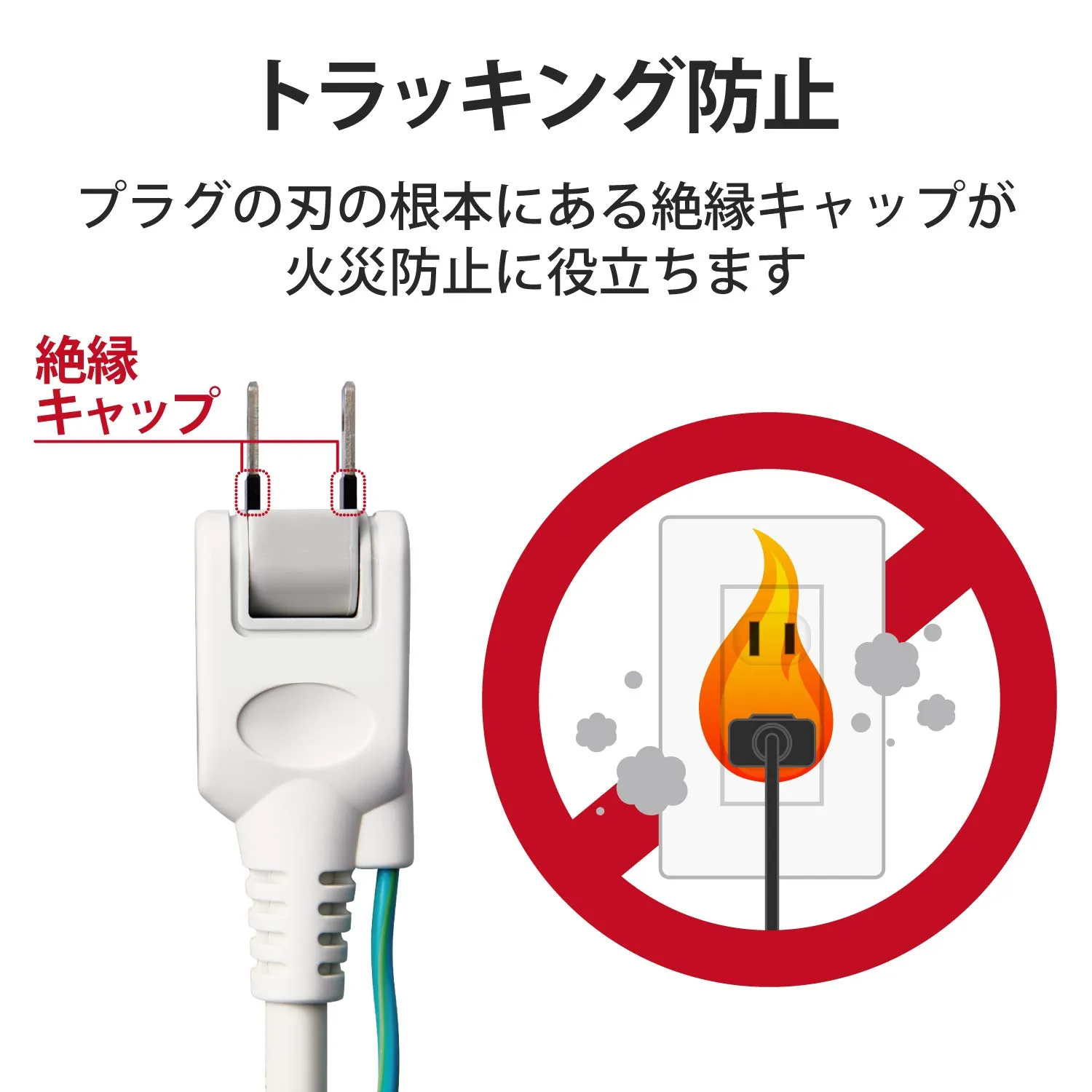 プラグの刃の根本に絶縁キャップが付いており、トラッキング現象による火災の防止に役立ちます。