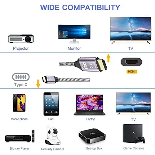 USB-C xHDMIケーブルは8K @ 30Hz、4K @ 60Hzをサポートします。USB4USB-CType-C対応のデスクトップとラップトップでHDMIディスプレイに接続し、8K / 4Kの高解像度でホームシアターをお楽しみください。