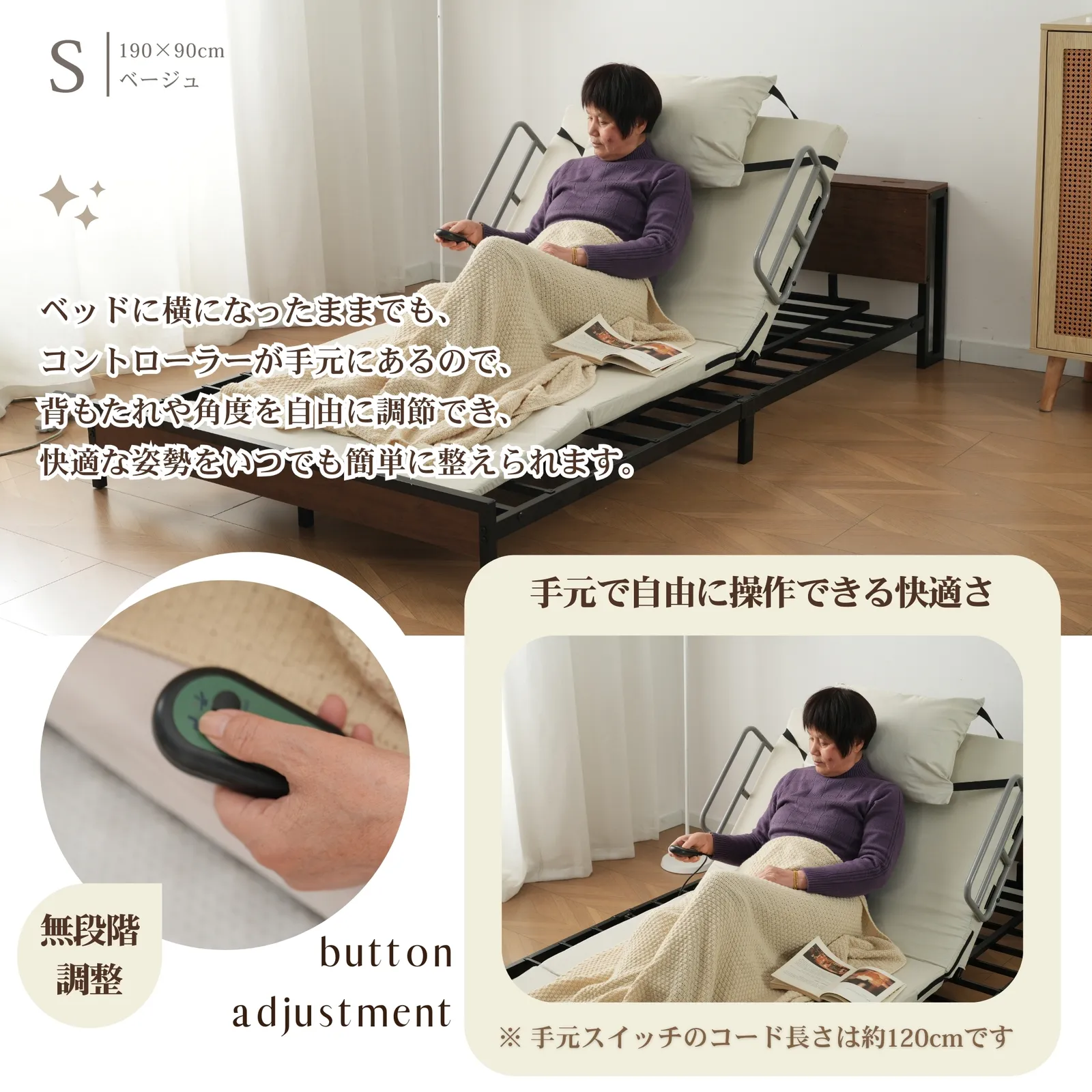 【手元で自由に操作できる快適さ】ベッドに横になったままでも、コントローラーが手元にあるので、背もたれや角度を自由に調節でき、快適な姿勢をいつでも簡単に整えられます。※ 手元スイッチのコード長さは約120cmです。