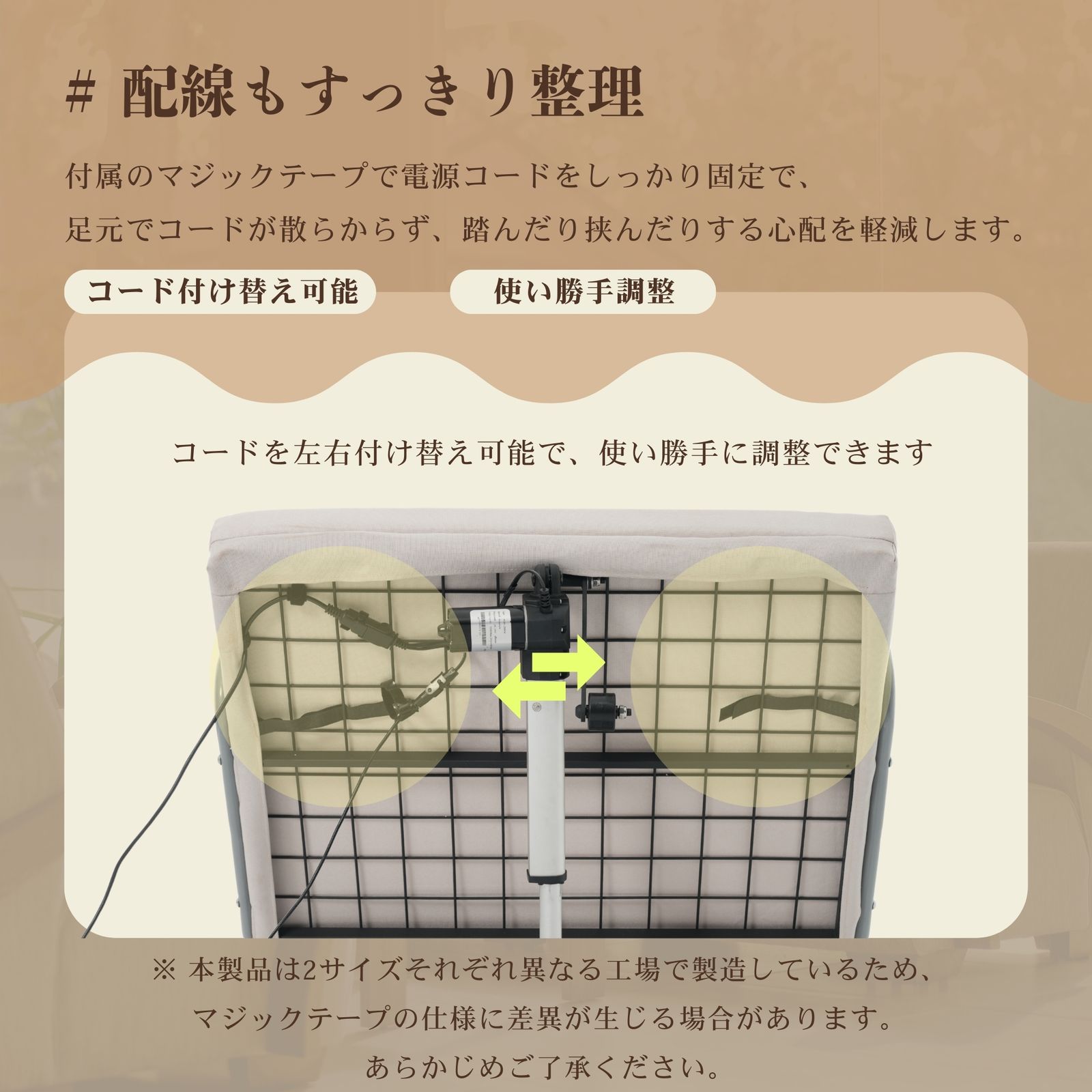 【配線もすっきり整理】付属のマジックテープで電源コードをしっかり固定で、足元でコードが散らからず、踏んだり挟んだりする心配を軽減します。さらに、コンセントの位置に合わせてコードを左右どちらにも付け替え可能で、使い勝手に合わせて調整できます。※ 本製品は2サイズそれぞれ異なる工場で製造しているため、マジックテープの仕様に差異が生じる場合があります。あらかじめご了承ください。”