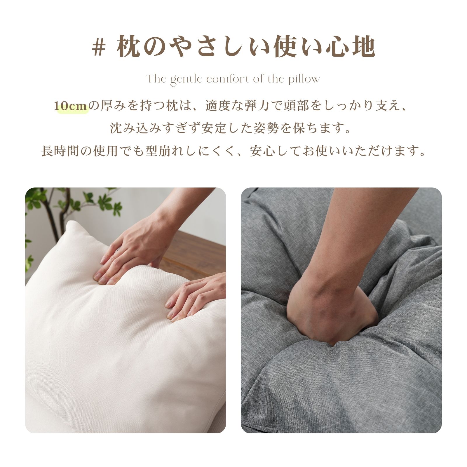 【枕のやさしい使い心地】10cmの厚みを持つ枕は、適度な弾力で頭部をしっかり支え、沈み込みすぎず安定した姿勢を保ちます。長時間の使用でも型崩れしにくく、安心してお使いいただけます。