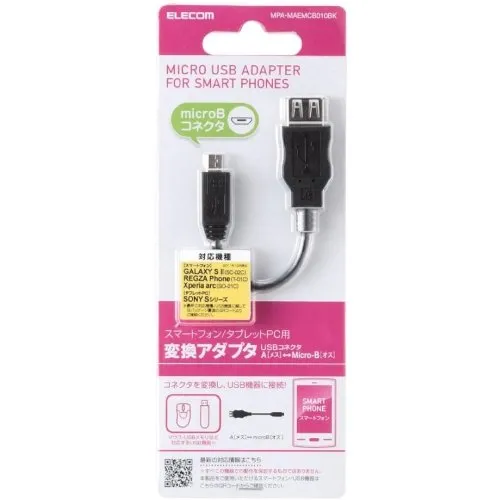 microUSB端子を持ち、USBホスト機能に対応するスマートフォン/タブレットPCに、マウス・USBメモリなどのUSB機器を接続可能です。