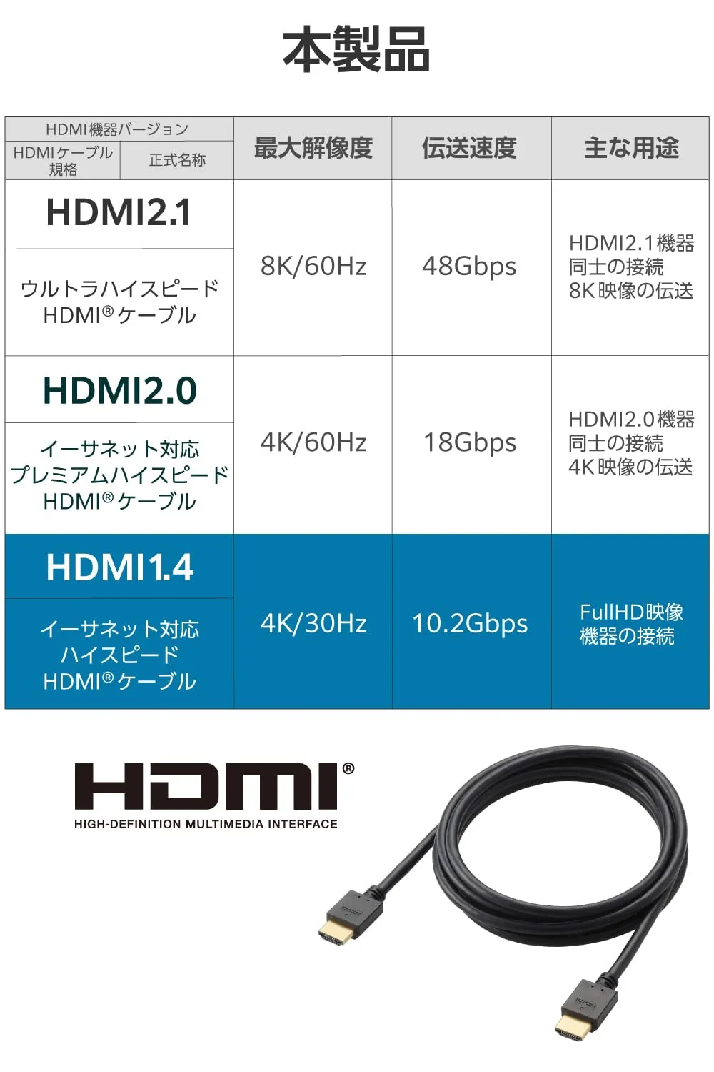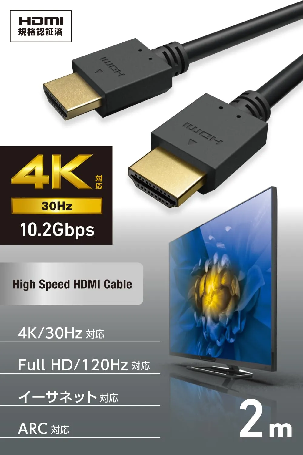 最大4K/30Hzの解像度に対応した、認証済みのイーサネット対応ハイスピードHDMI(R)ケーブルです。