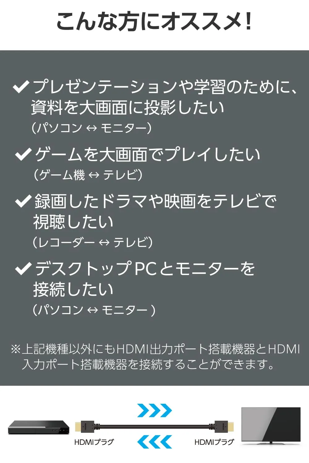 ■対応機種:HDMI(タイプA・19ピン)側:HDMI入力端子を持つ液晶テレビ・プラズマテレビ・プロジェクターなど、HDMI(タイプA・19ピン)側:HDMI出力端子を持つAV機器・ゲーム機など
