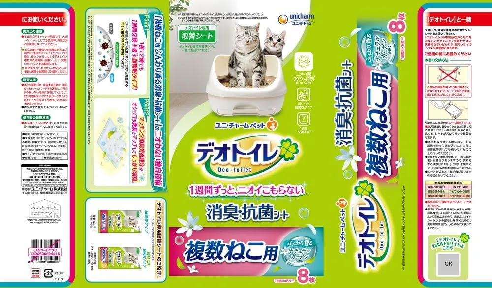 1週間ずっと、ニオイこもらない・「複数ねこ用ふんわり香る消臭・抗菌シート」のニオわない独自技術・1枚で2頭でも1週間交換不要の超吸収タイプ・マッチング消臭芳香成分がオシッコの悪臭とマッチしてしっかり消臭