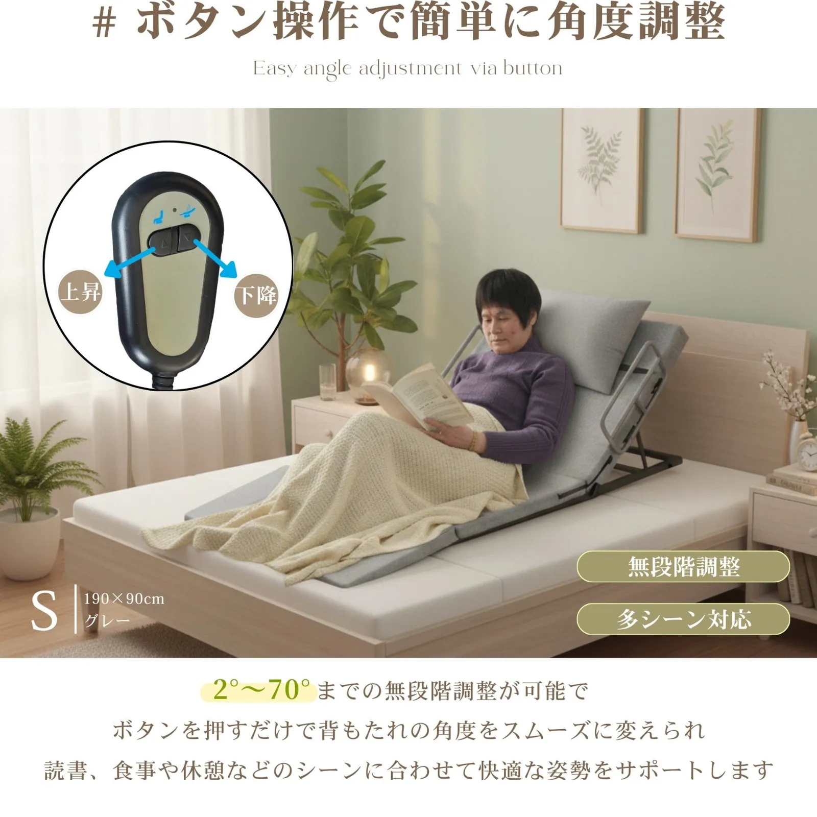 新入荷|ベッド手すり 電動マット S:190*90サイズ 電動リクライニングマット 電動ベッド 折りたたみベッド 電動 リクライニングベッド 2°~70°角度調整 ベッド シングル 無段階 家庭用 高さ調節 角度調整 グレー
