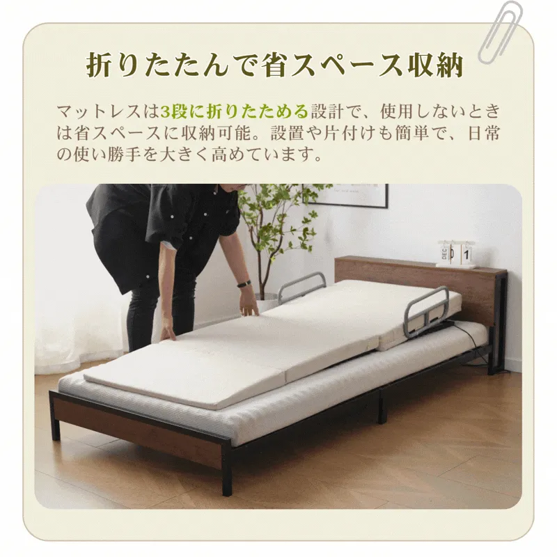 【折りたたんで省スペース収納】マットレスは3段に折りたためる設計で、使用しないときは省スペースに収納可能。設置や片付けも簡単で、日常の使い勝手を大きく高めています。