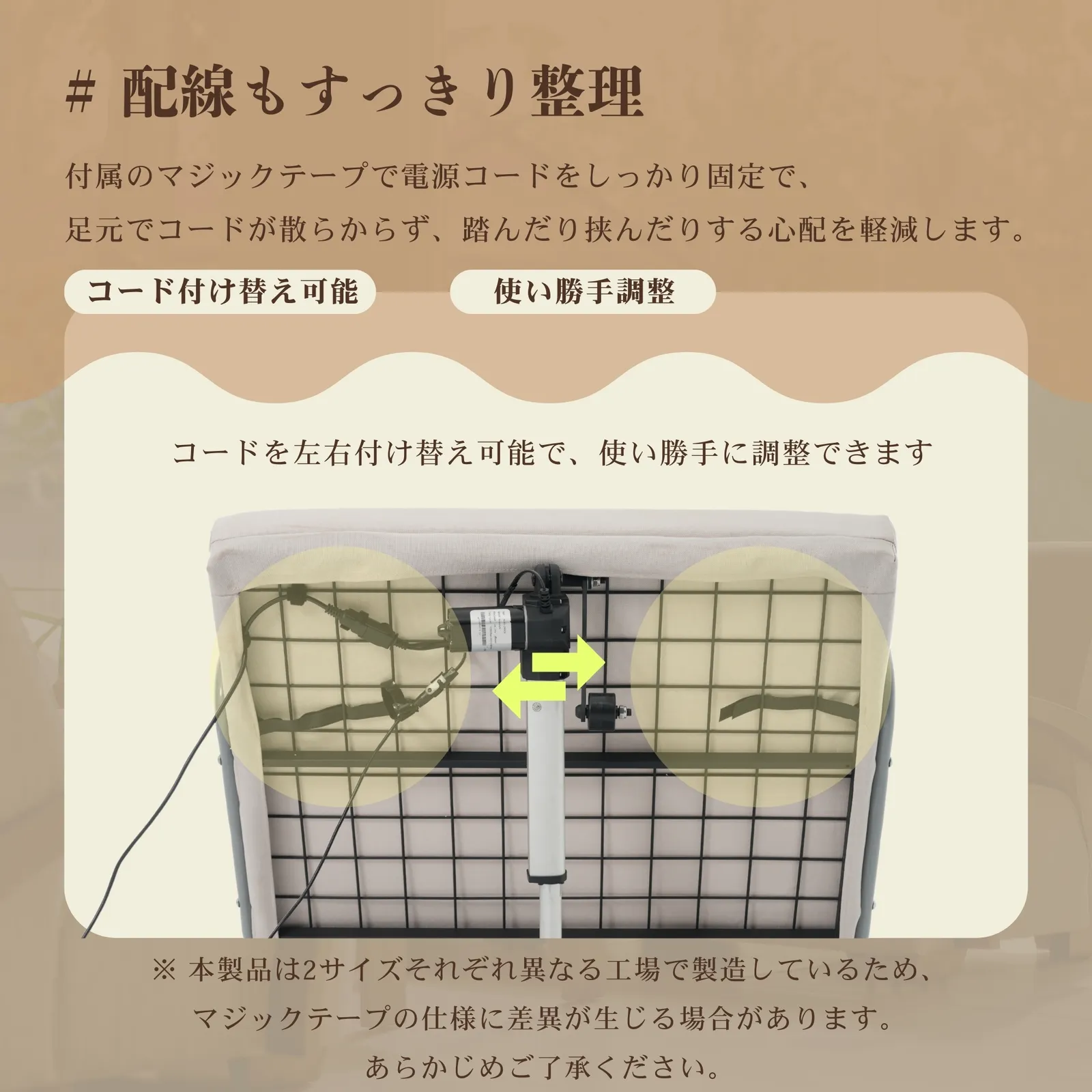 【配線もすっきり整理】付属のマジックテープで電源コードをしっかり固定で、足元でコードが散らからず、踏んだり挟んだりする心配を軽減します。さらに、コンセントの位置に合わせてコードを左右どちらにも付け替え可能で、使い勝手に合わせて調整できます。※ 本製品は2サイズそれぞれ異なる工場で製造しているため、マジックテープの仕様に差異が生じる場合があります。あらかじめご了承ください。”