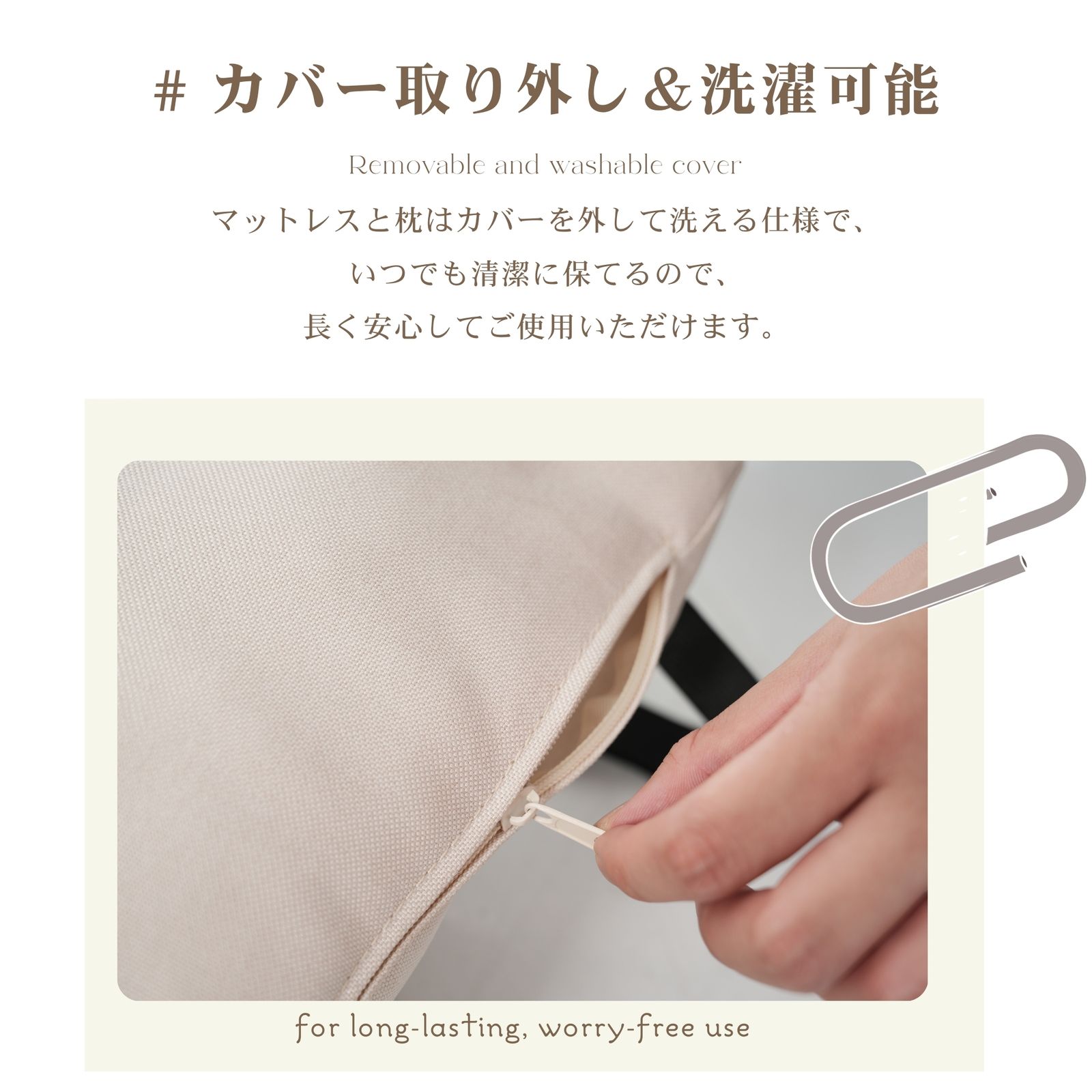 【カバー取り外し&洗濯可能】マットレスと枕はカバーを外して洗える仕様で、いつでも清潔に保てるので、長く安心してご使用いただけます。