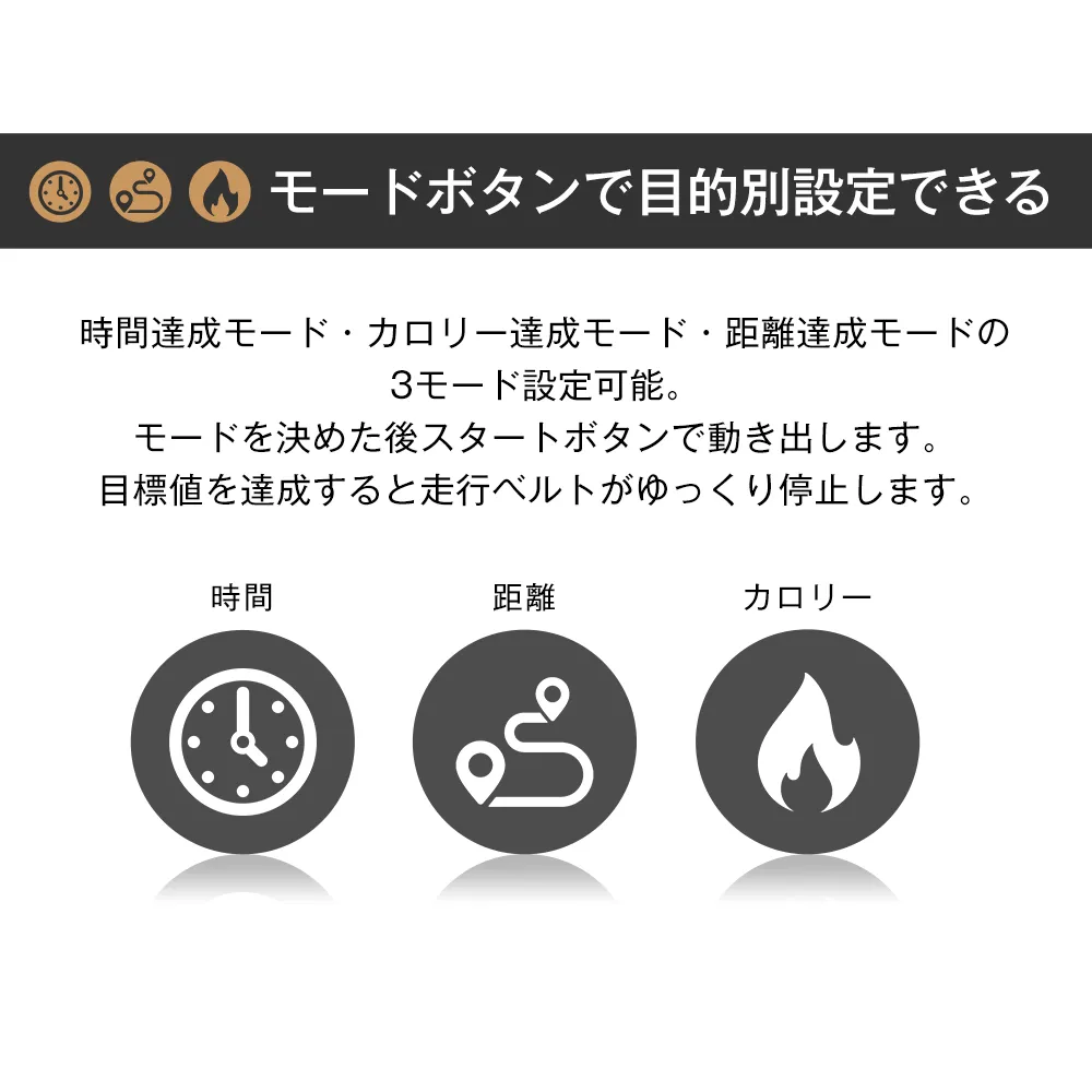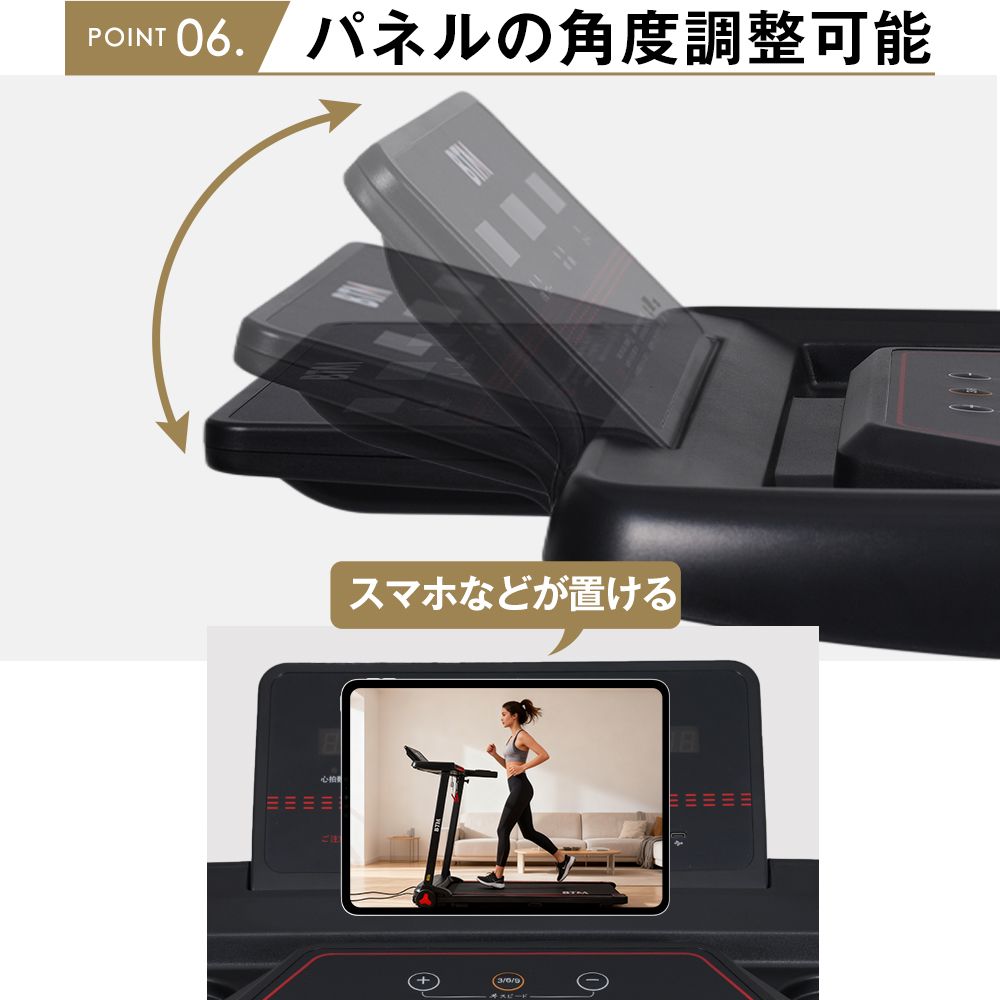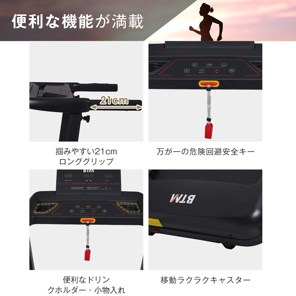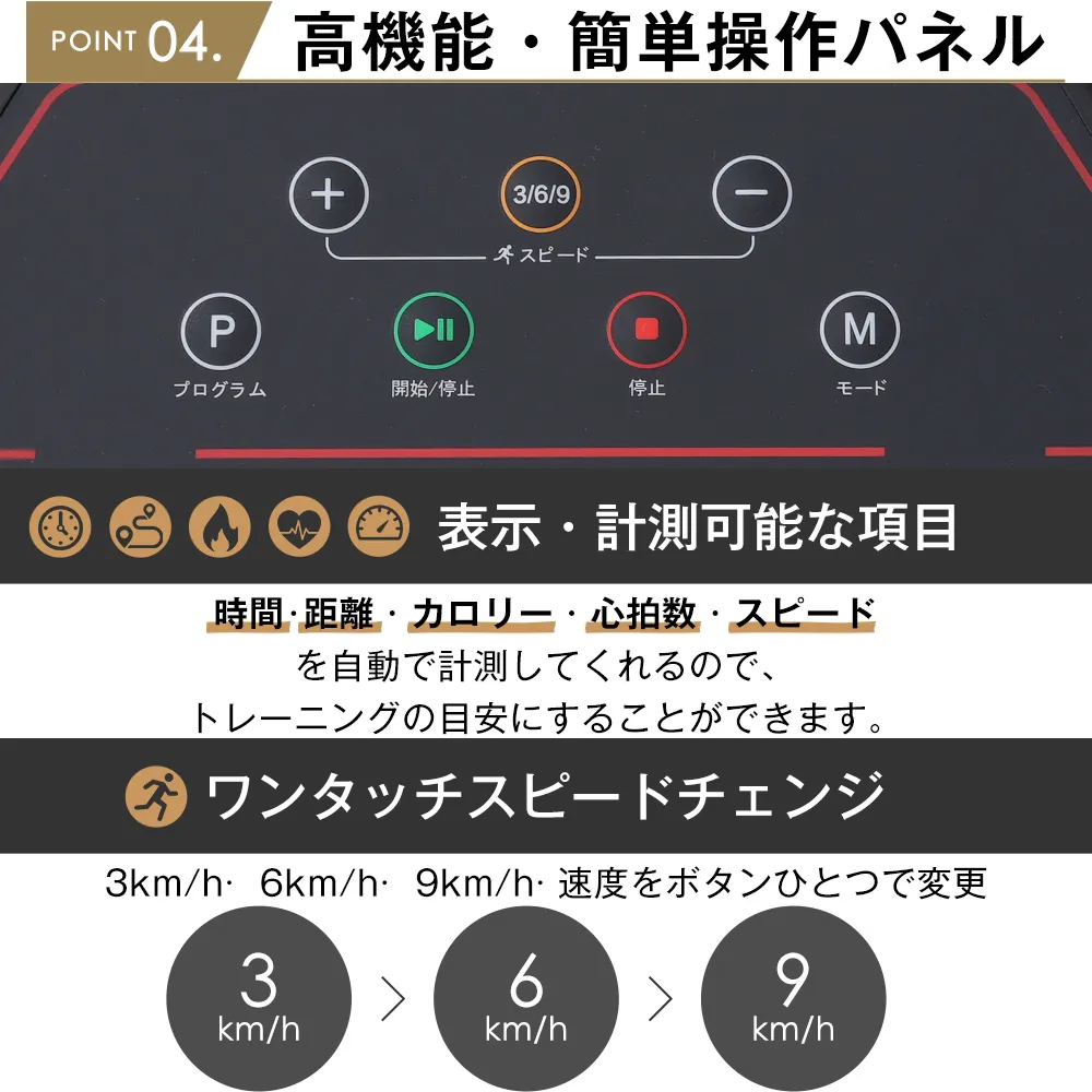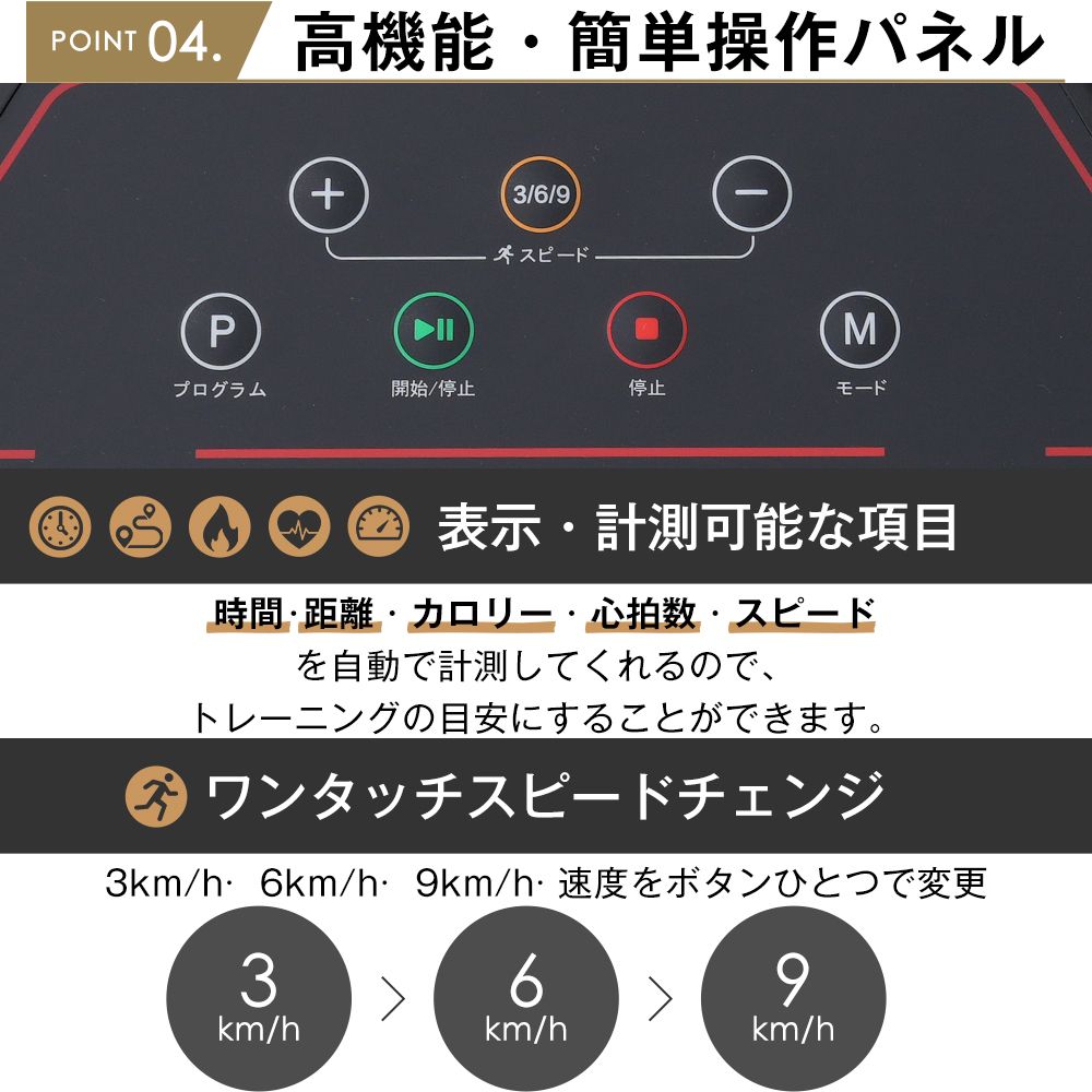 【高機能・簡単操作パネル①表示・計測可能な項目(小??)時間・距離・カロリー・心拍数・スピードを自動で計測してくれるので、トレーニングの目安にすることができます。②ワンタッチスピードチェンジ(小??)3km/h? 6km/h? 9km/h? 速度をボタンひとつで変更③モードボタンで目的別設定できる(可?定3?模式)(小??)時間達成モード・カロリー達成モード・距離達成モードの3モード設定可能。モードを決めた後スタートボタンで動き出します。目標値を達成すると走行ベルトがゆっくり停止します。④12種類のオートプログラム搭載(12?程式)(小??)設定した時間内で速度が自動的に切り替わるプログラムを搭載。トレーニングを楽しめる!スマホやUSBメモリで音楽再生可能