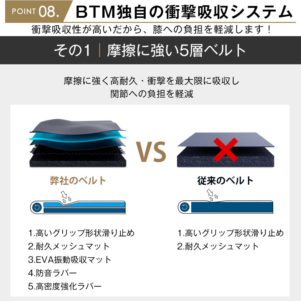 【独自の衝撃吸収システム】衝撃吸収性が高いだから、膝への負担を軽減します!その1 摩擦に強い5層ベルト1.高いグリップ形状滑り止め2.耐久メッシュマット3.EVA振動吸収マット4.防音ラバー5.高密度強化ラバー摩擦に強く高耐久・衝撃を最大限に吸収し関節への負担を軽減その2 衝撃吸収特殊クッションで着地の衝撃を効果的に吸収