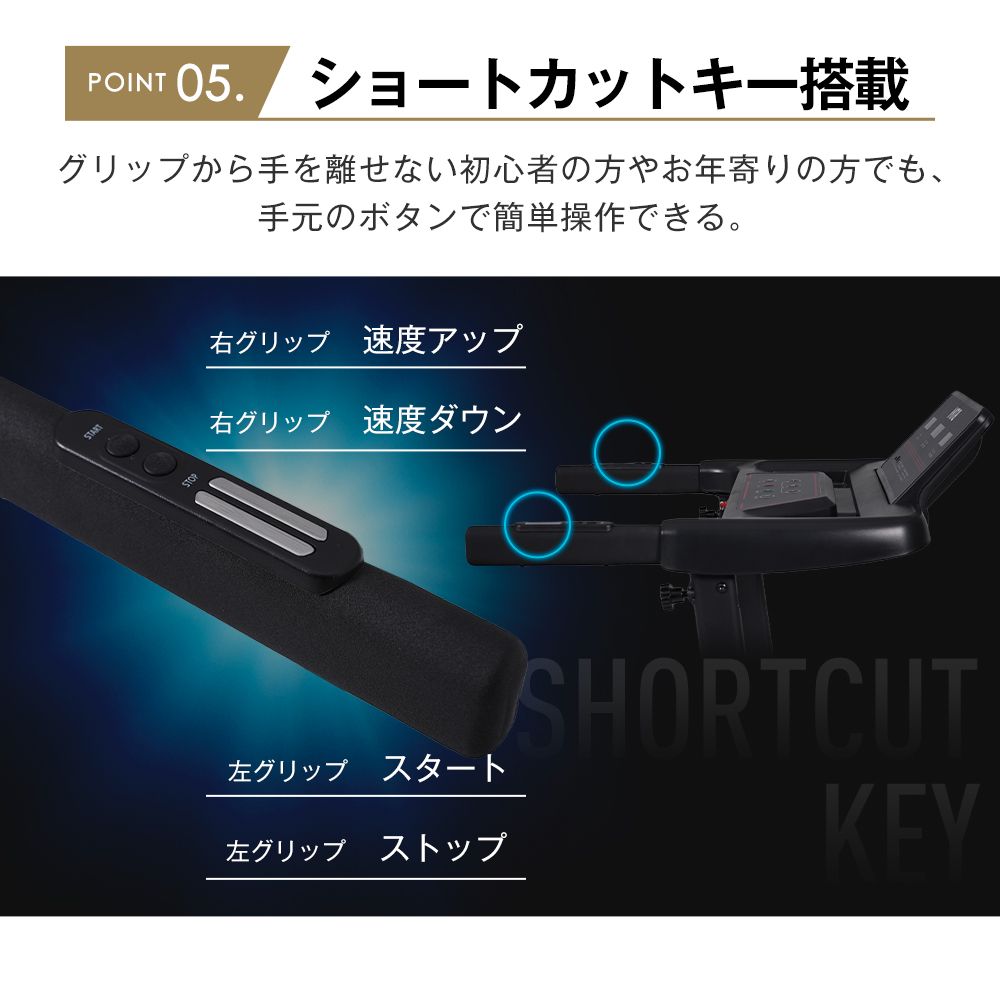 【ショートカットキー搭載】グリップから手を離せない初心者の方やお年寄りの方でも、手元のボタンで簡単操作できる。右グリップ:速度アップ・速度タウン左グリップ:スタート・ストップ