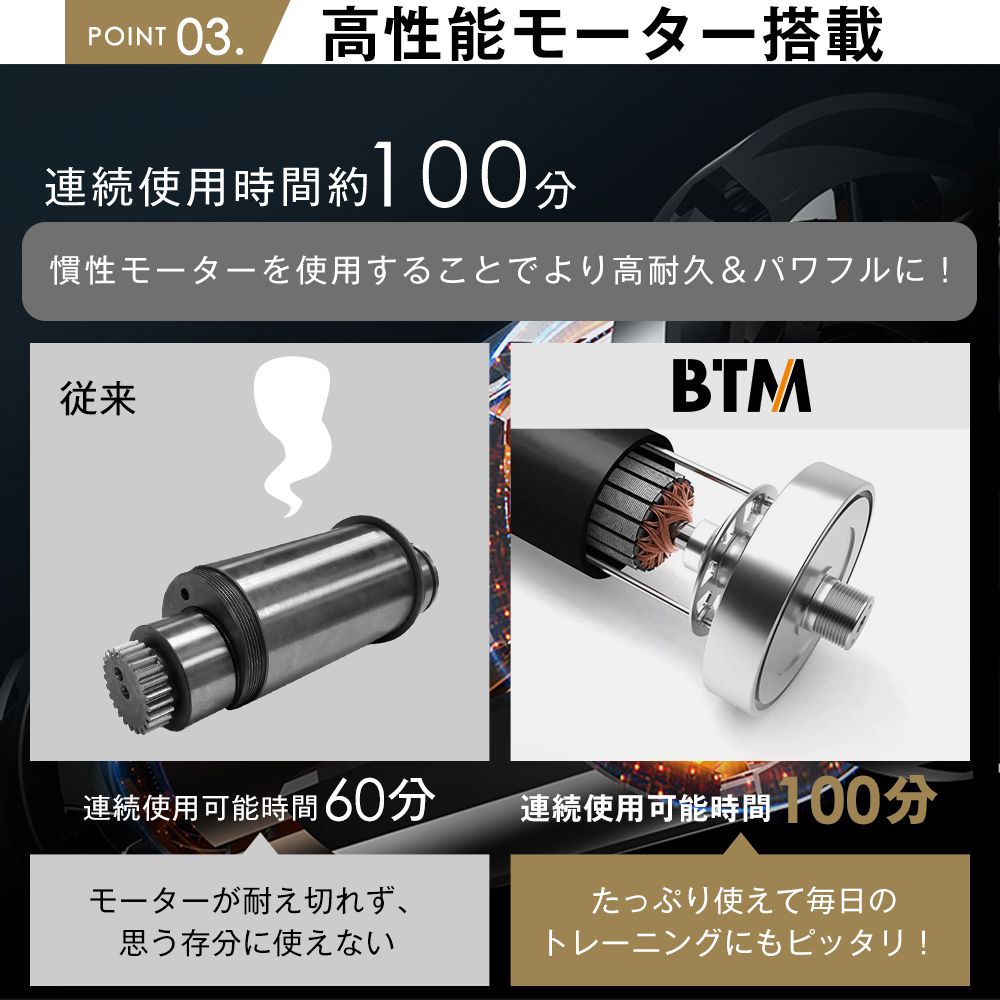 【高性能モーター搭載】連続使用時間約100分 慣性モーターを使用することでより高耐久&パワフルに!高耐久だから、耐荷重100kg