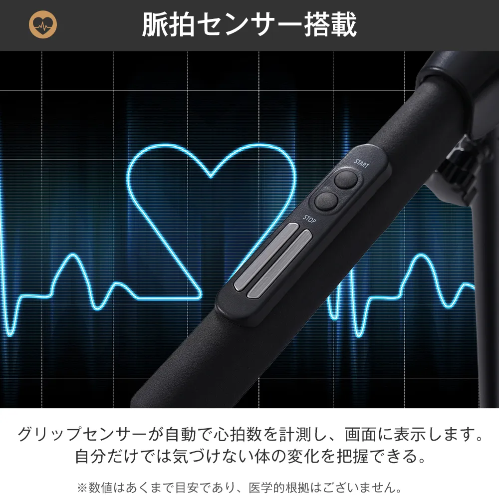 【脈拍センサー搭載】グリップセンサーが自動で心拍数を計測し、画面に表示します。自分だけでは気づけない体の変化を把握できる。※数値はあくまで目安であり、医学的根拠はございません。