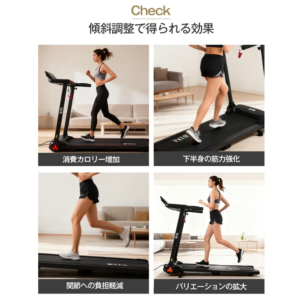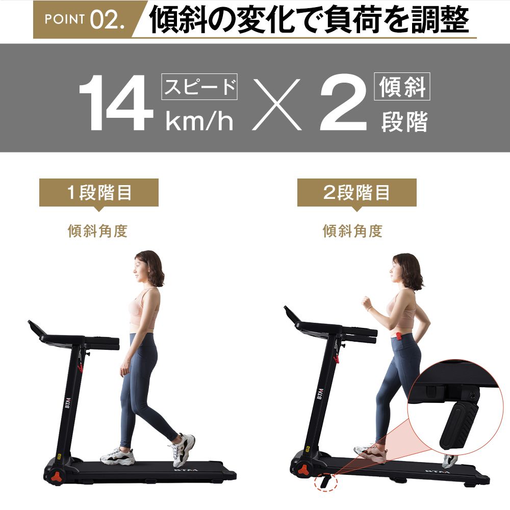 【傾斜の変化で負荷を調整】14スピードkm/h× 2傾斜段階 傾斜調整で得られる効果 消費カロリー増加 下半身の筋力強化 関節への負担軽減 バリエーションの拡大