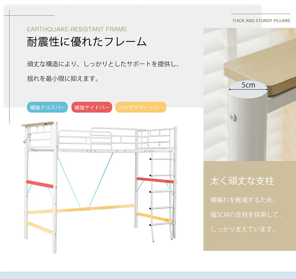 【point3安全性と使いやすさのコダワリ】1 側面で支えてずり落ちを防し上段には、睡眠中の転落を防ぐサイドフレームが付いています、布団のずり落ちや寝返りを支えてくれます。2 転倒・ずり落ちをダブルサポート睡眠中の転落を防ぐ寝返りストッパー付き布団のずれ落ちも枕のずり落ちを防いでくれる嬉しいポイントです。