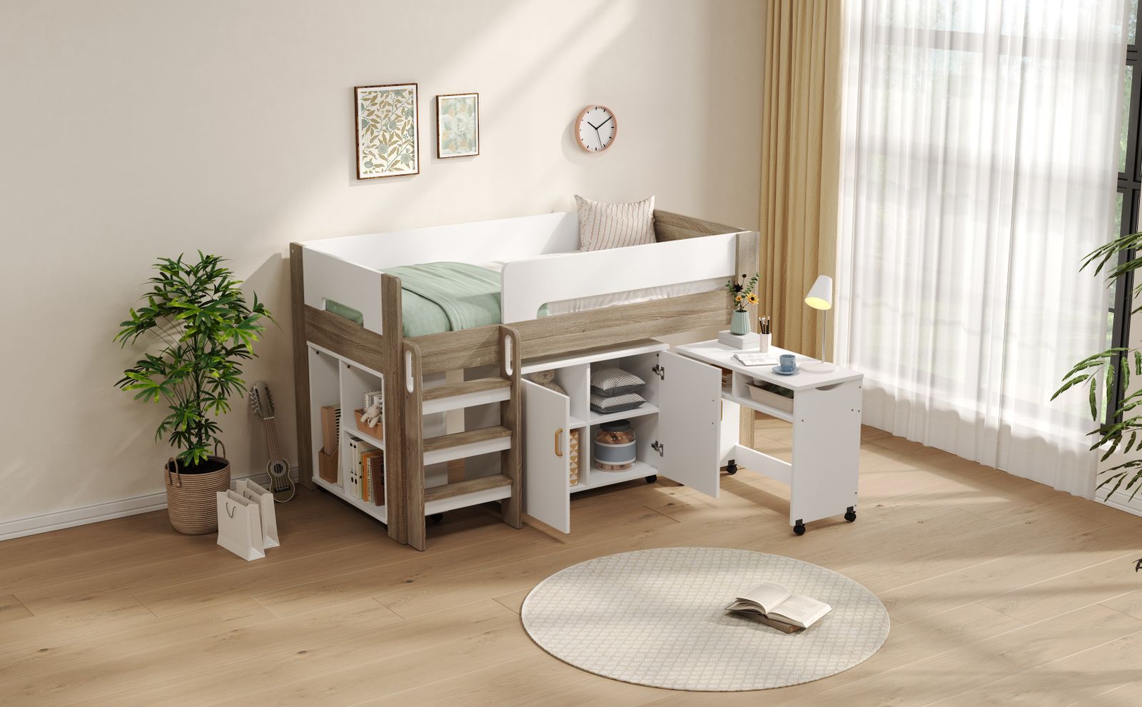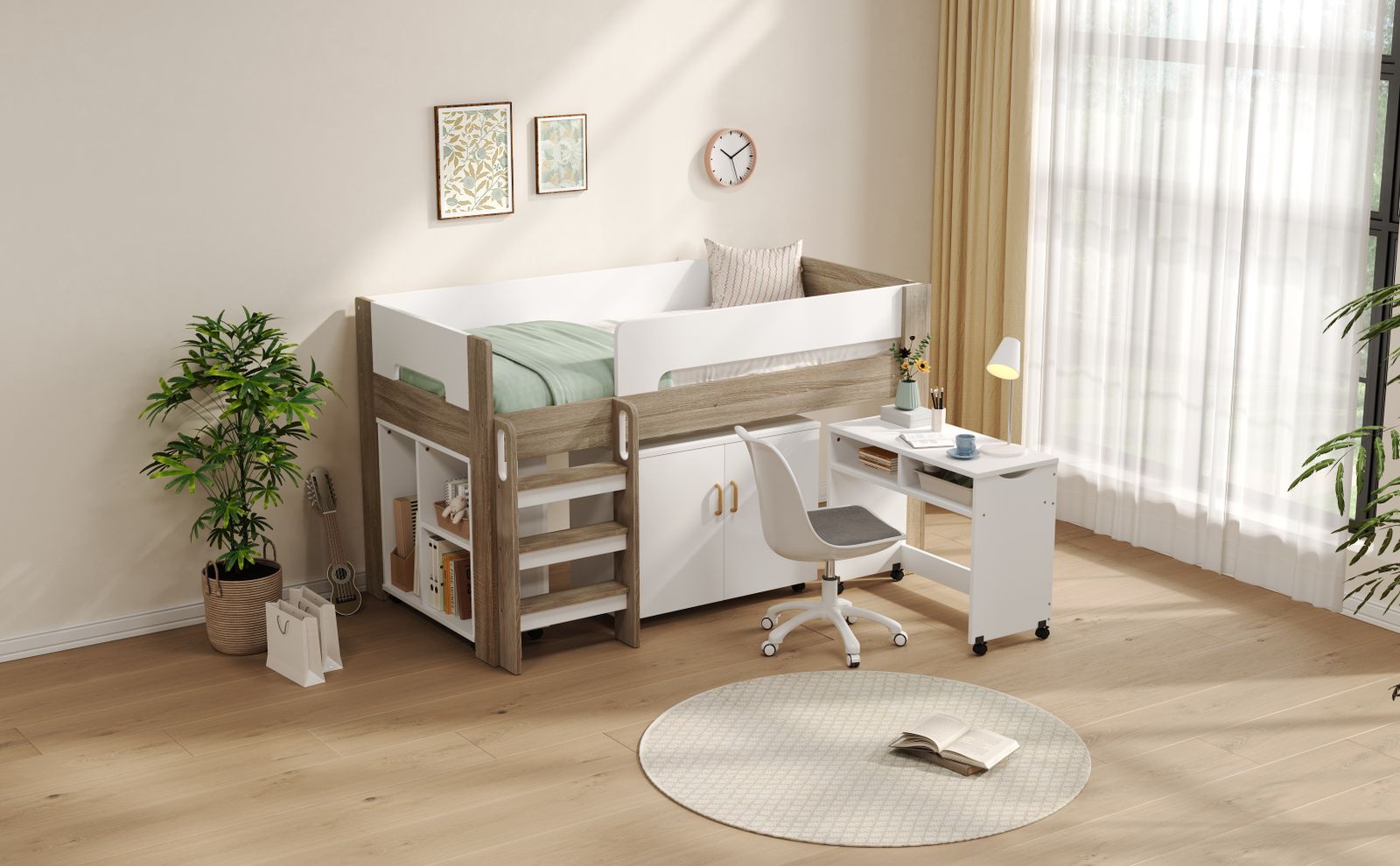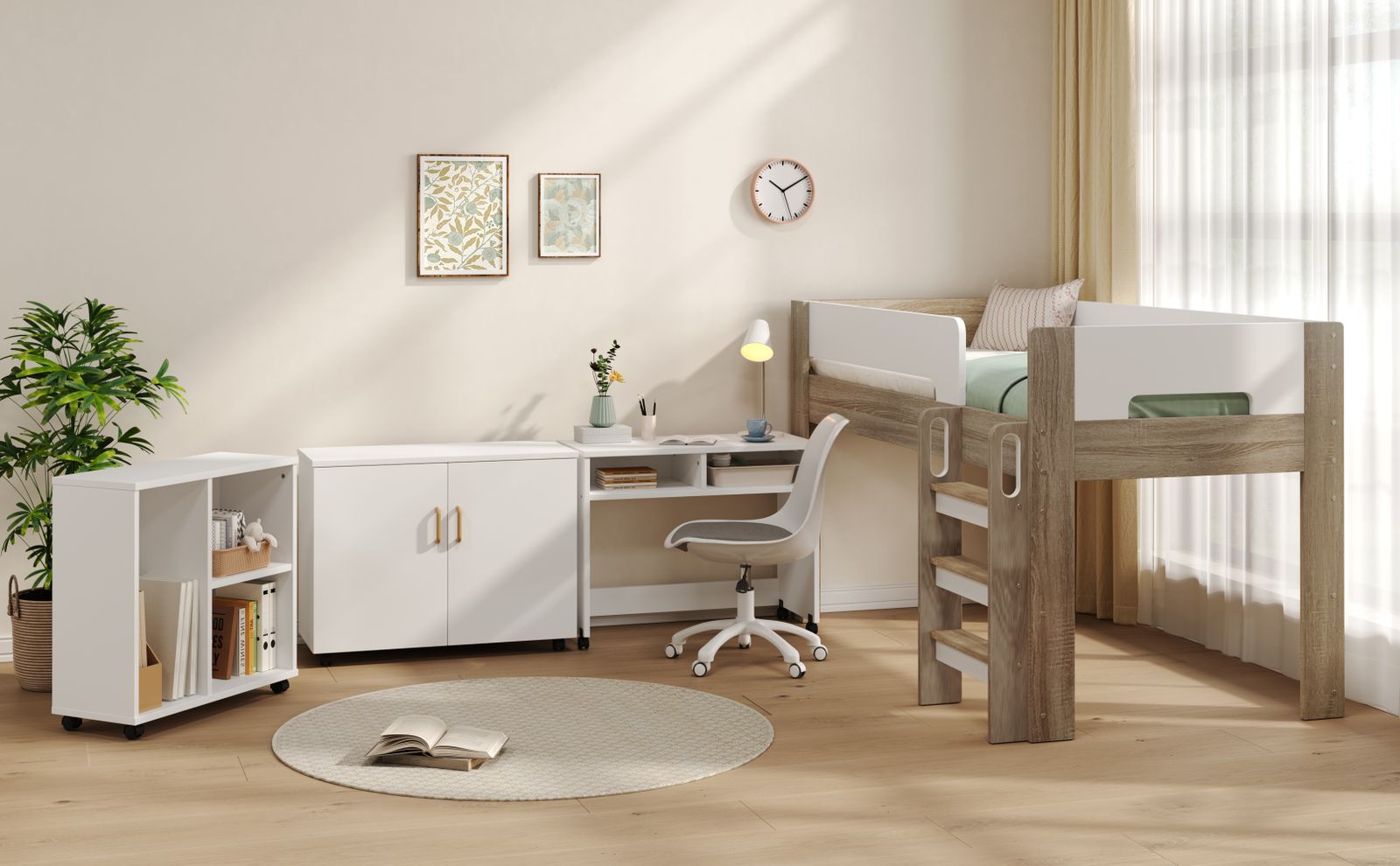 【とにかく省スペースになる 】 デスクとシェルフをベッドの下へすっきり収納でき、お部屋の限られたスペースを最大限に活用。