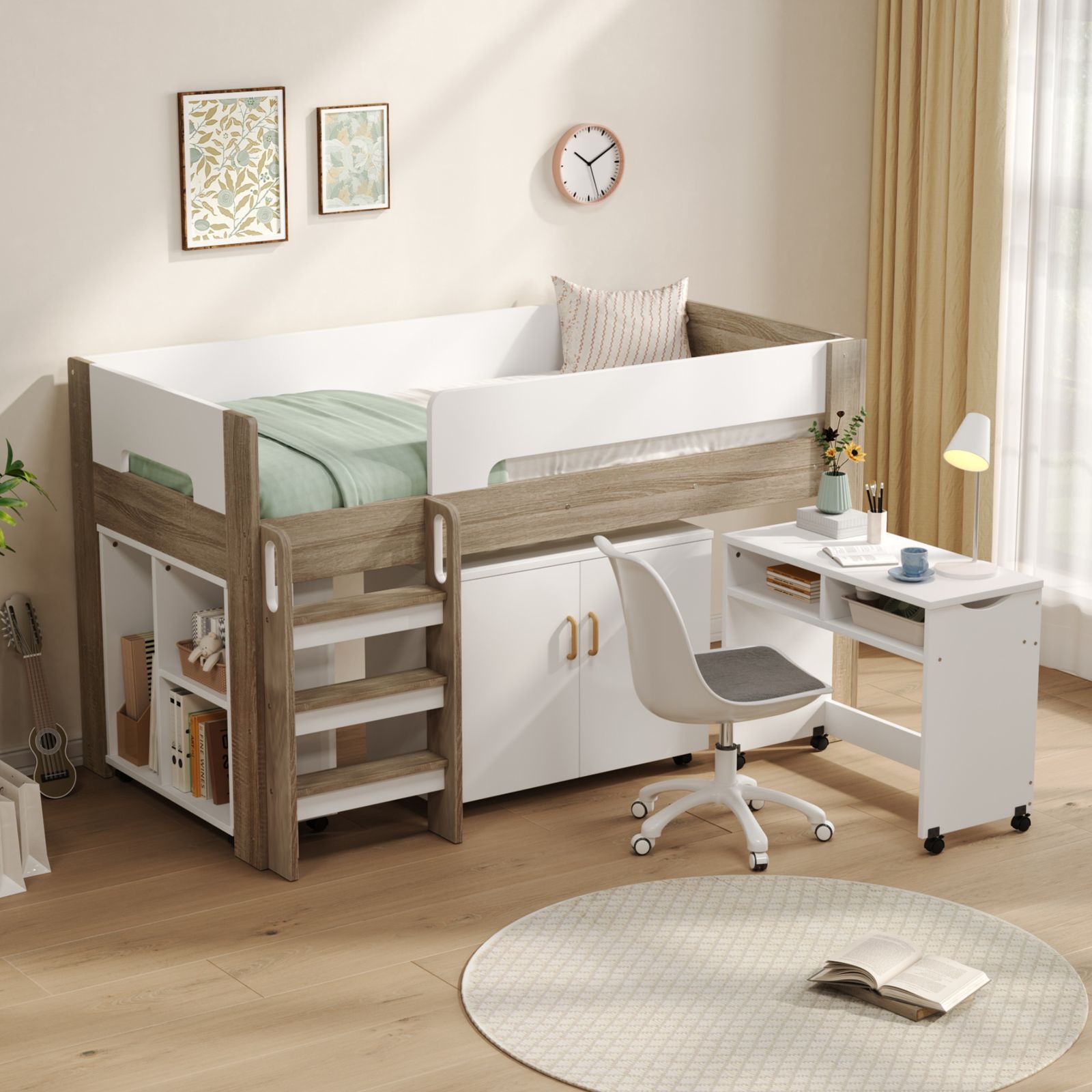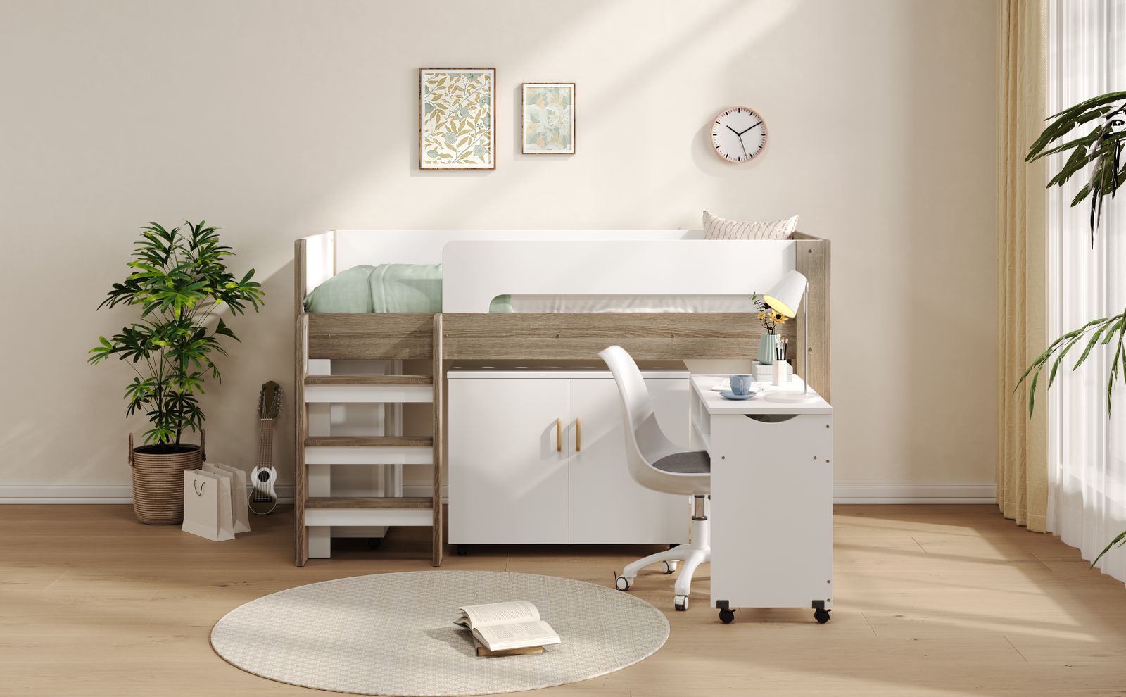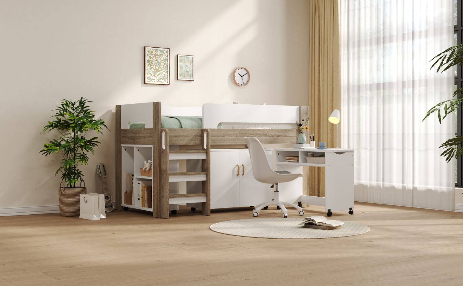 【とにかく省スペースになる 】 デスクとシェルフをベッドの下へすっきり収納でき、お部屋の限られたスペースを最大限に活用。