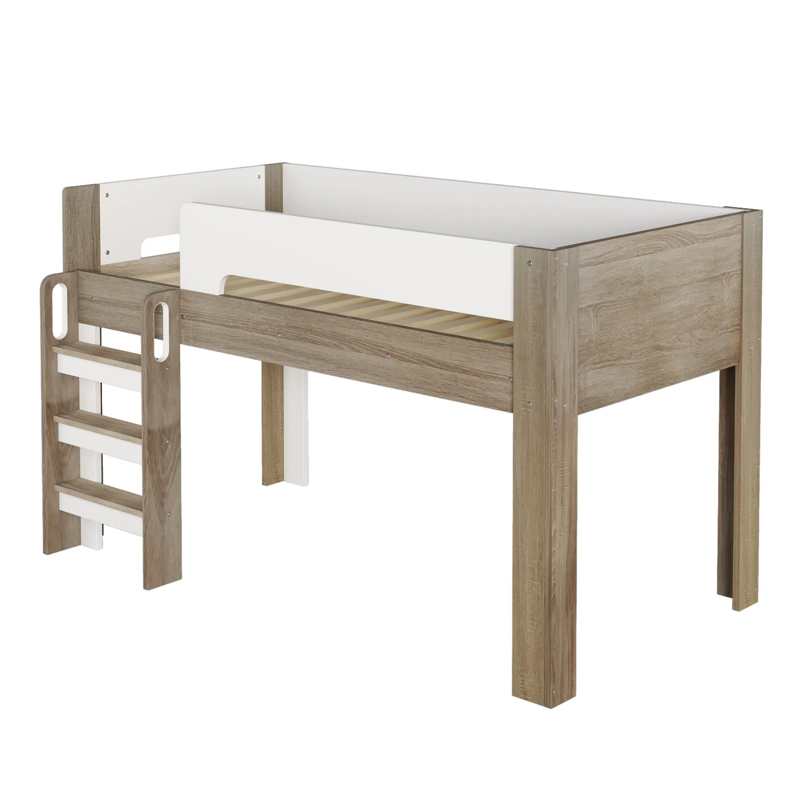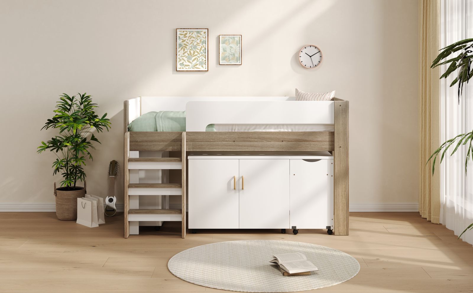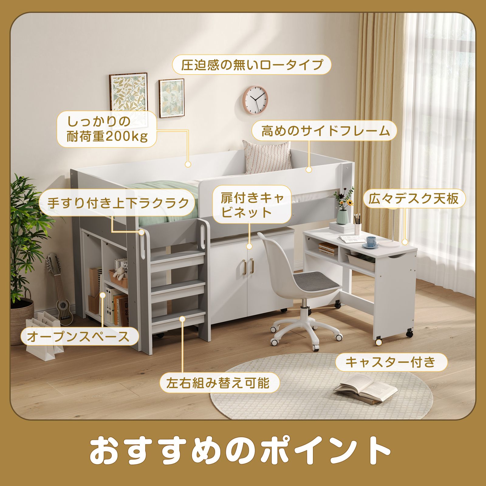 【ロータイプデザイン 】 高さ120cmのロータイプシステムベッド、天井からの圧迫感が少なく、お子様の顔も見えやすい安心設計になっています。