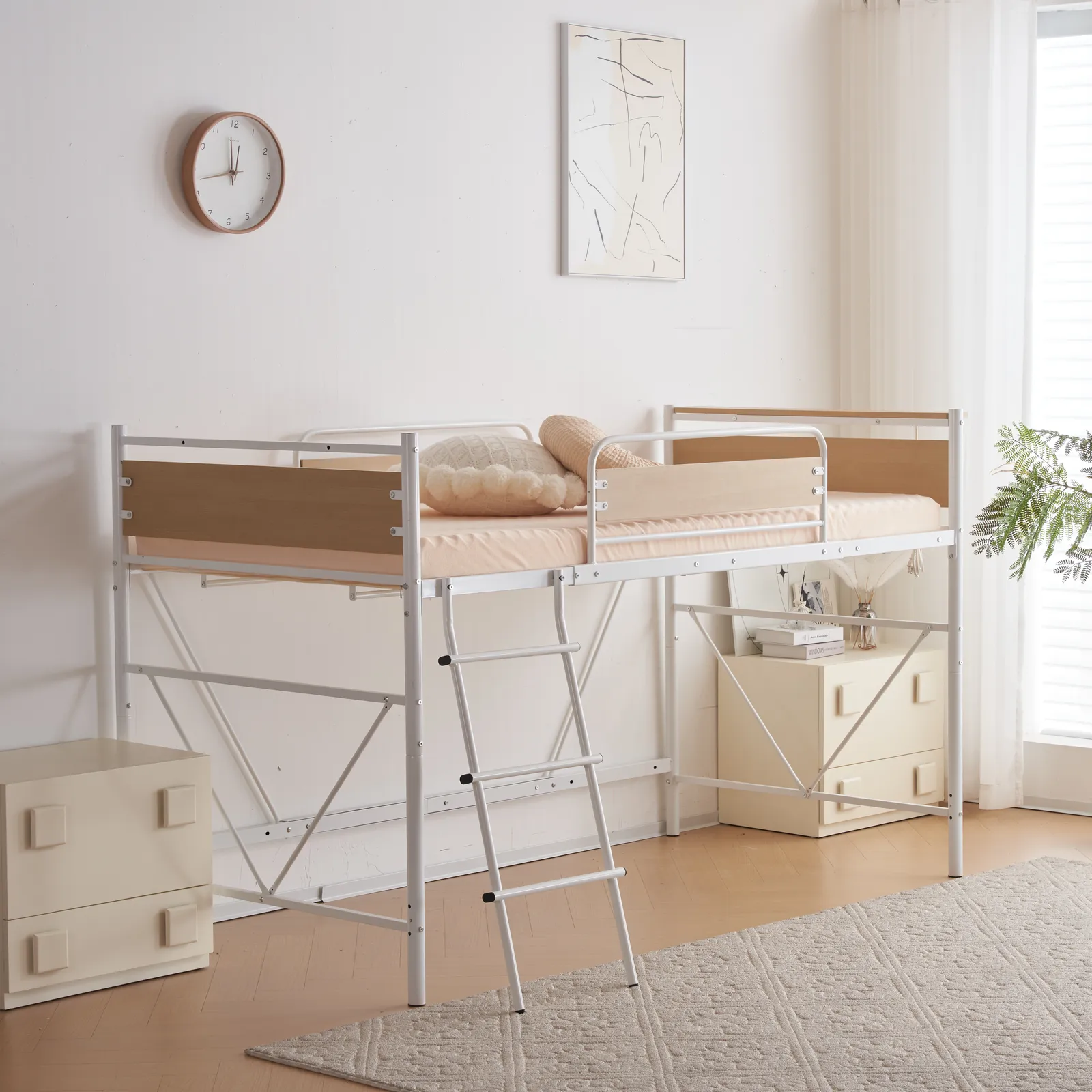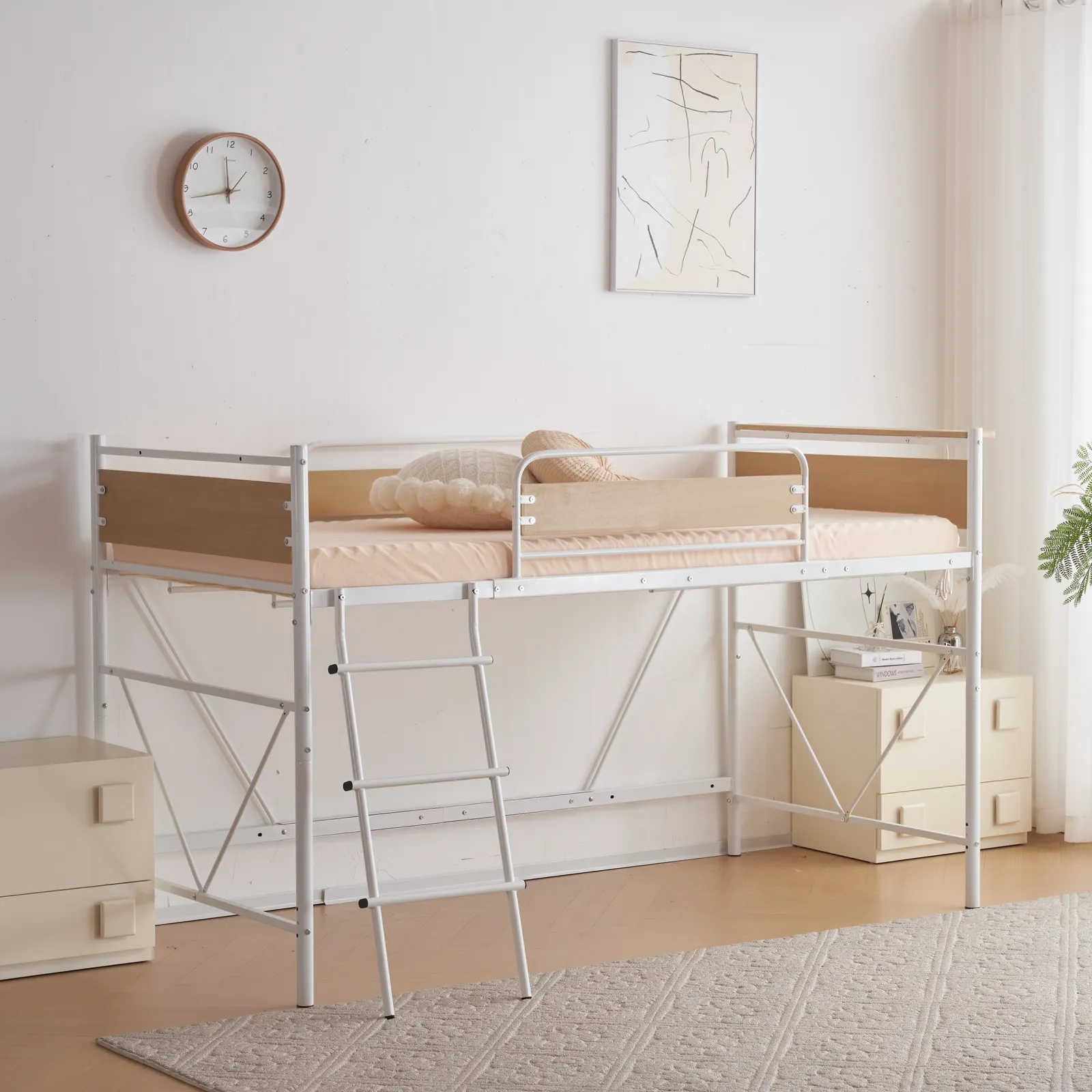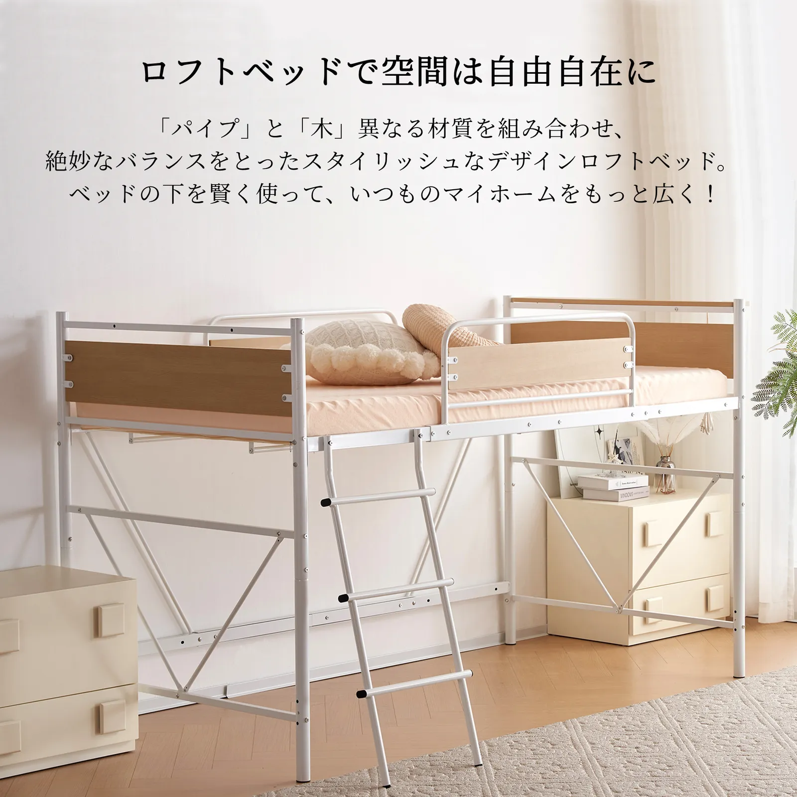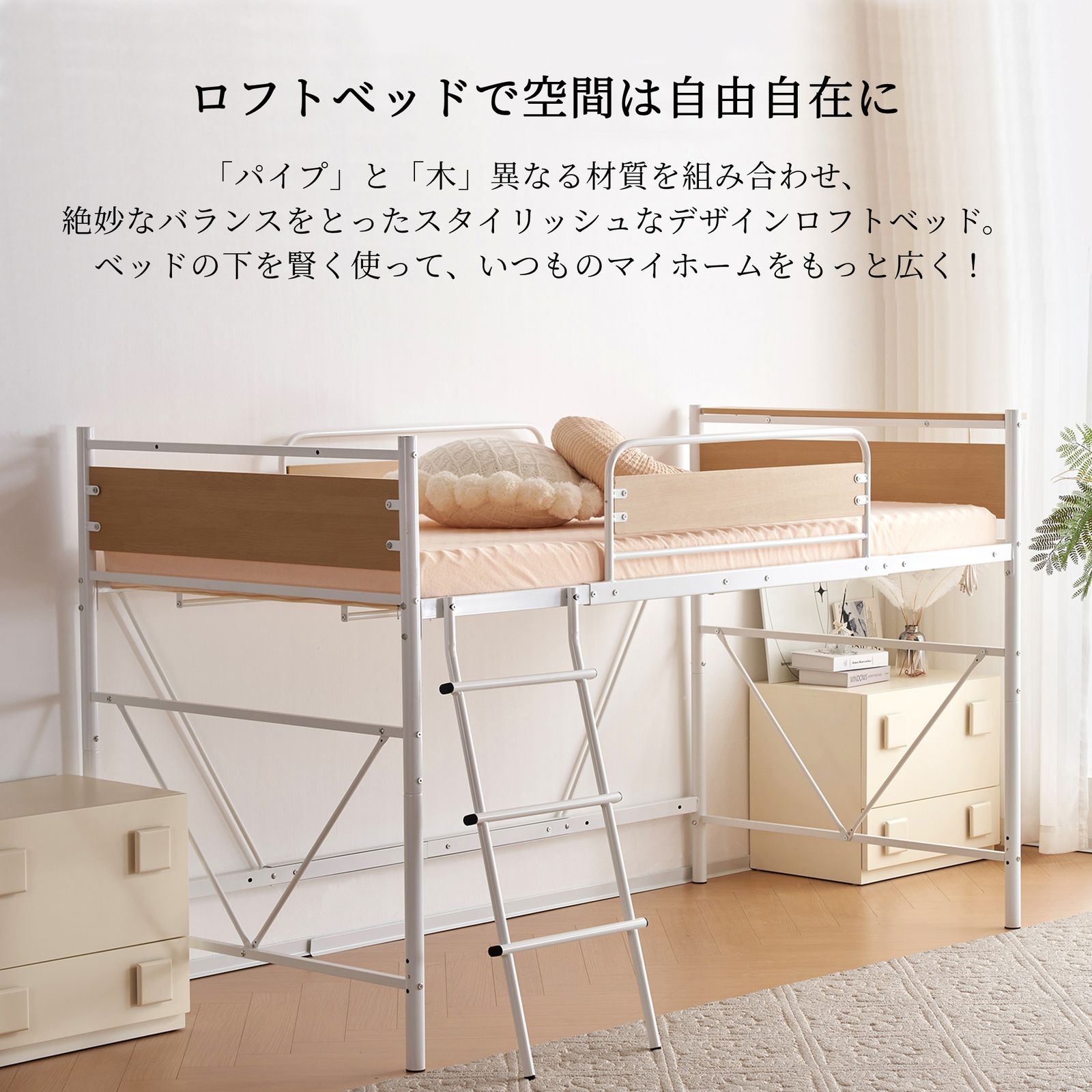 【ロフトベッドで空間は自由自在に】「パイプ」と「木」異なる材質を組み合わせ、絶妙なバランスをとったスタイリッシュなデザインロフトベッド。 ベッドの下を賢く使って、いつものマイホームをもっと広く!