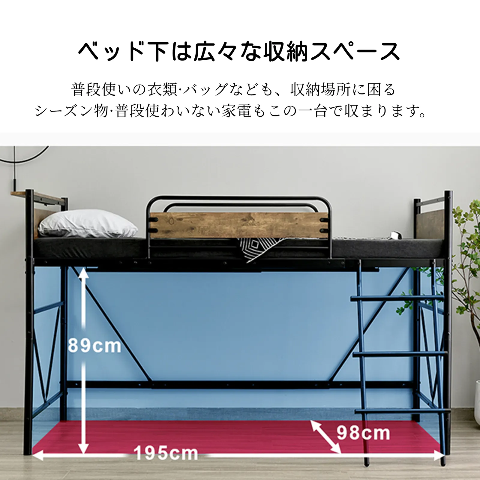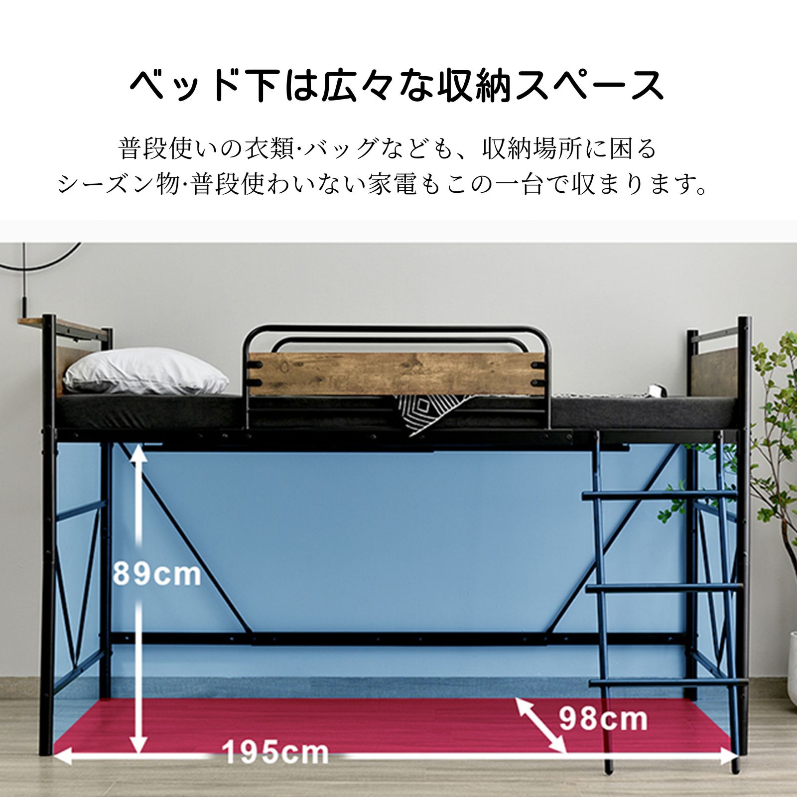 【ベッド下は広々な収納スペース 】普段使いの衣類?バッグなども、収納場所に困るシーズン物?普段使わいない家電もこの一台で収まります。