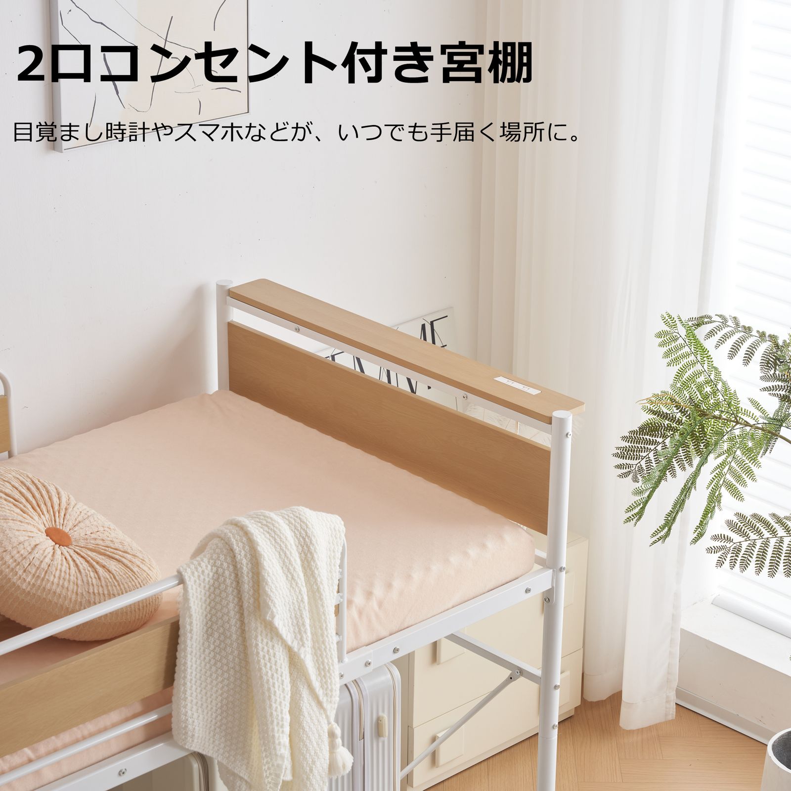 【2口コンセント付き宮棚 】目覚まし時計やスマホなどが、いつでも手届く場所に。 はしごと宮は左右どちらにも設置可能です。模様替えにも対応し、理想なレイアウトを実現します。
