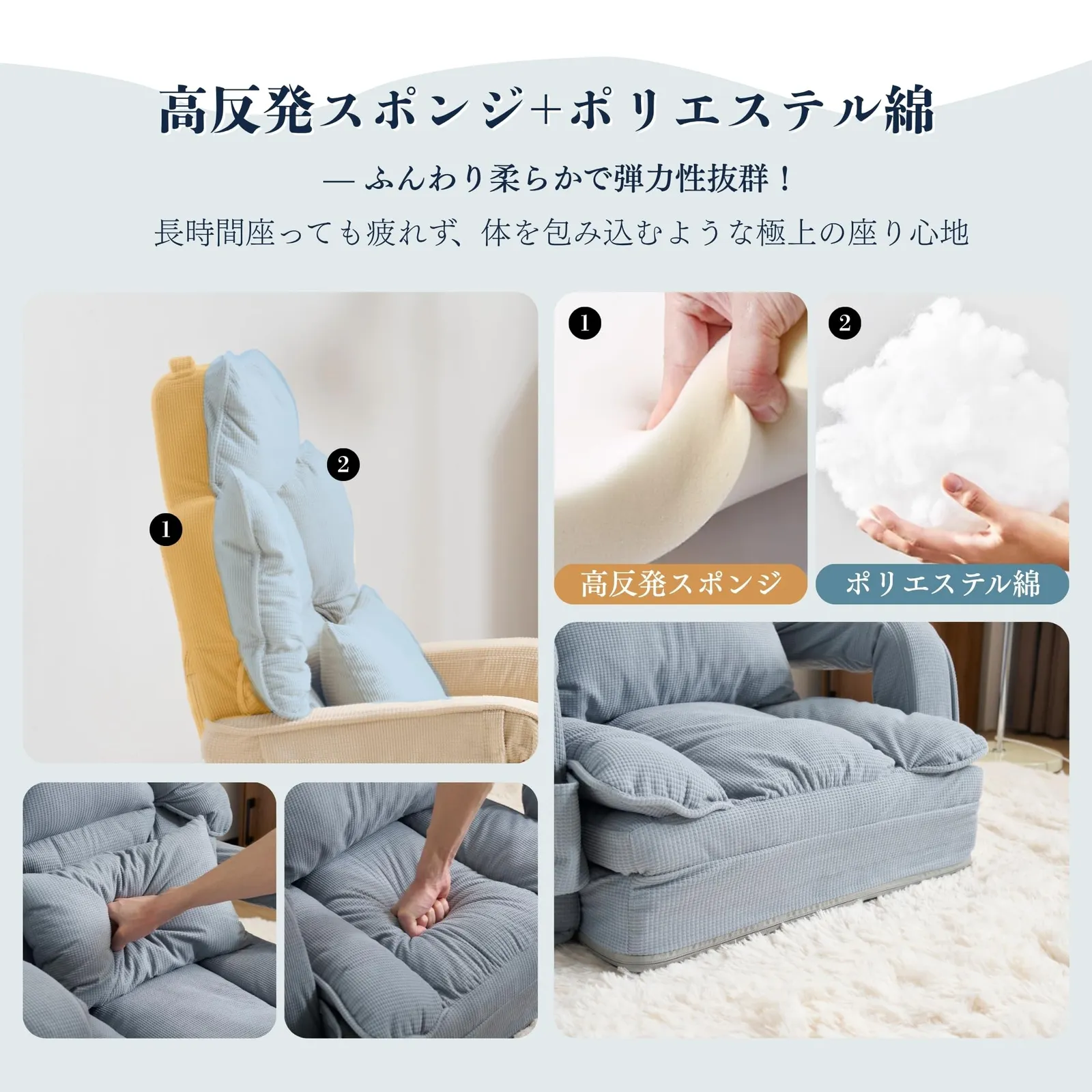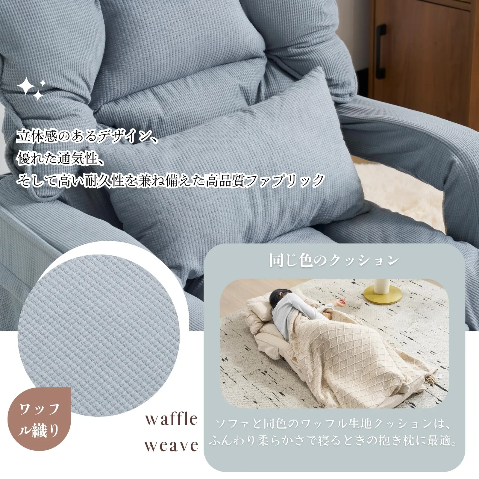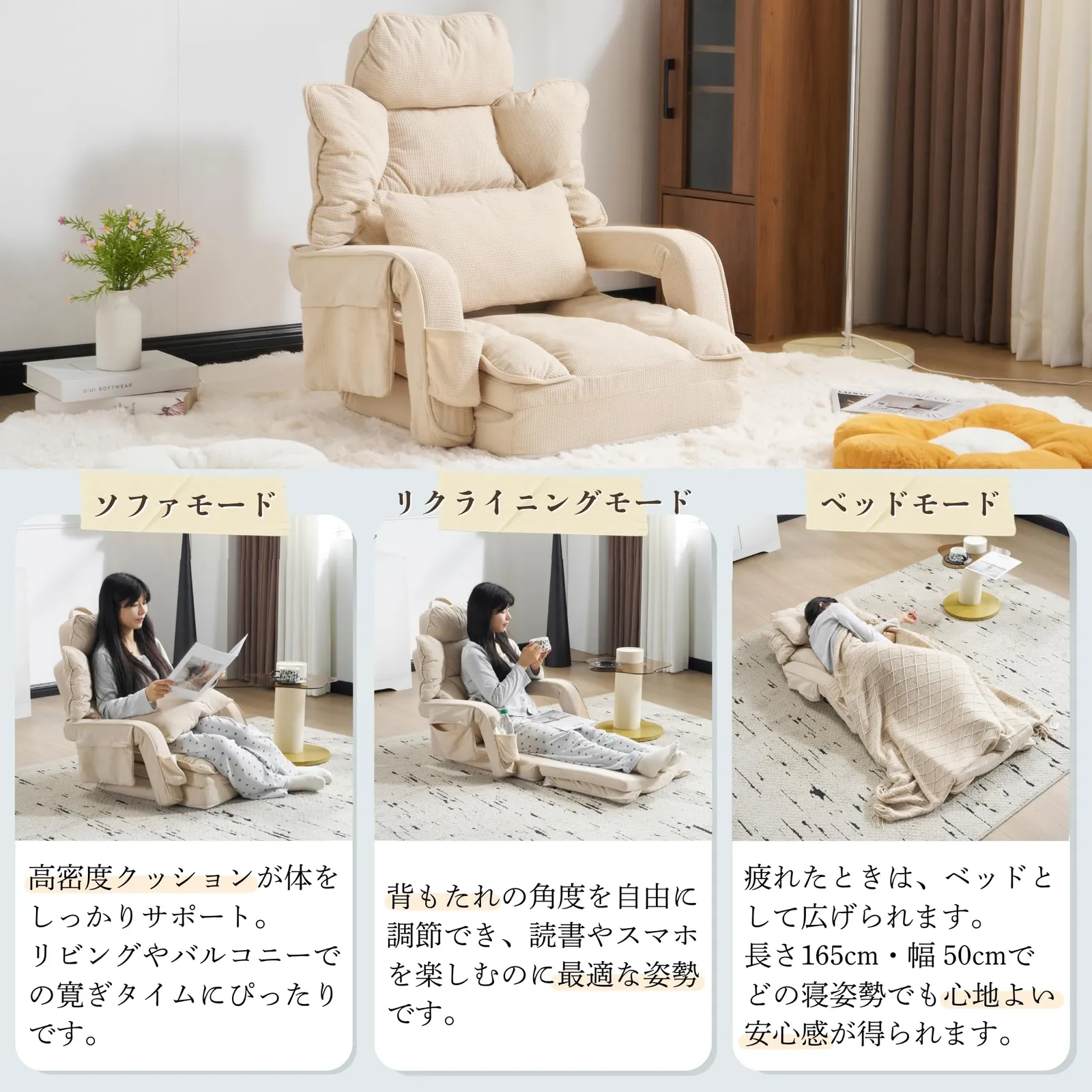 ??? 4. 多様なスタイルでくつろぐ ソファモード 高密度クッションがしっかりと体を支え、リビングやバルコニーでのリラックスタイムに最適。 リクライニングモード 背もたれを自由に調整して、読書やスマホ時間を快適な姿勢で。 ベッドモード 165cmの長さと50cmの幅で、横になってもゆったり。疲れた身体をやさしく包み込みます。 ?? 5. 多段階リクライニング 90°?180°まで自由自在に調節可能 KOYO製42段ギア採用。読書・仮眠・リラックスなど、気分に合わせて角度をカスタマイズ。 なめらかな42段階調整で、いつでも“ちょうどいい”姿勢を実現。壁がなくても安定した使用感です。 ?? 6. 二重クッション構造でふんわり快適 高反発スポンジ × ポリエステル綿 ふんわり柔らかく、弾力性抜群。長時間座っても疲れにくく、体を包み込むような極上の座り心地。 ?? 7. ワッフル織り生地+同色クッション 通気性・伸縮性・耐久性に優れた高品質ファブリック 立体感のあるワッフル織りで、肌触りも心地よく、お手入れも簡単。 同色クッション付き ソファと同じ素材のクッションは、ふんわり柔らか。抱き枕としても使えます。 ?? 8. 実用的なデザイン ドリンクホルダーポケット付き 飲み物を置ける便利なアームポケット。すっきり収納でお部屋も整然。 ※こぼれやすいグラスの使用はご注意ください。 収納ポケット付き リモコンやスマホを手元に置けて快適。 折りたたみ設計 使わない時は約0.12m3にコンパクト収納。季節を問わず活躍します。