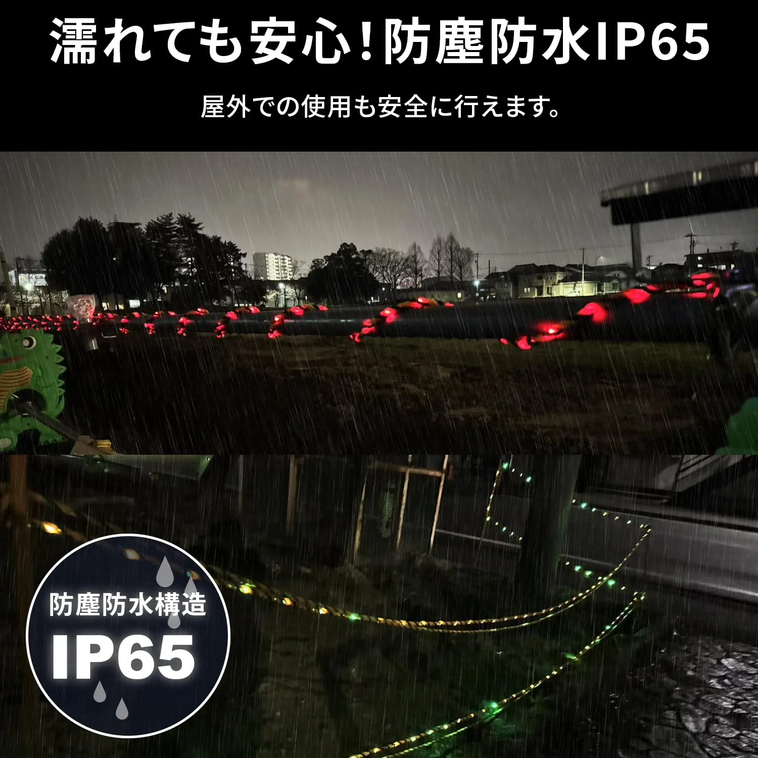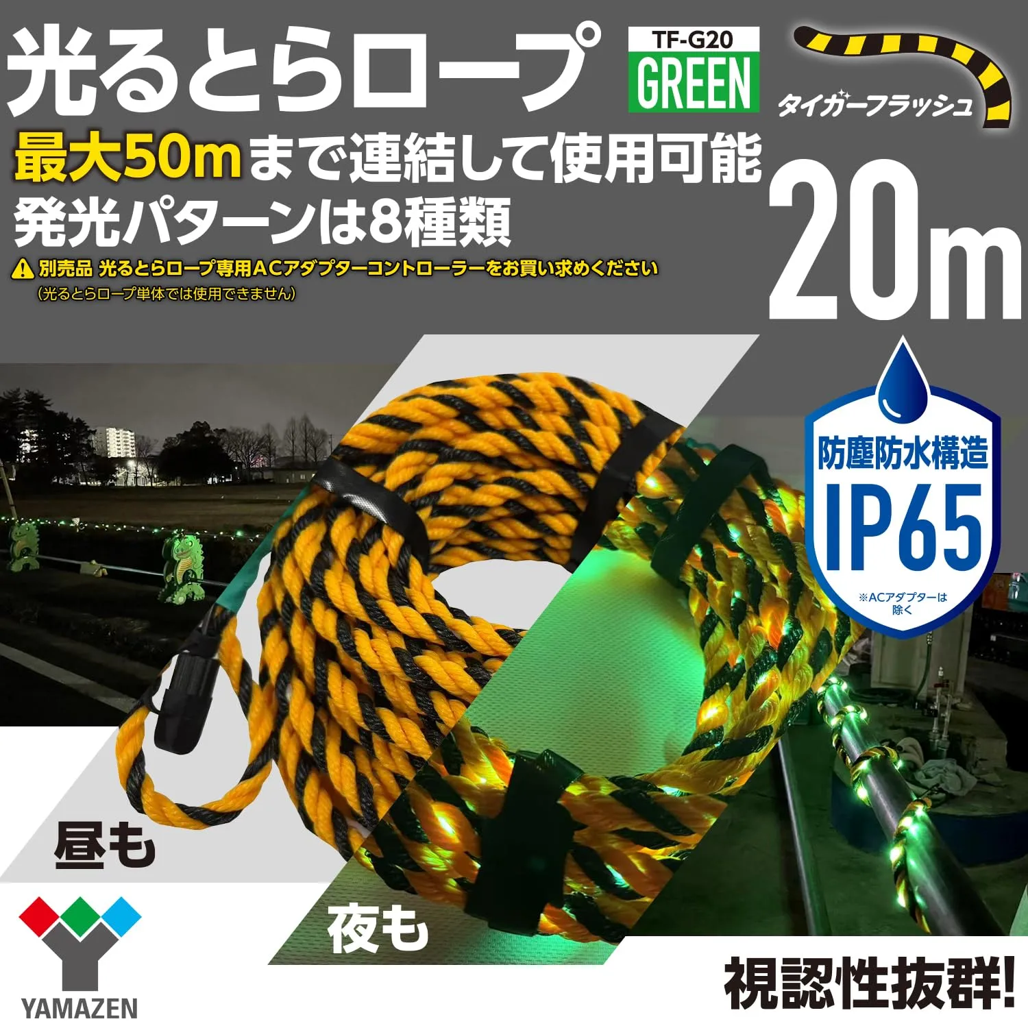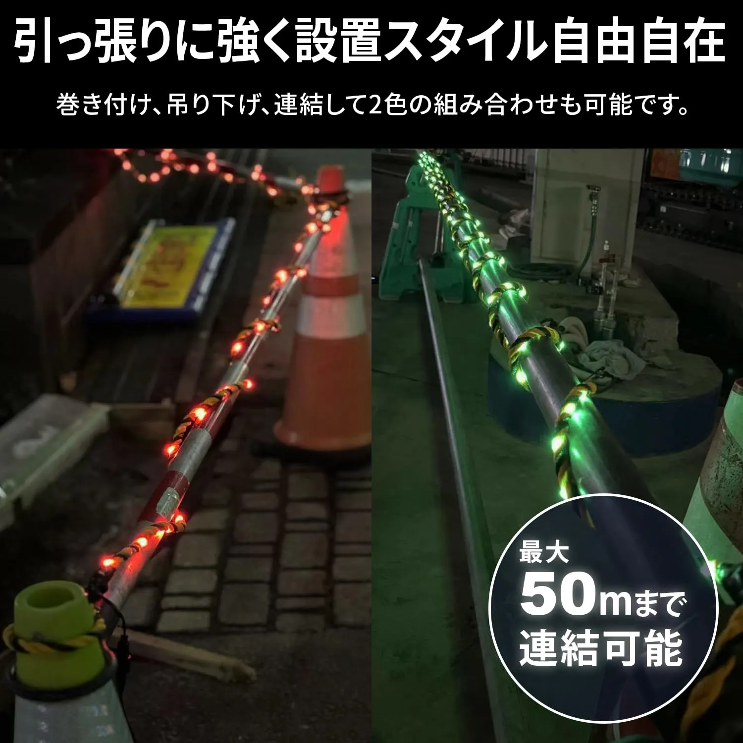 【光るトラロープ】LED搭載のロープライト。工事現場やイベント会場、災害現場など、視認性が求められるあらゆるシーンで活躍。※光らせて使用する場合、専用アダプターが必要です。