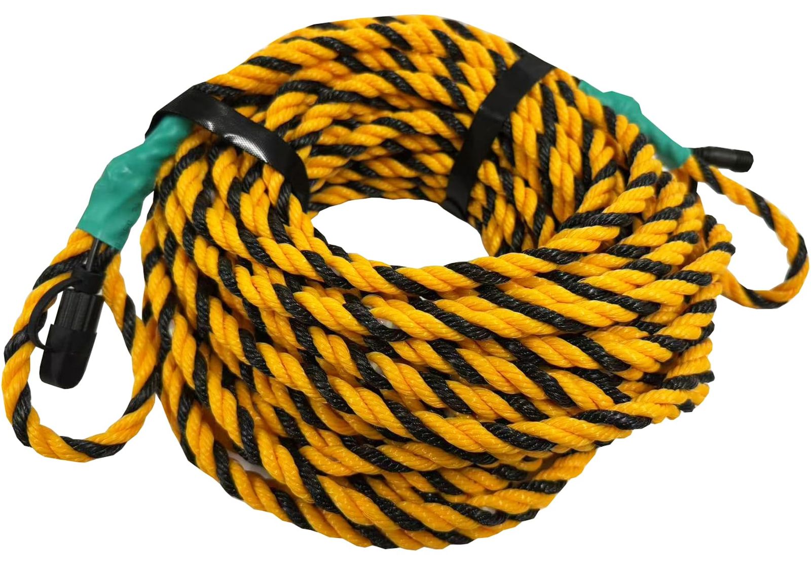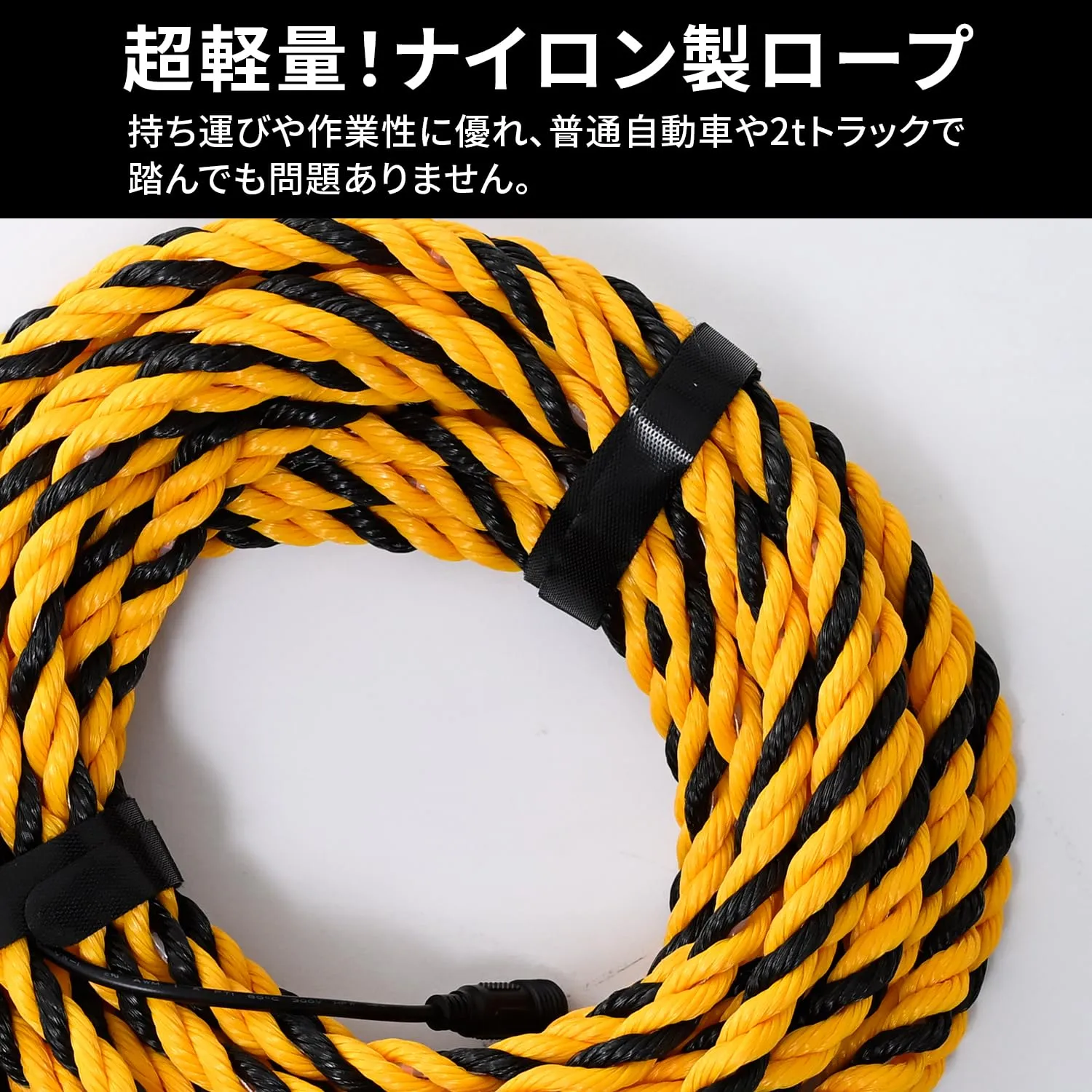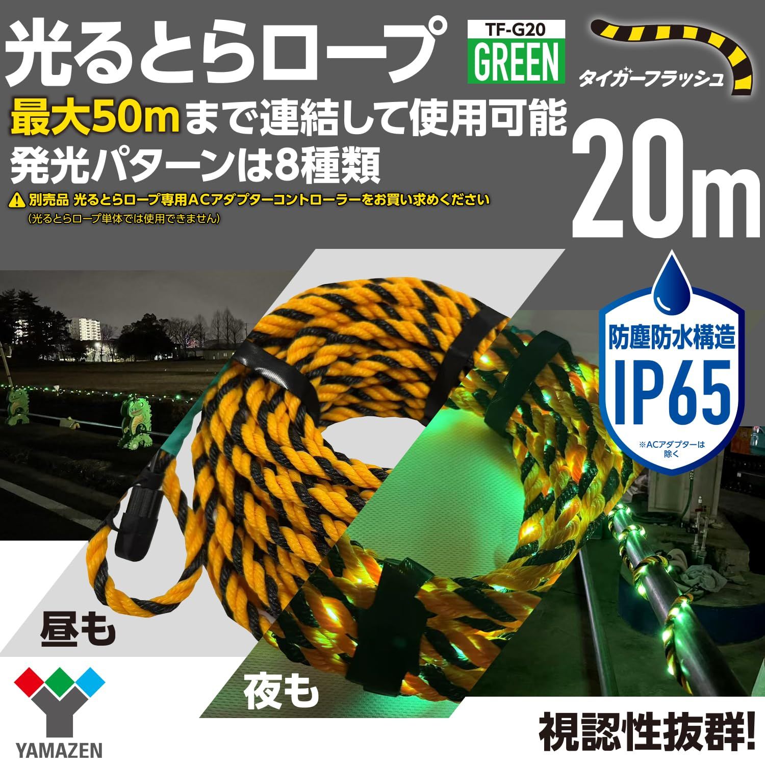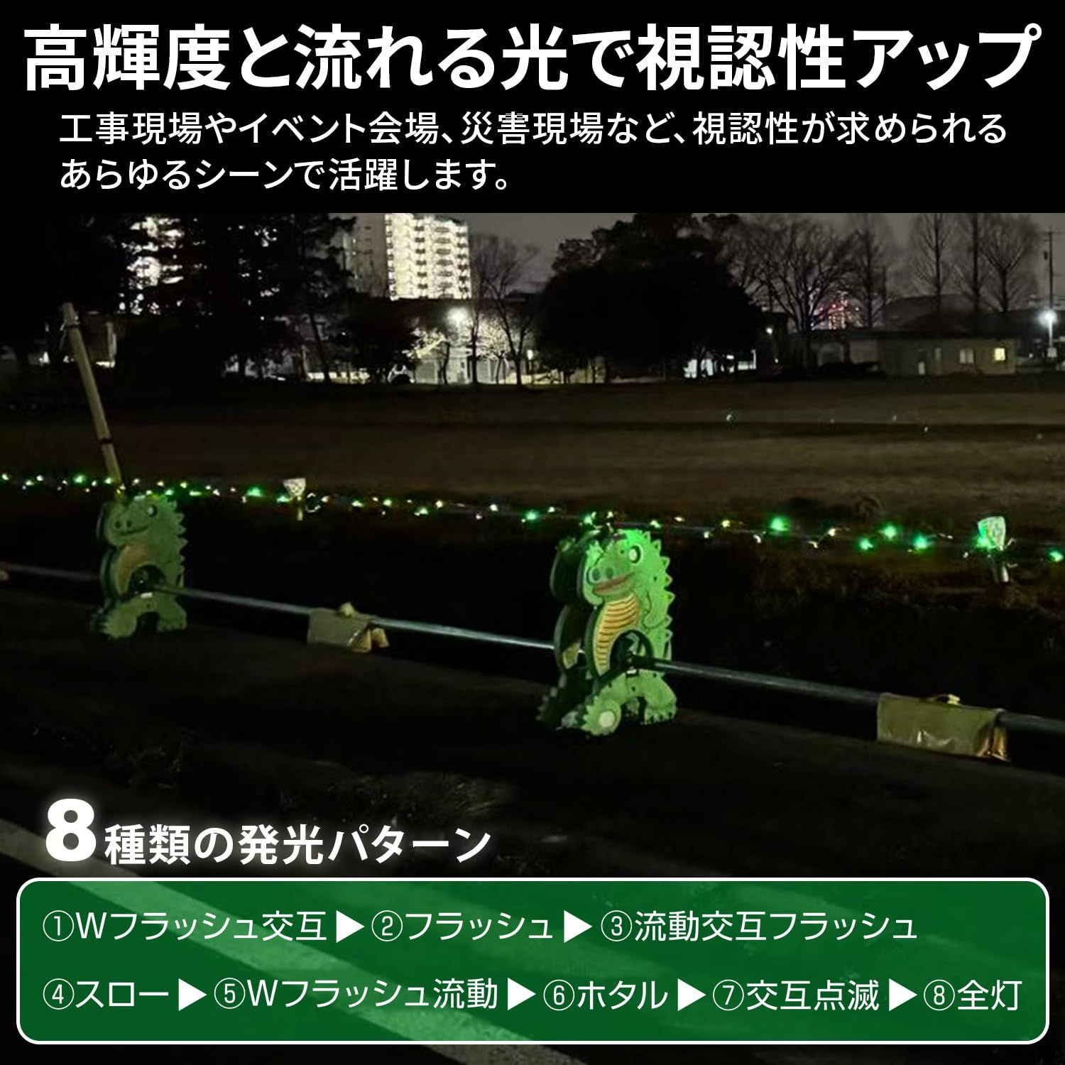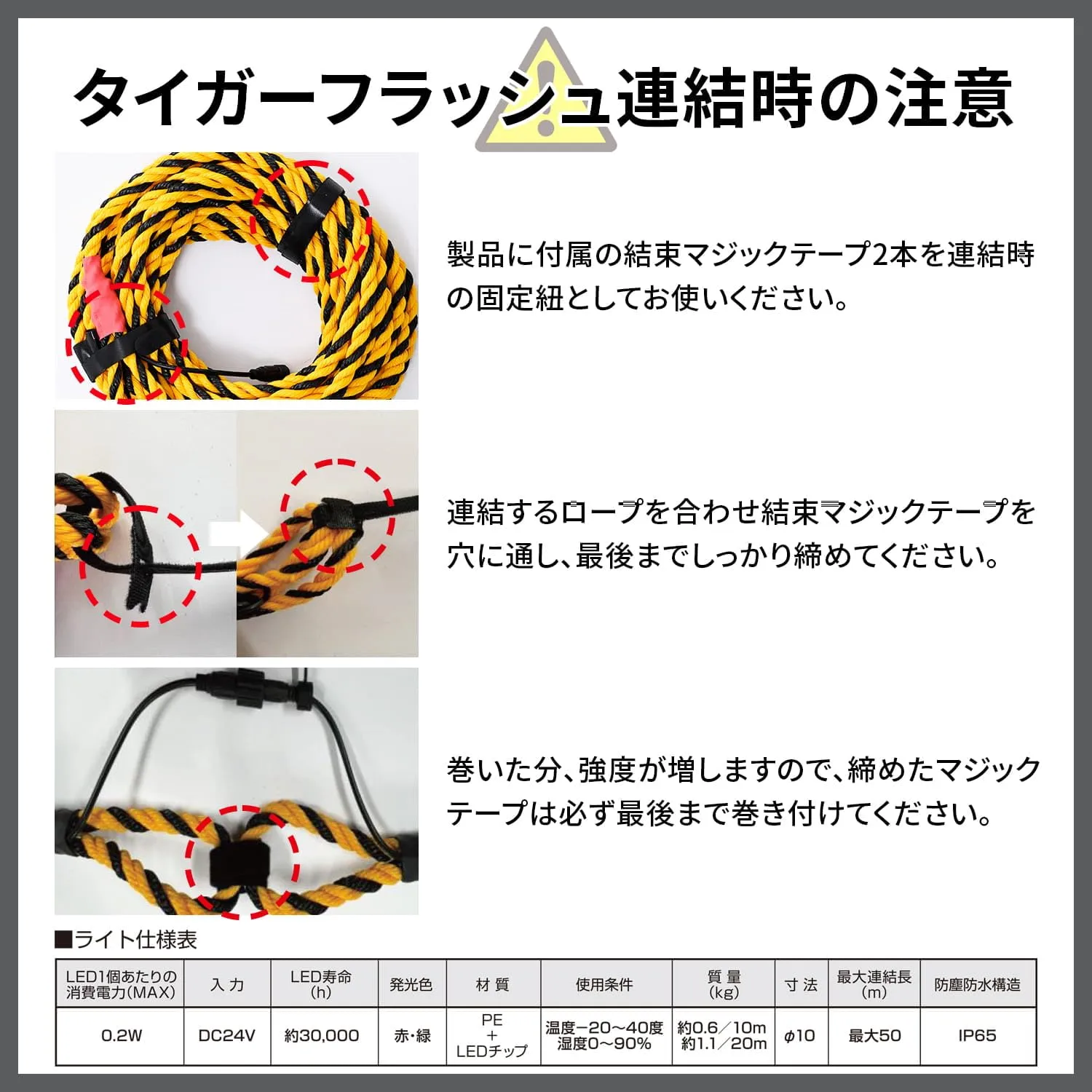 【仕様】本体サイズ:幅23×奥行23×高さ10.5cm/ロープ長さ20m/ロープ径Φ10mm/重量:1.1kg/カラー:黒×黄/入力:DC24V/LDE寿命:約30000h/発光色:緑/材質:PE+LEDチップ/最大連結長:50m/IP65