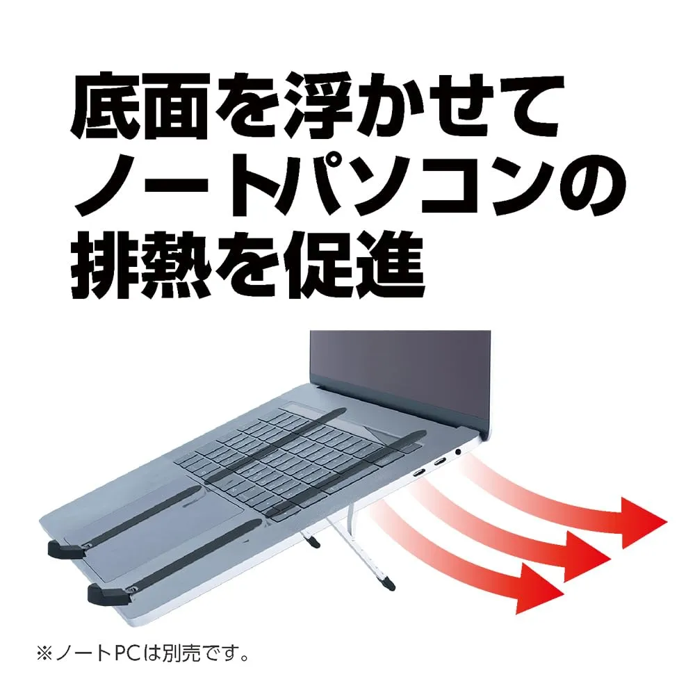 排熱ポートのある底面を浮かせる事により、通気性を確保し、ノートパソコンの熱暴走や熱による負荷を軽減します。