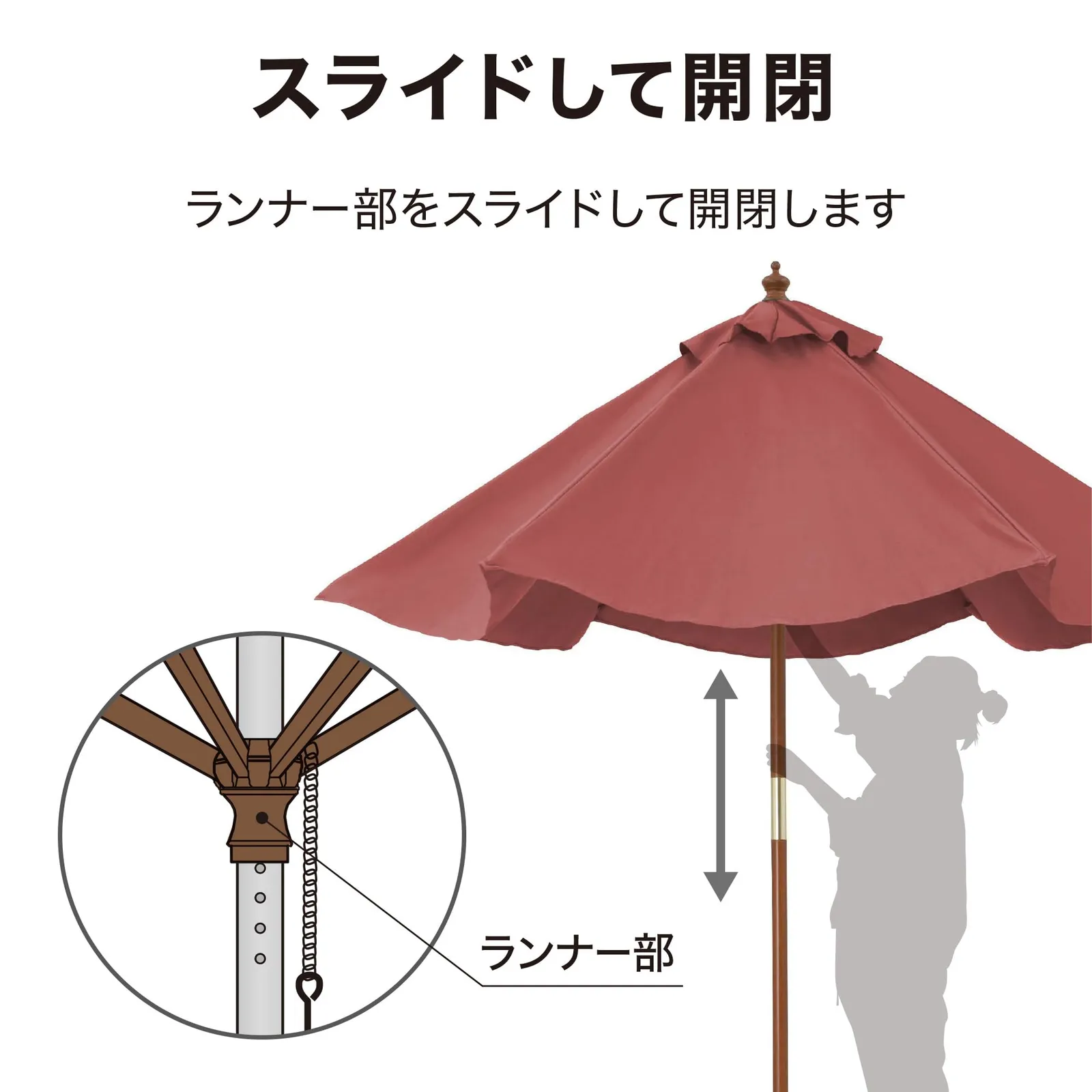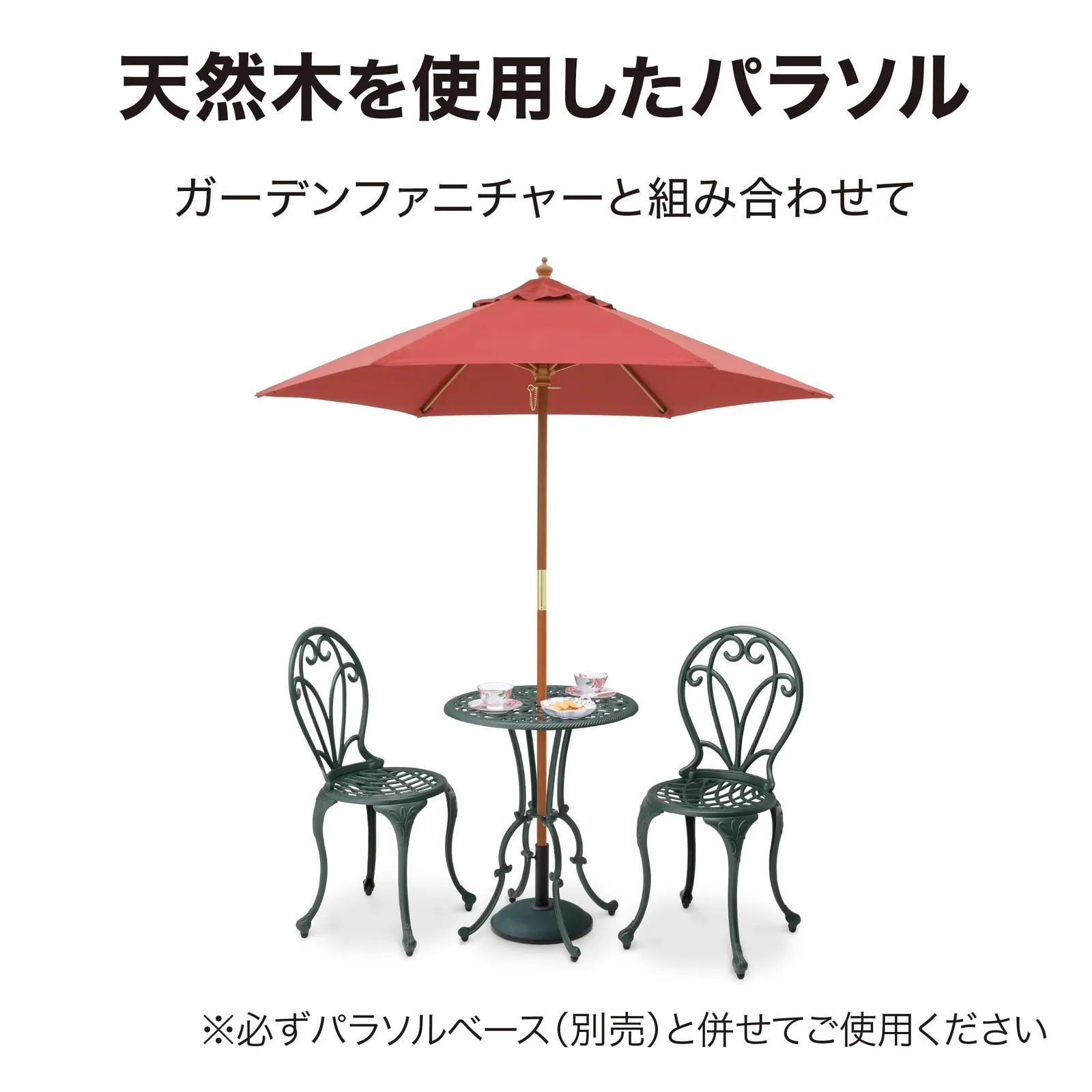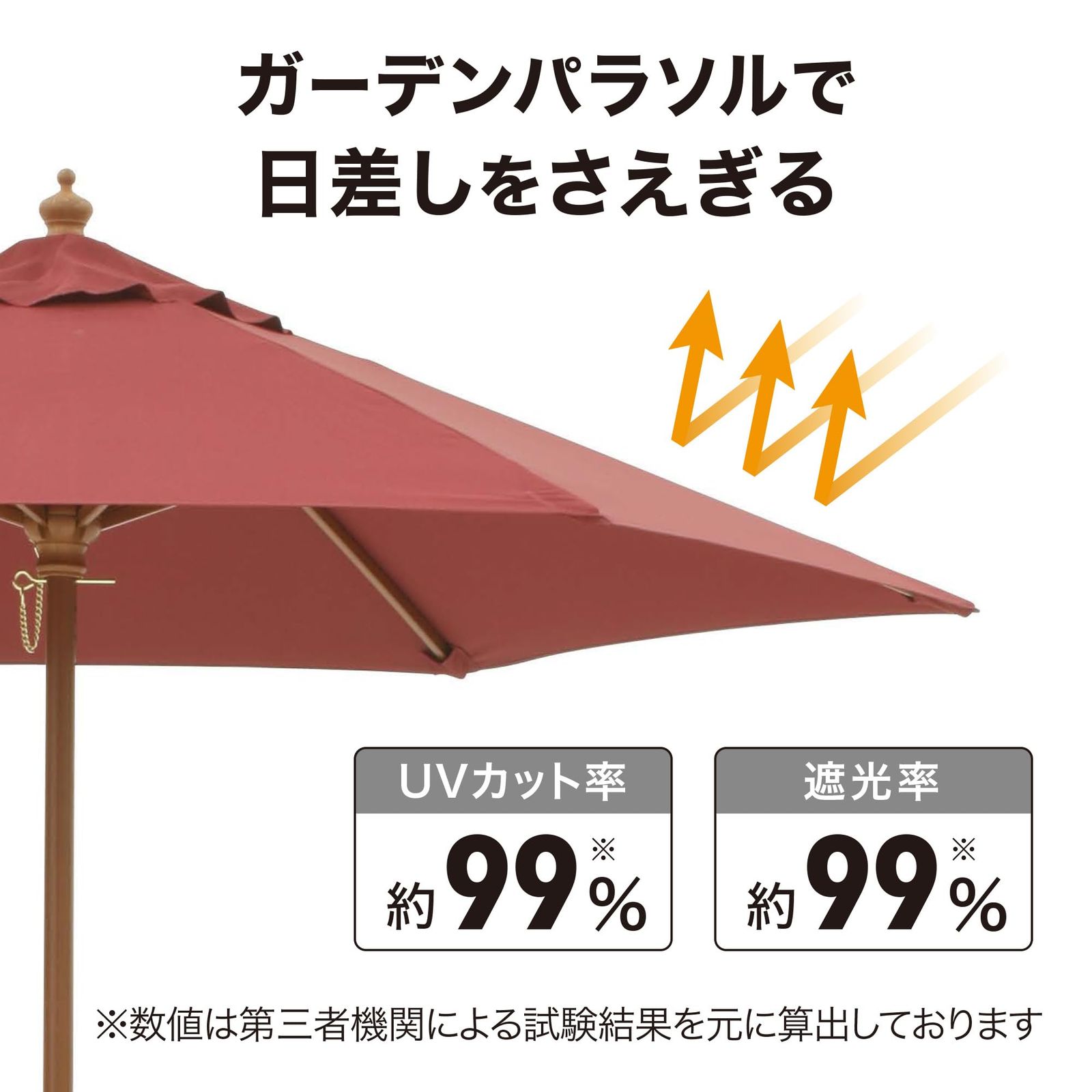 天然木を使用したガーデンパラソル。支柱は天然木、パラソル生地はポリエステルで、紫外線を約99%カット。撥水加工を施しています。※撥水加工を施しておりますが長時間水に濡れた状態では水が染み込むことがあります。生地に防水性はありません。