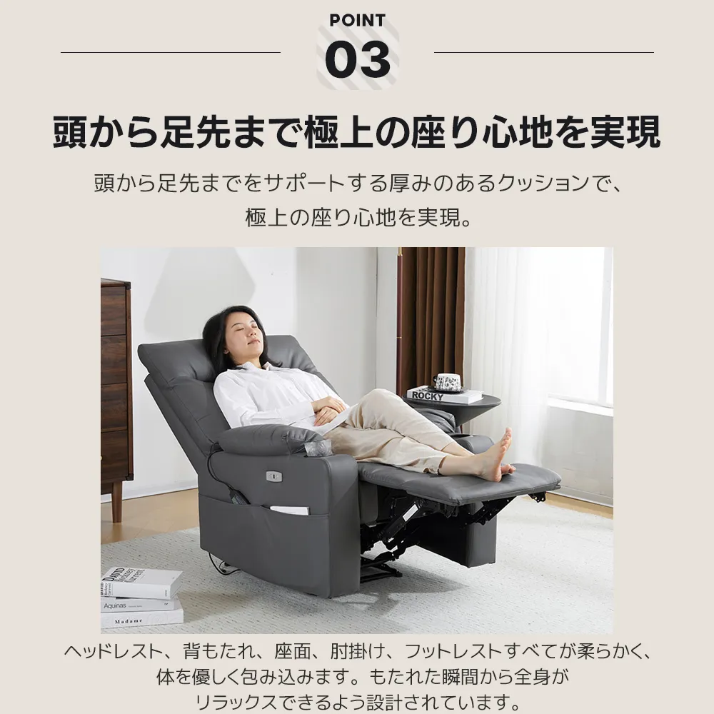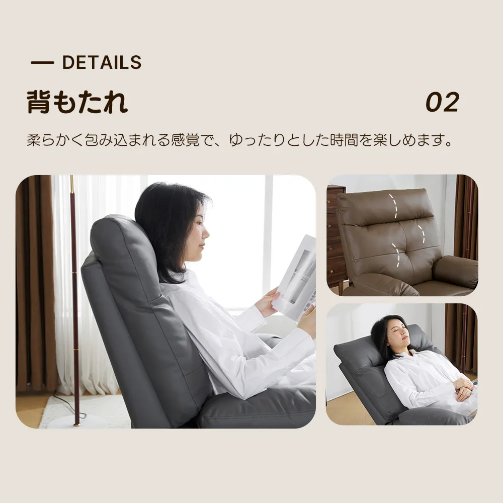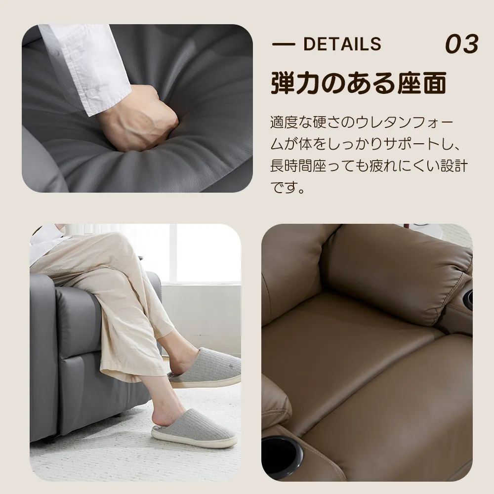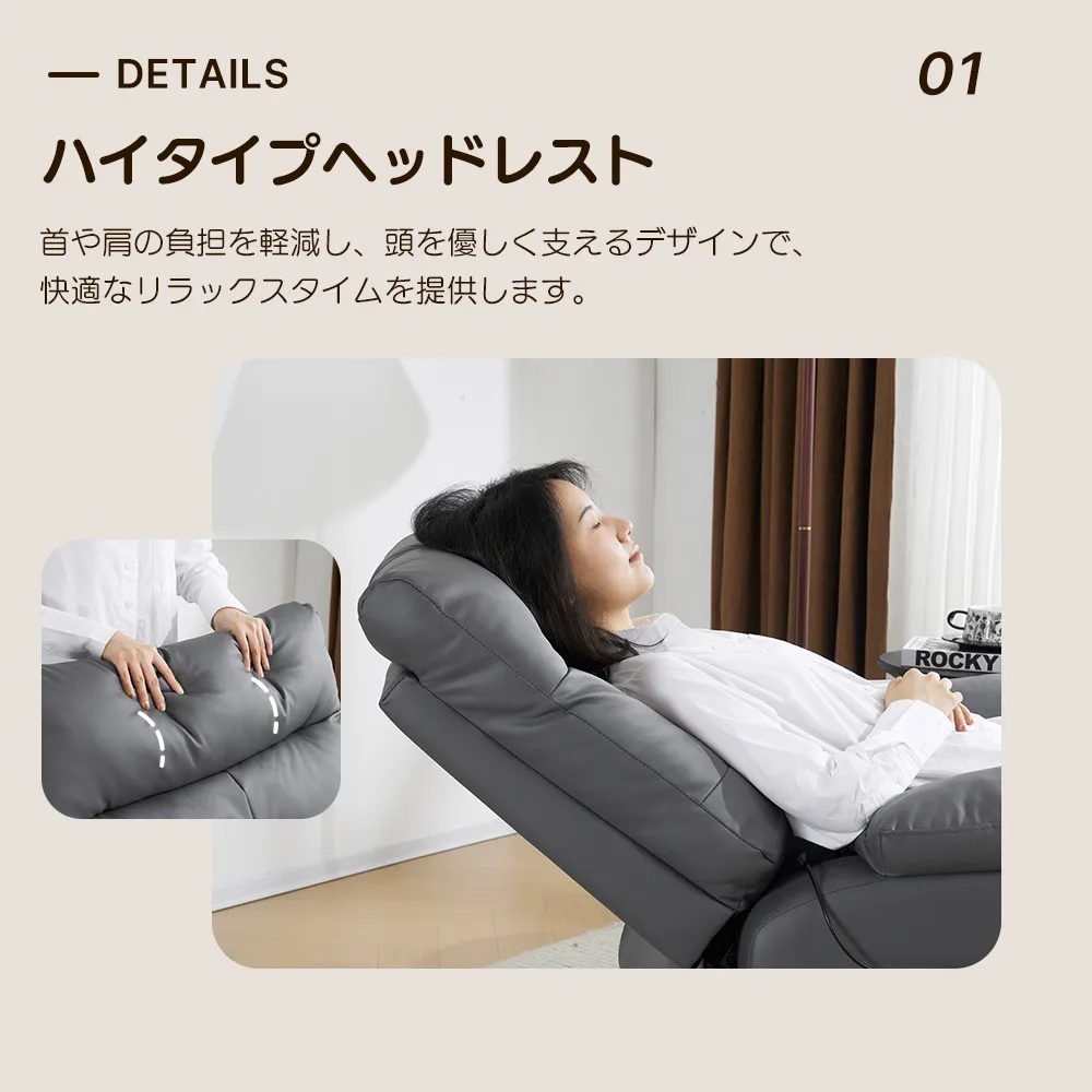 ◆01快適なリクライニングソファで至福のひとときをふんわりとしたクッションが全身を包み込み、深いリラックス効果をもたらします。長時間座っても疲れにくく、やさしいサポートがあなたの体を癒します。