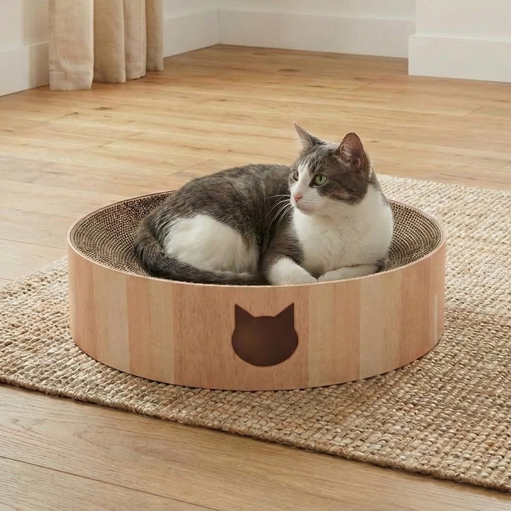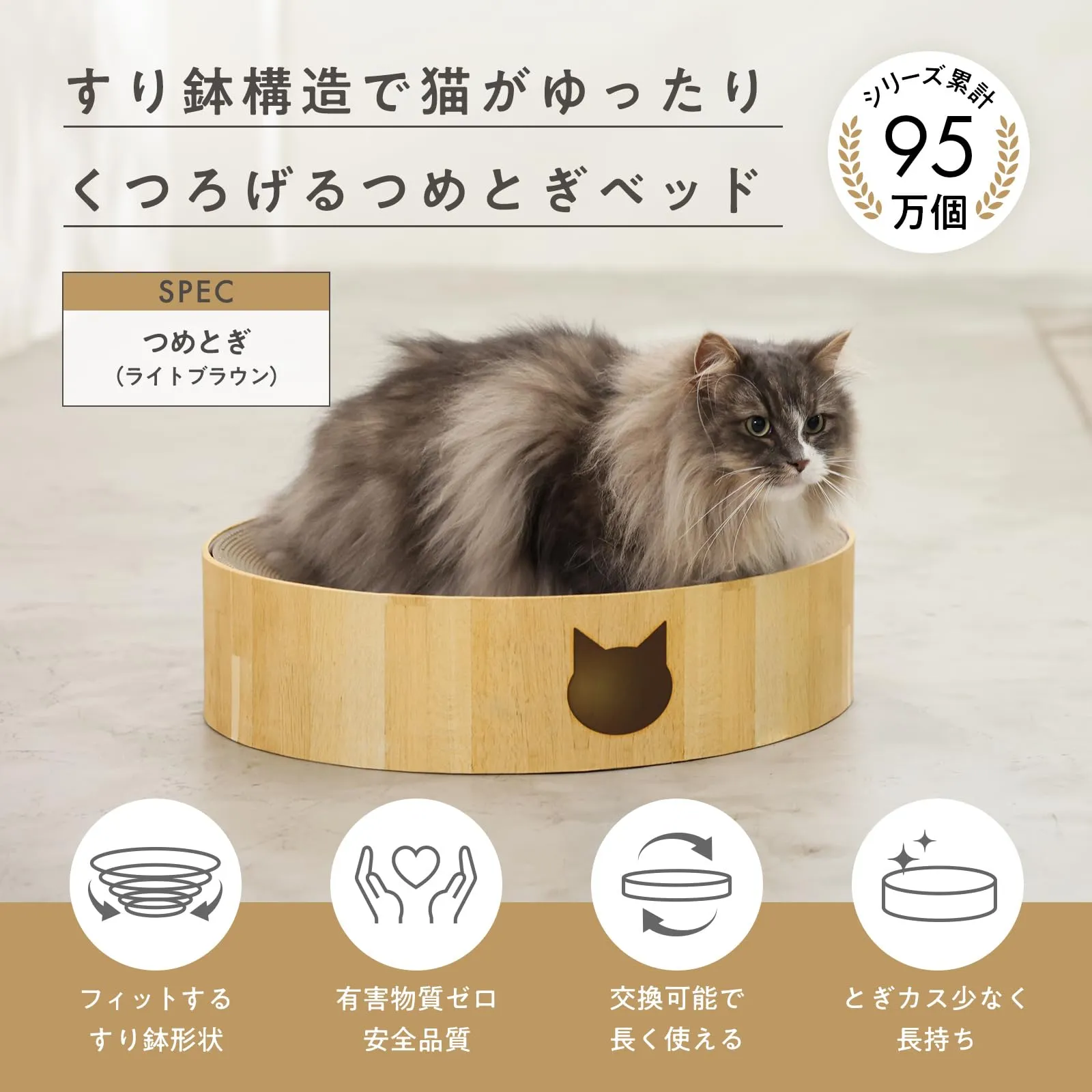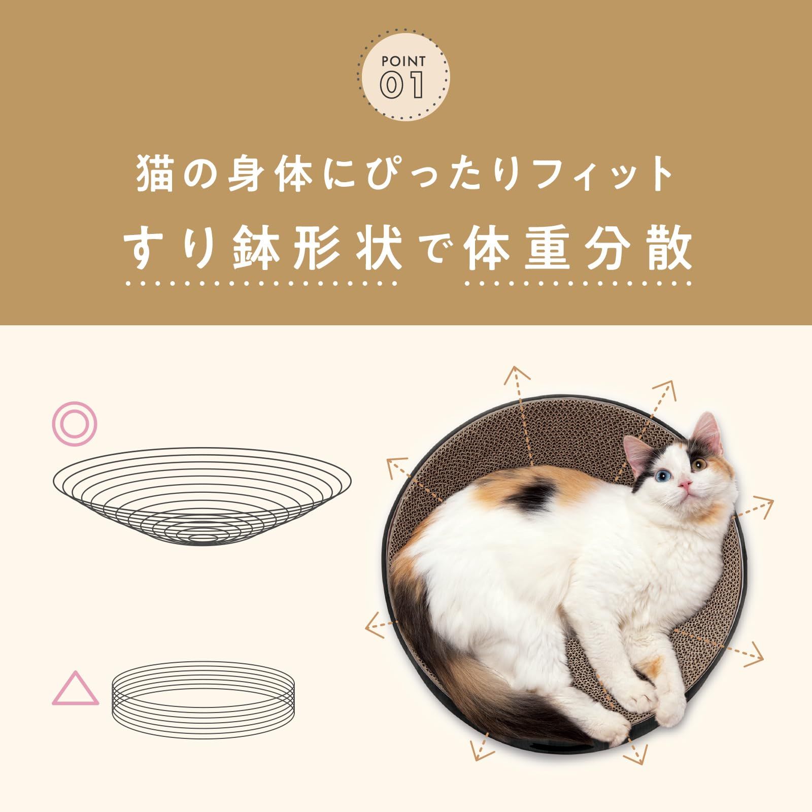 大きな猫ものびのび、寝てよし、研いでよし。猫のからだにフィットする丸型&すり鉢構造。爪とぎ部分は交換可能。