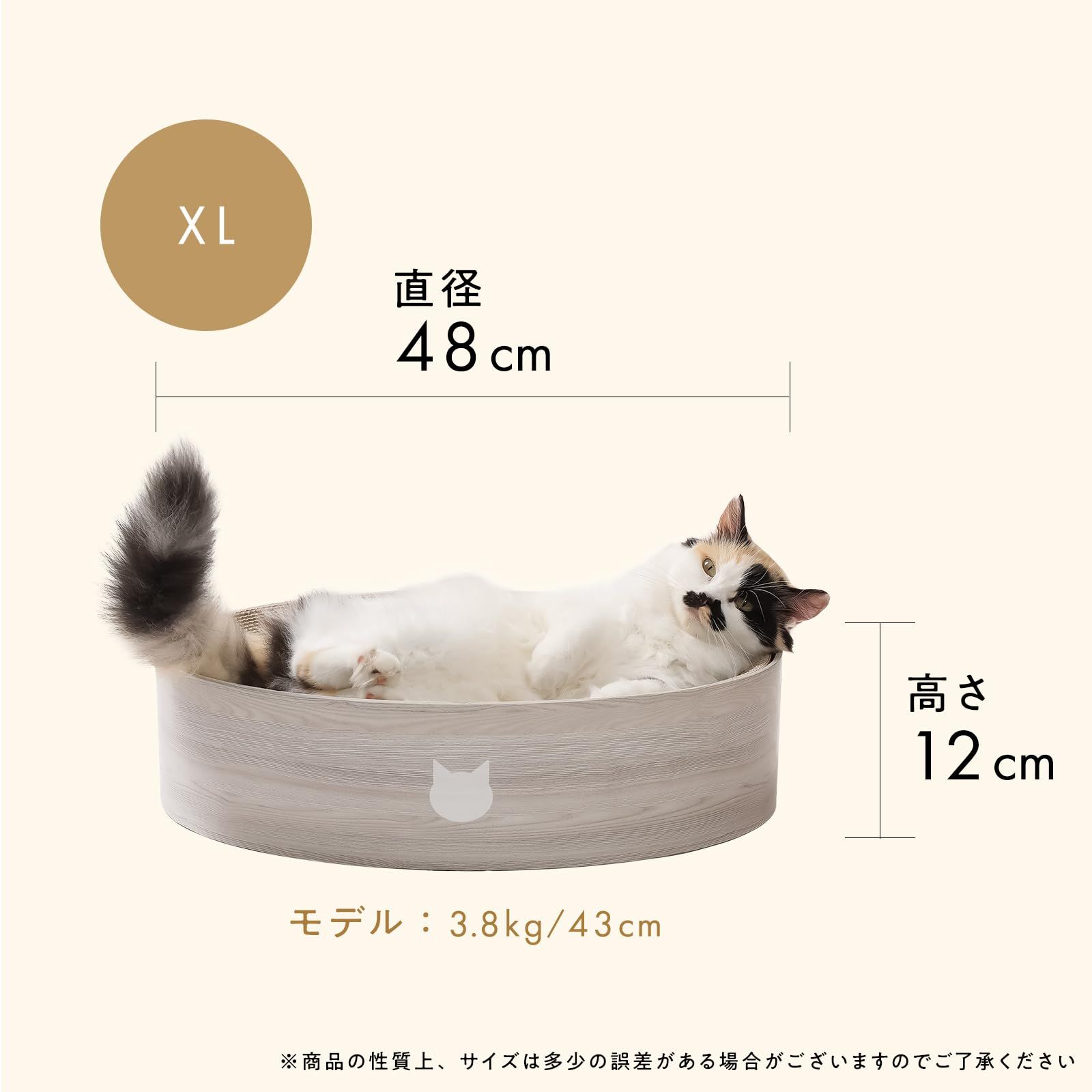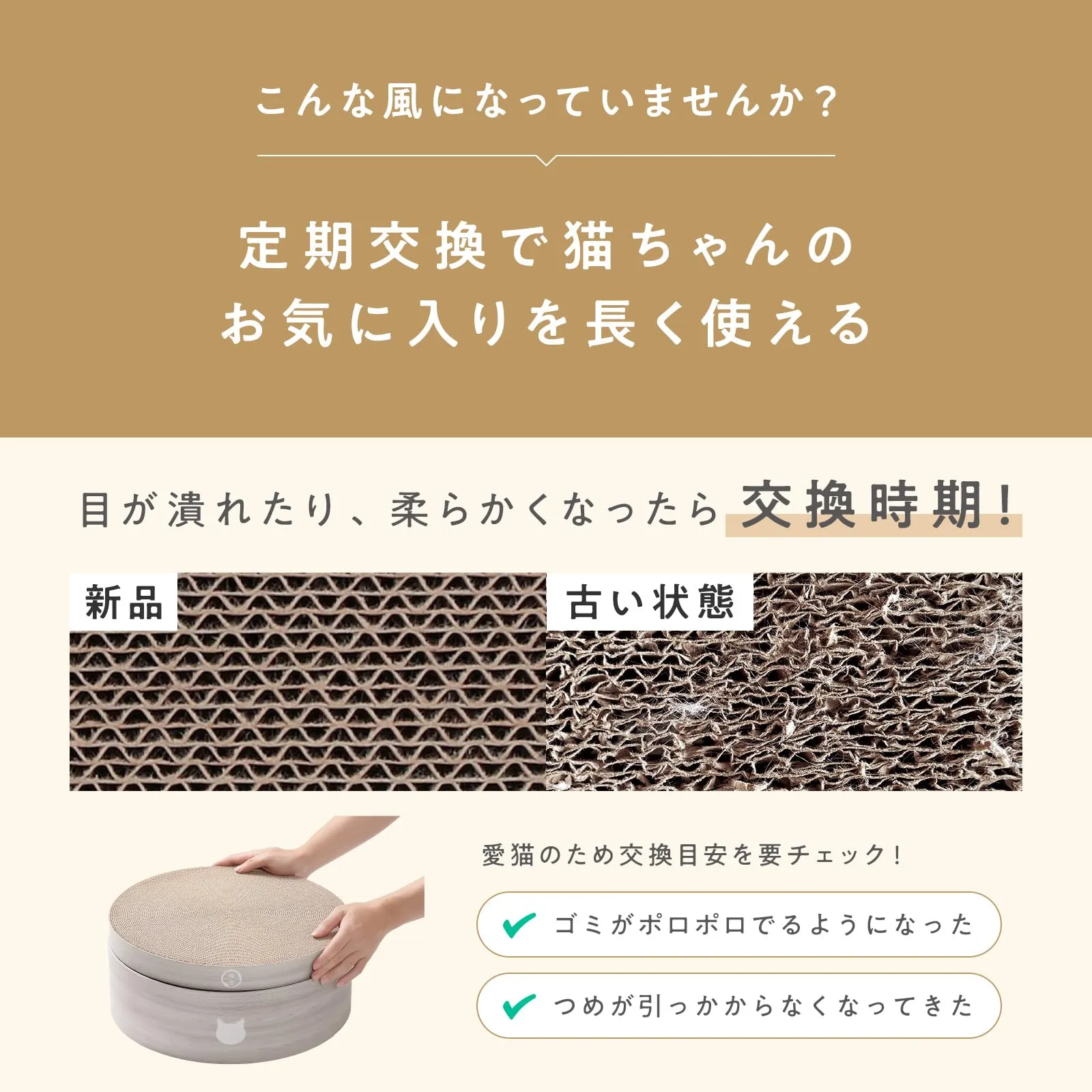 大きな猫ものびのび、寝てよし、研いでよし。猫のからだにフィットする丸型&すり鉢構造。体重6kg超えの大きな猫でものびのび使える嬉しいサイズです。ベッドとしてくつろいだり、爪とぎするのにピッタリ。爪とぎ部分は交換できるのでとても経済的です。