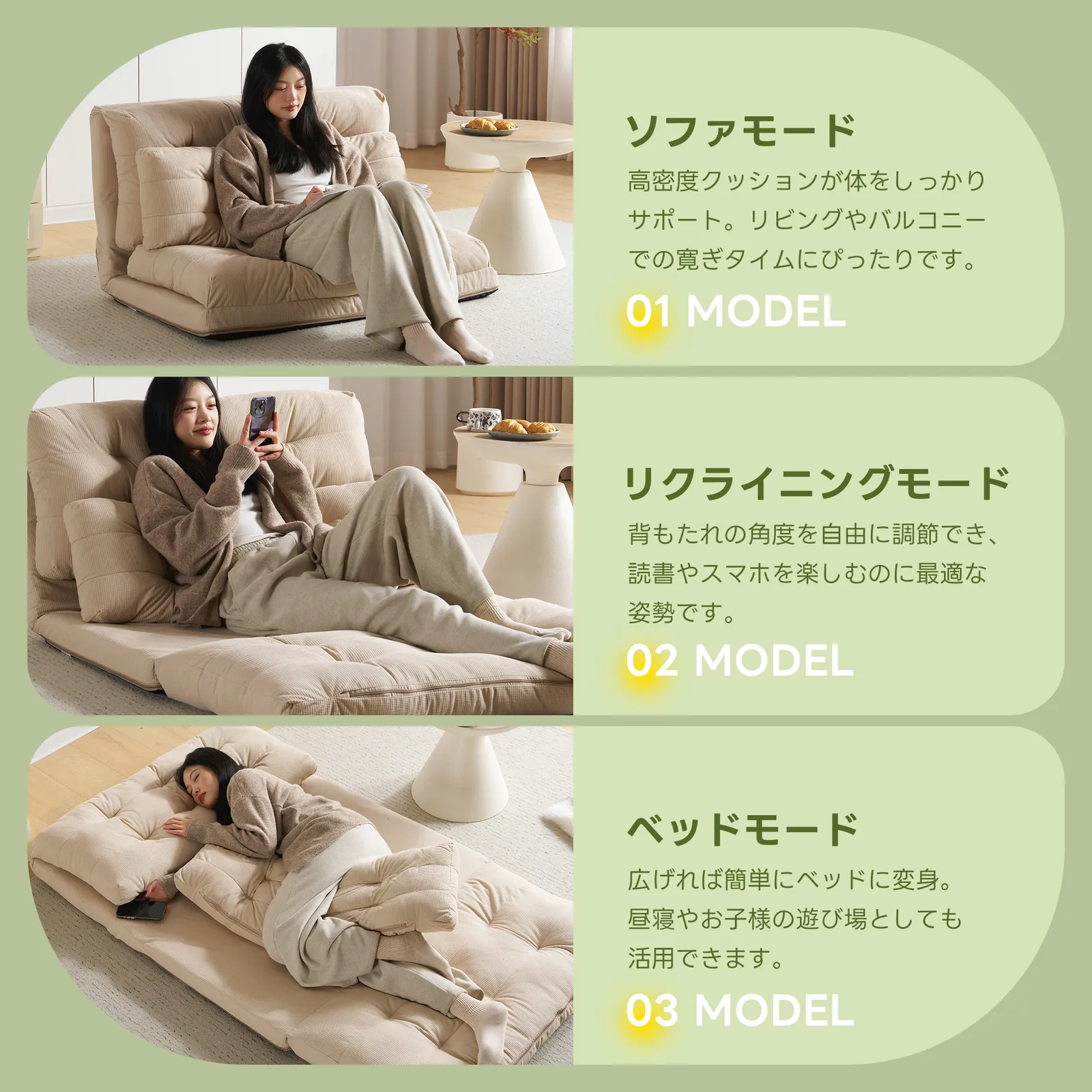 【変幻自在に 自分好みの角度に】背面には6段階のリクライニング調節機能付き。細かな調節が可能なので、体勢に合わせてベストな角度で、ゆっくりと寛げます。さらにソファ時は座面を重ねてボリュームUP。上部のクッションは座った時のふかふか感や気持ちよさを追求。下部のクッションは少し硬めでより長く使用していただく為の 土台の役目を果たします。異なる硬さに設定したことで絶妙な座り心地、寝心地を実現しました。映画鑑賞などのゆったりしたい時はカウチスタイル、急な来客時などは簡易ベッドとして、様々なシーンに活躍します。ソファスタイルでもダブルクッションでゆったりと寛げいただけます。
