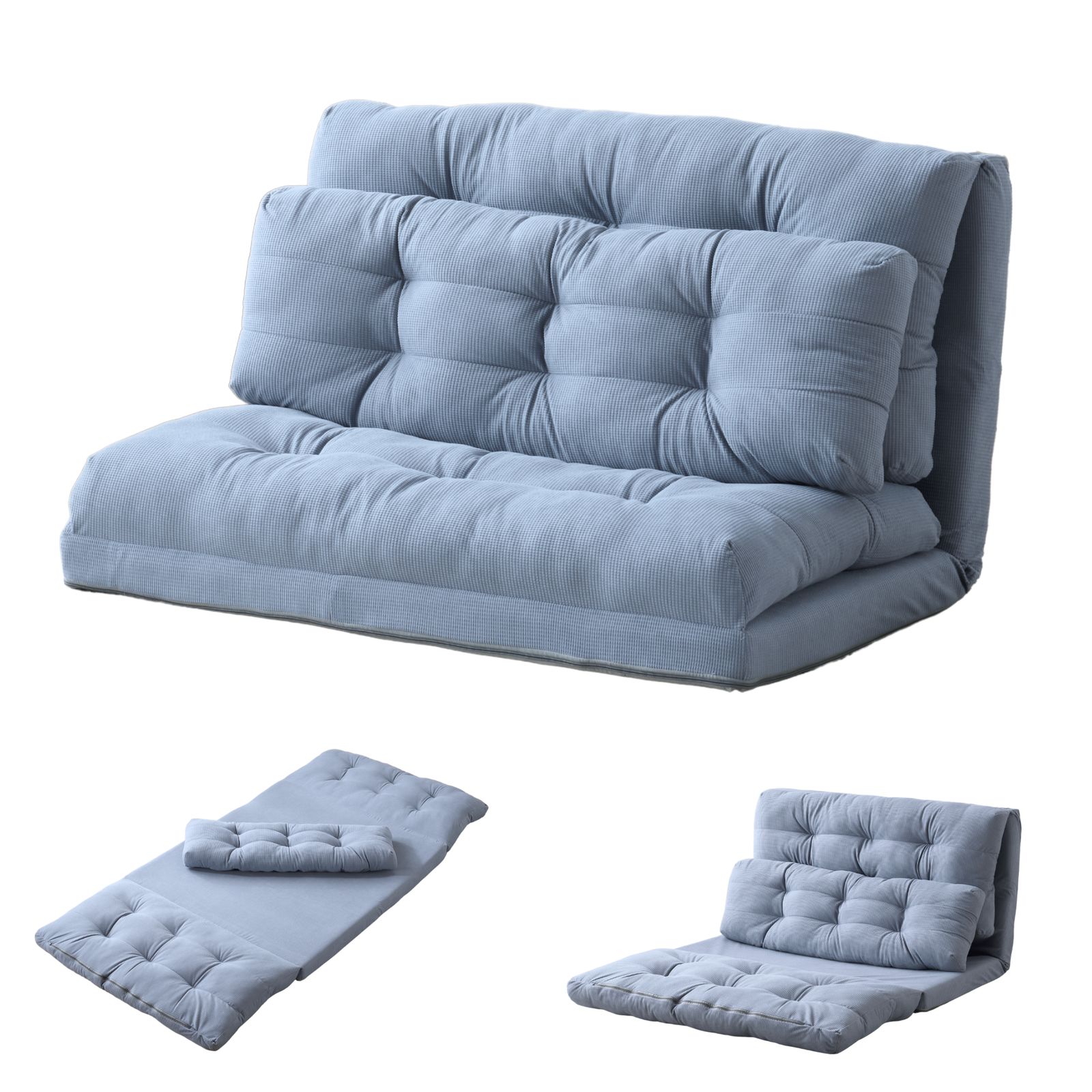 【広々寛げるでも、コンパクトソファベッド】横幅はシングルサイズ103cm。1人でゆったり寛ぐちょうど良いサイズ感です。リクライニングを倒してベッドして使えば、ゆったりサイズのローベッドとして使えます。座面のクッションを広げるだけで、ゆったり寛げるカウチソファに早変わり。急な来客ベッドに変えれば安心。クッションも付いているので枕としてご利用いただけます。張り地には厳選したファブリック生地を採用。サラサラの触り心地なので ベタつかずオールシーズンお使いいただけます。