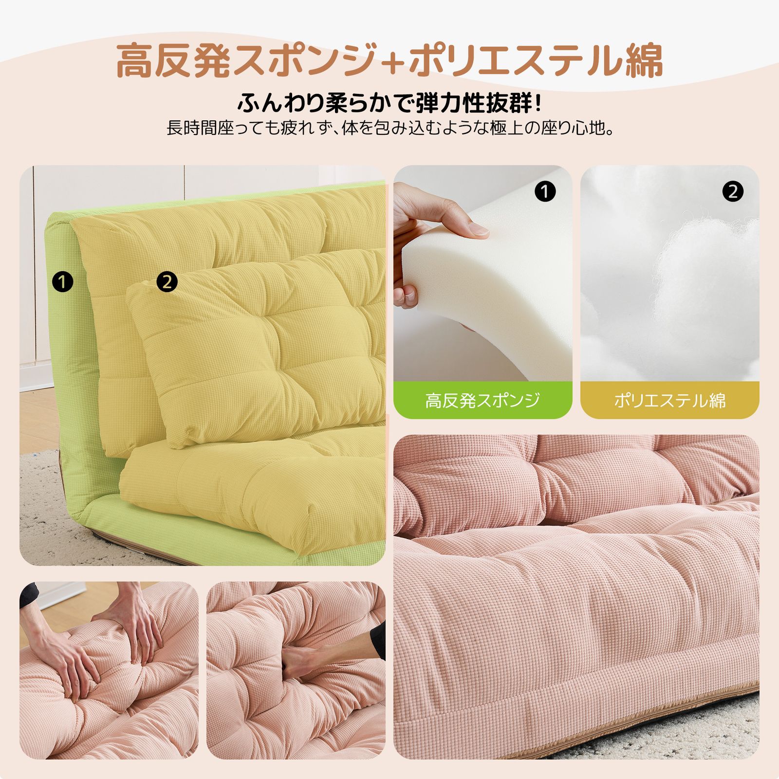 【安定性と快適性を兼ねた構造】座面にはもっちりふかふか圧倒されそうなボリューム感を使い、適度な弾力とクッション性を持たせながら、ベッドとしての使用でも約150kgの耐荷重があるので安全にご使用いただけます。女性の方でもらくらく移動可能。