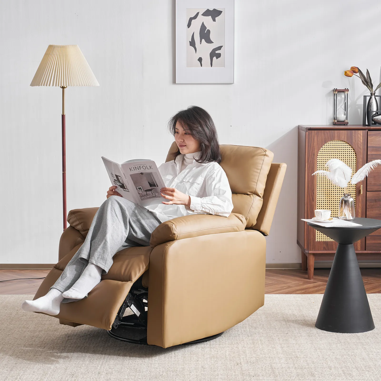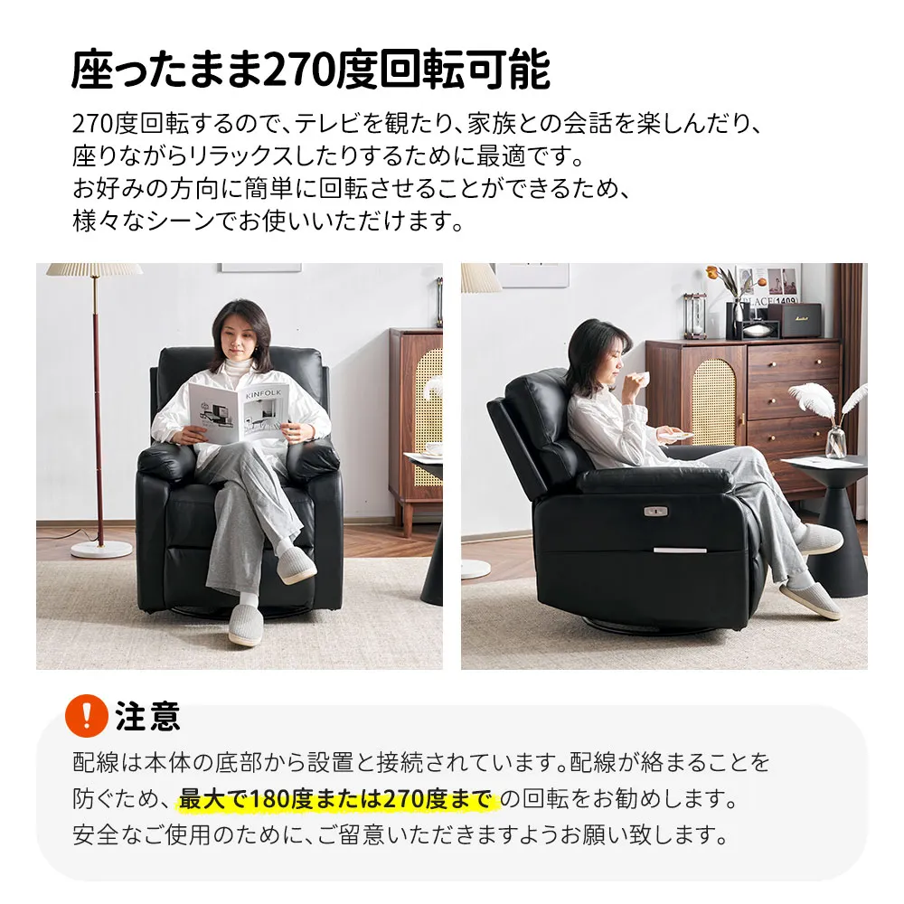・270度回転するので、テレビを観たり、家族との会話を楽しんだり、座りながらリラックスしたりするために最適です。お好みの方向に簡単に回転させることができるため、様々なシーンでお使いいただけます。
