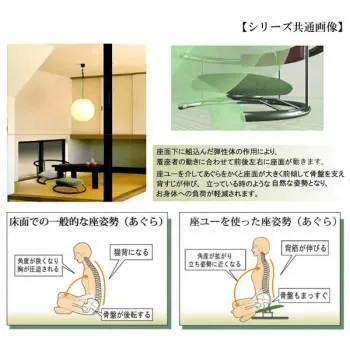 座面下に組み込んだ弾性体の作用により、着座者の動きに合わせて前後左右に座面が動きます。座ユーを介してあぐらをかくと、立っている時のような自然な姿勢となり、お身体への負担が軽減されます。