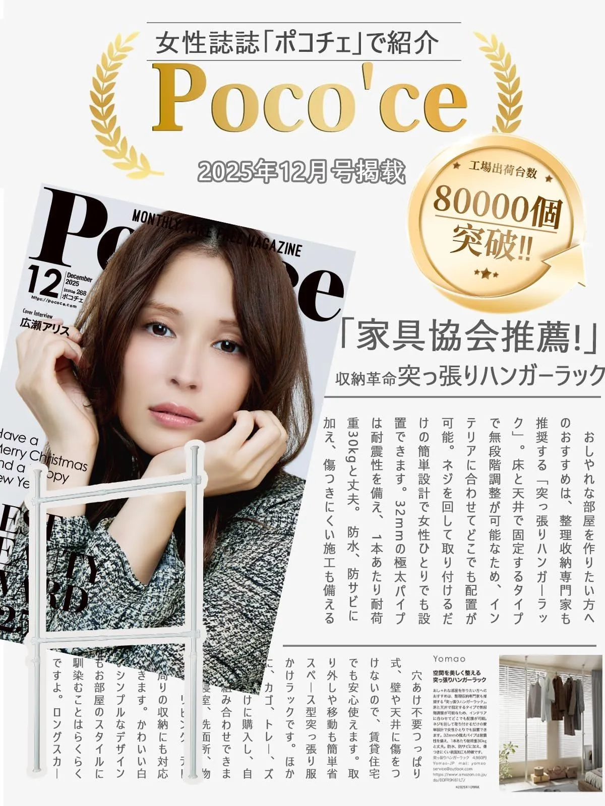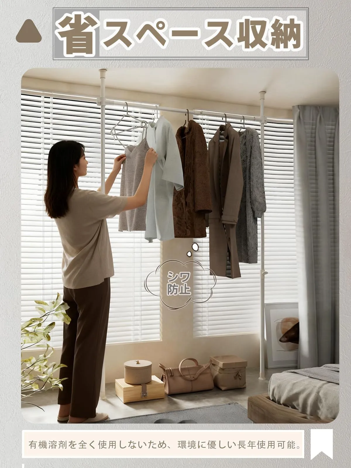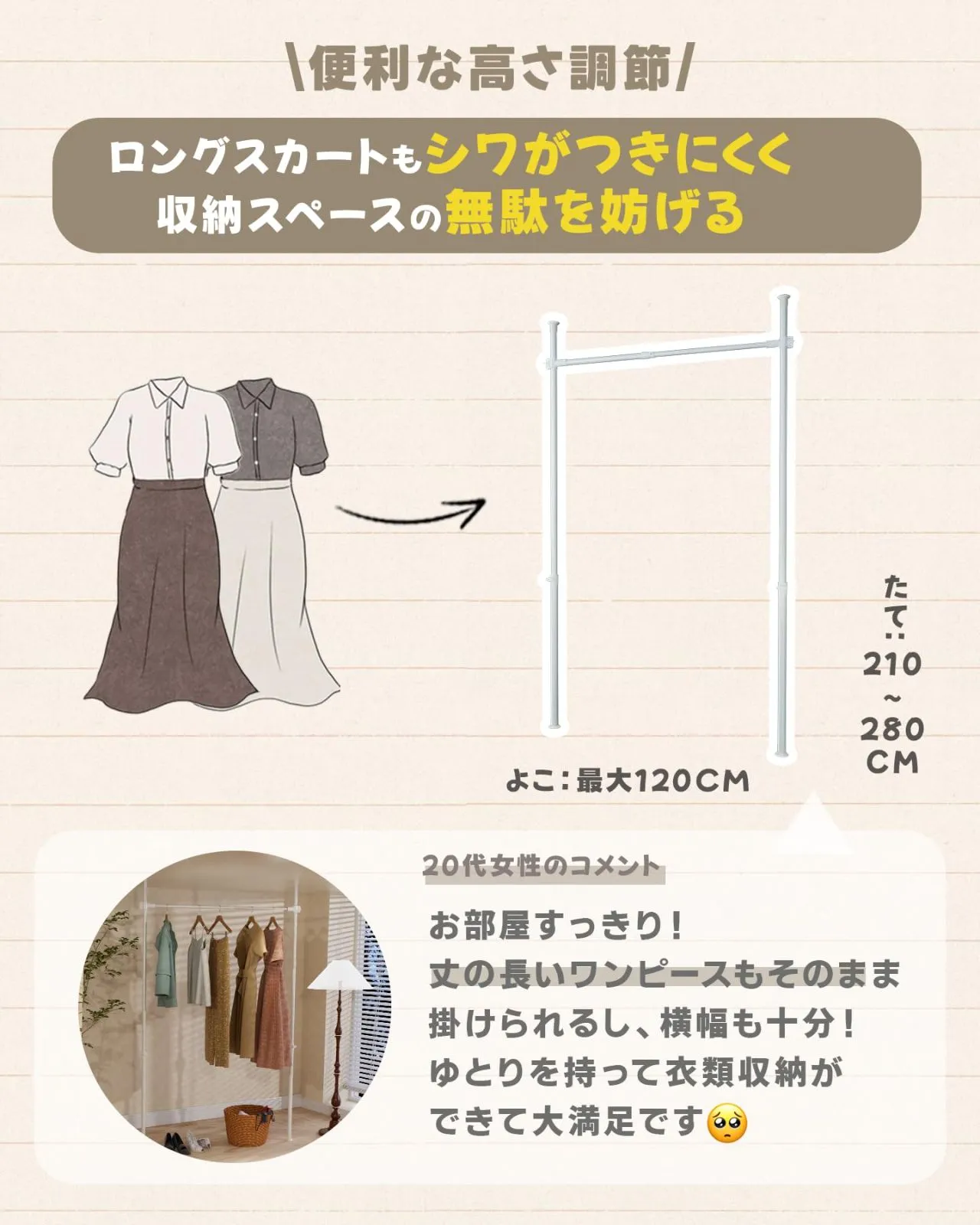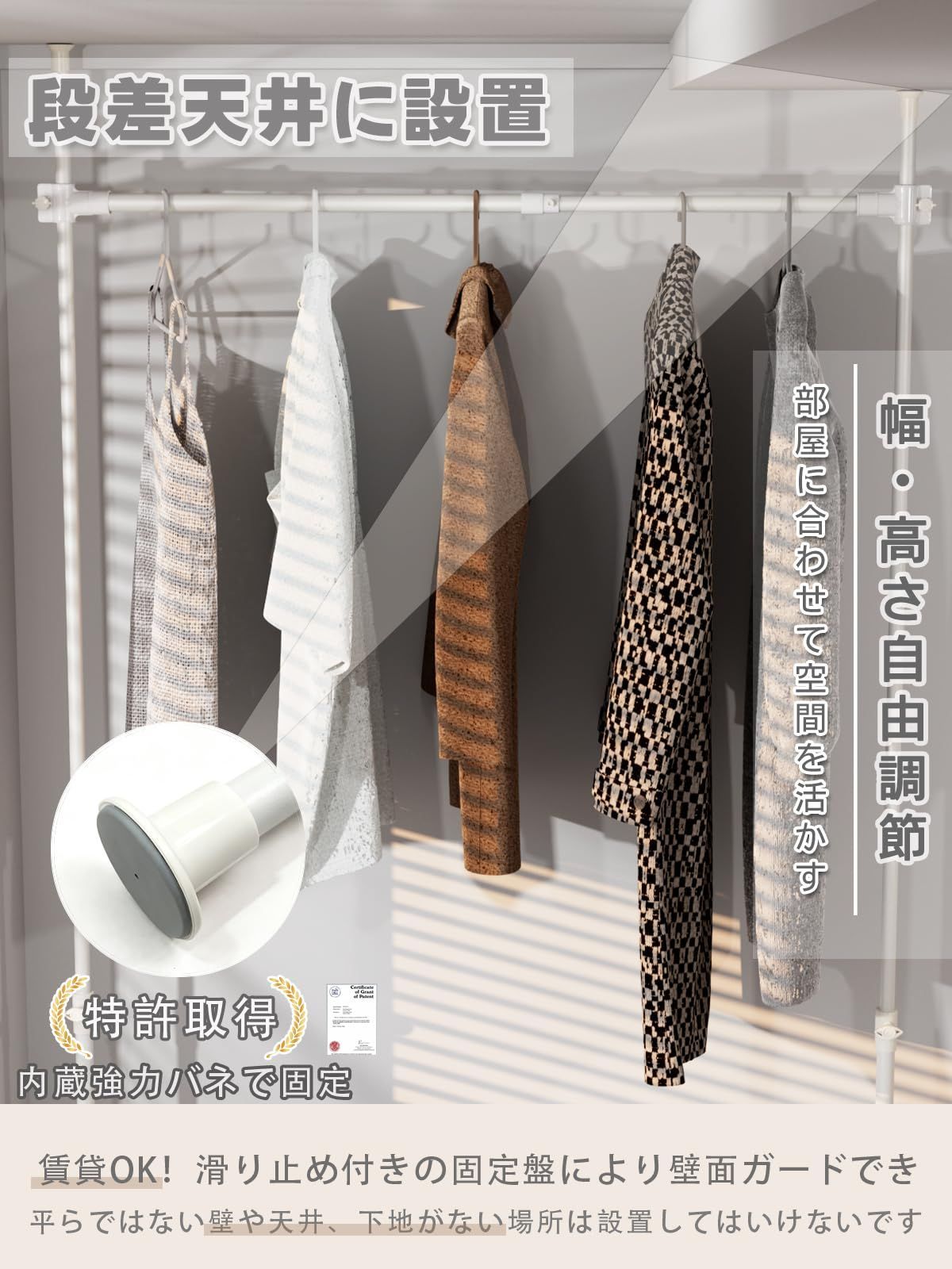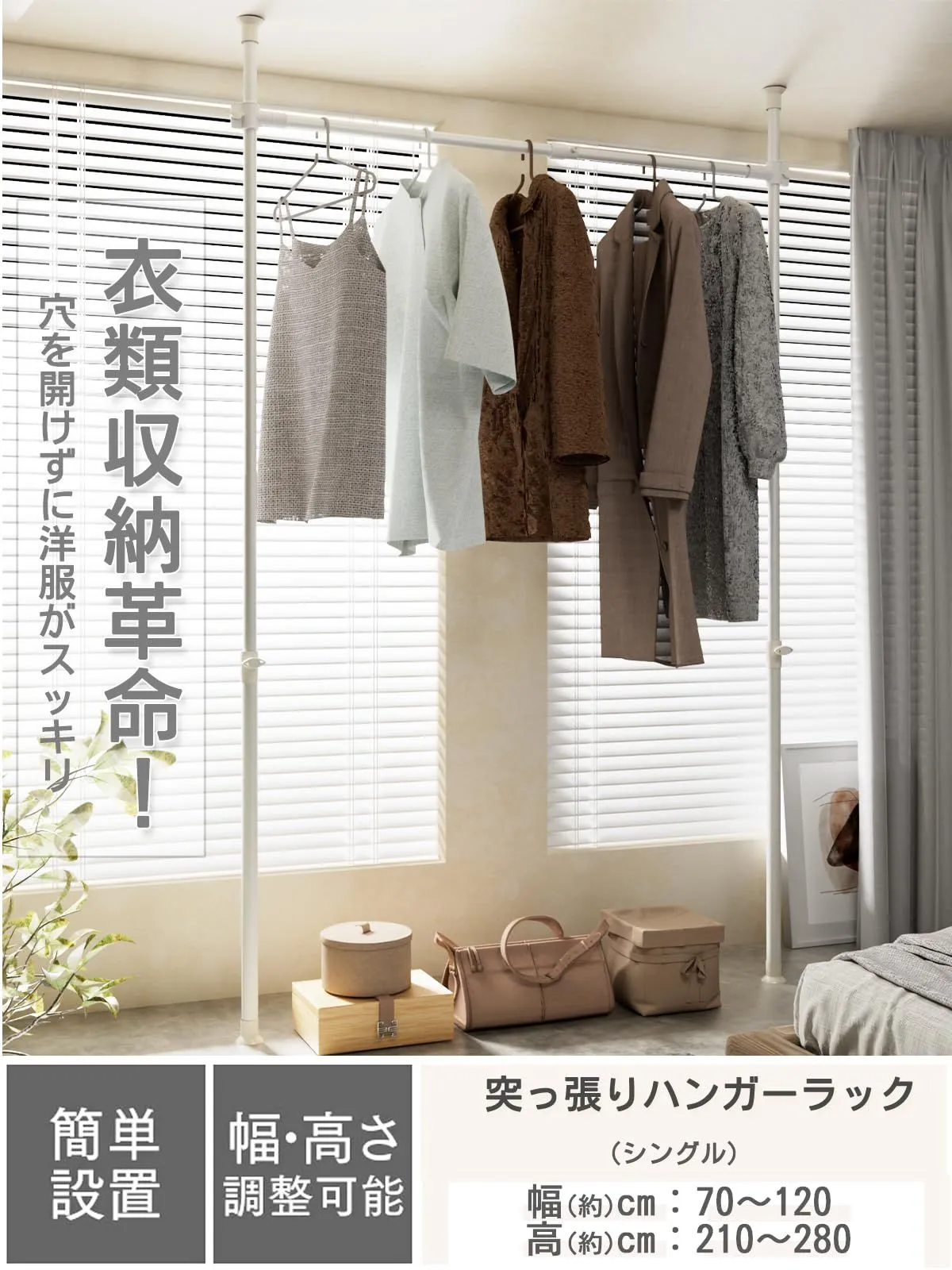 【省スペース収納】ハンガー部1段あり、つっぱり式デザインなので縦の空間を有効活用。床の掃除もしやすい。最大幅 120cmで、全体収納目安:夏服 約60着 / 冬服 約30着。