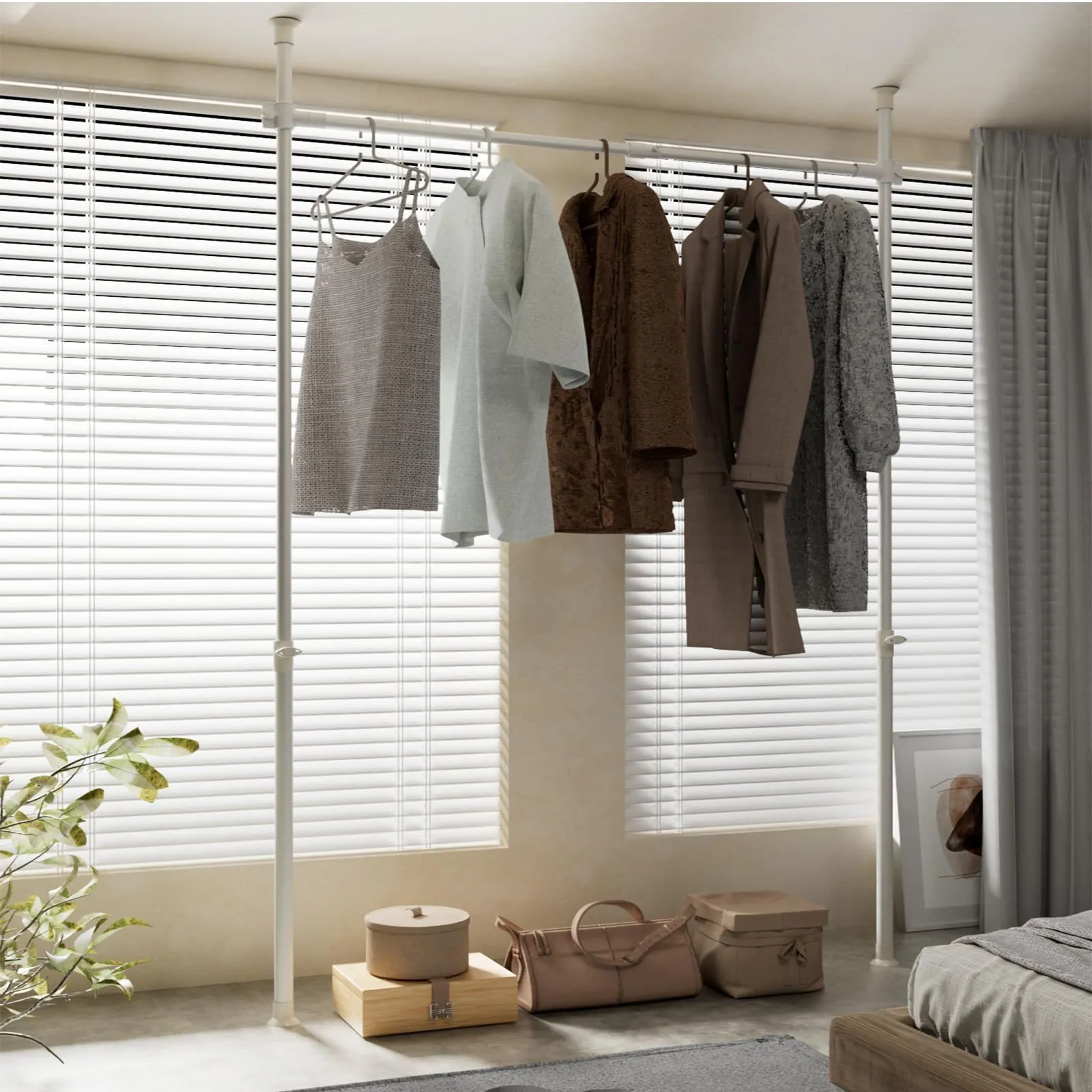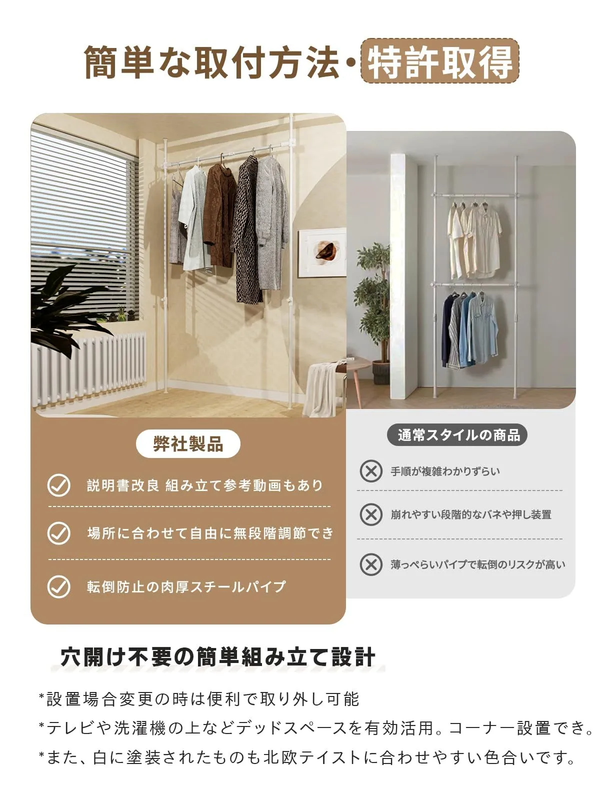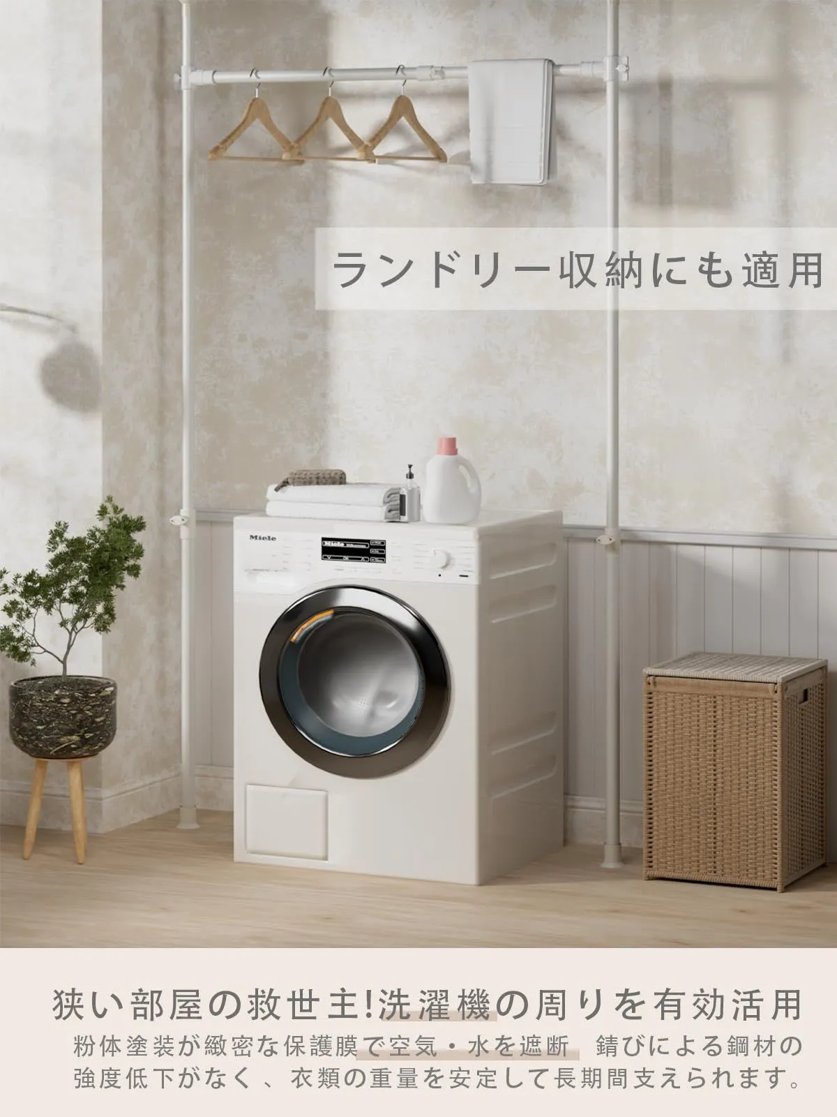 【多シーン対応の自由な DIY 組み合わせ】 市販カゴ、トレー、ズボン掛け、ポール、棚板などを単品で購入し、自由に組み合わせ可能。ランドリー収納、部屋物干しにも対応できる突っ張りハンガーラック(洋服ラック)です。